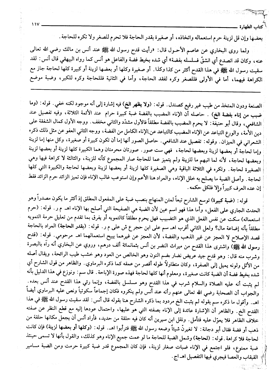بَعْضُهَا وَإِنْ قَلَّ لِزِينَةٍ حَرُمَ اسْتِعْمَالُهُ وَاِتِّخَاذُهُ، أَوْ صَغِيرَةً بِقَدْرِ الْحَاجَةِ فَلَا تَحْرُمُ لِلصِّغَرِ وَلَا تُكْرَهُ لِلْحَاجَةِ. وَلِمَا رَوَى الْبُخَارِيُّ عَنْ عَاصِمٍ الْأَحْوَلِ قَالَ: «رَأَيْت قَدَحَ رَسُولِ اللَّهِ - صَلَّى اللَّهُ عَلَيْهِ وَسَلَّمَ - عِنْدَ أَنَسِ بْنِ مَالِكٍ - رَضِيَ اللَّهُ تَعَالَى عَنْهُ -، وَكَانَ قَدْ انْصَدَعَ أَيْ انْشَقَّ فَسَلْسَلَهُ بِفِضَّةٍ» أَيْ شَدَّهُ بِخَيْطِ فِضَّةٍ وَالْفَاعِلُ هُوَ أَنَسٌ كَمَا رَوَاهُ الْبَيْهَقِيُّ قَالَ أَنَسٌ: «لَقَدْ سَقَيْت رَسُولَ اللَّهِ - صَلَّى اللَّهُ عَلَيْهِ وَسَلَّمَ - فِي هَذَا الْقَدَحِ أَكْثَرَ مِنْ كَذَا وَكَذَا» . أَوْ صَغِيرَةً وَكُلُّهَا أَوْ بَعْضُهَا لِزِينَةٍ أَوْ كَبِيرَةً كُلُّهَا لِحَاجَةٍ جَازَ مَعَ الْكَرَاهَةِ فِيهِمَا، أَمَّا فِي الْأُولَى فَلِلصِّغَرِ وَكُرِهَ لِفَقْدِ الْحَاجَةِ، وَأَمَّا فِي الثَّانِيَةِ فَلِلْحَاجَةِ وَكُرِهَ لِلْكِبَرِ، وَضَبَّةُ مَوْضِعِ