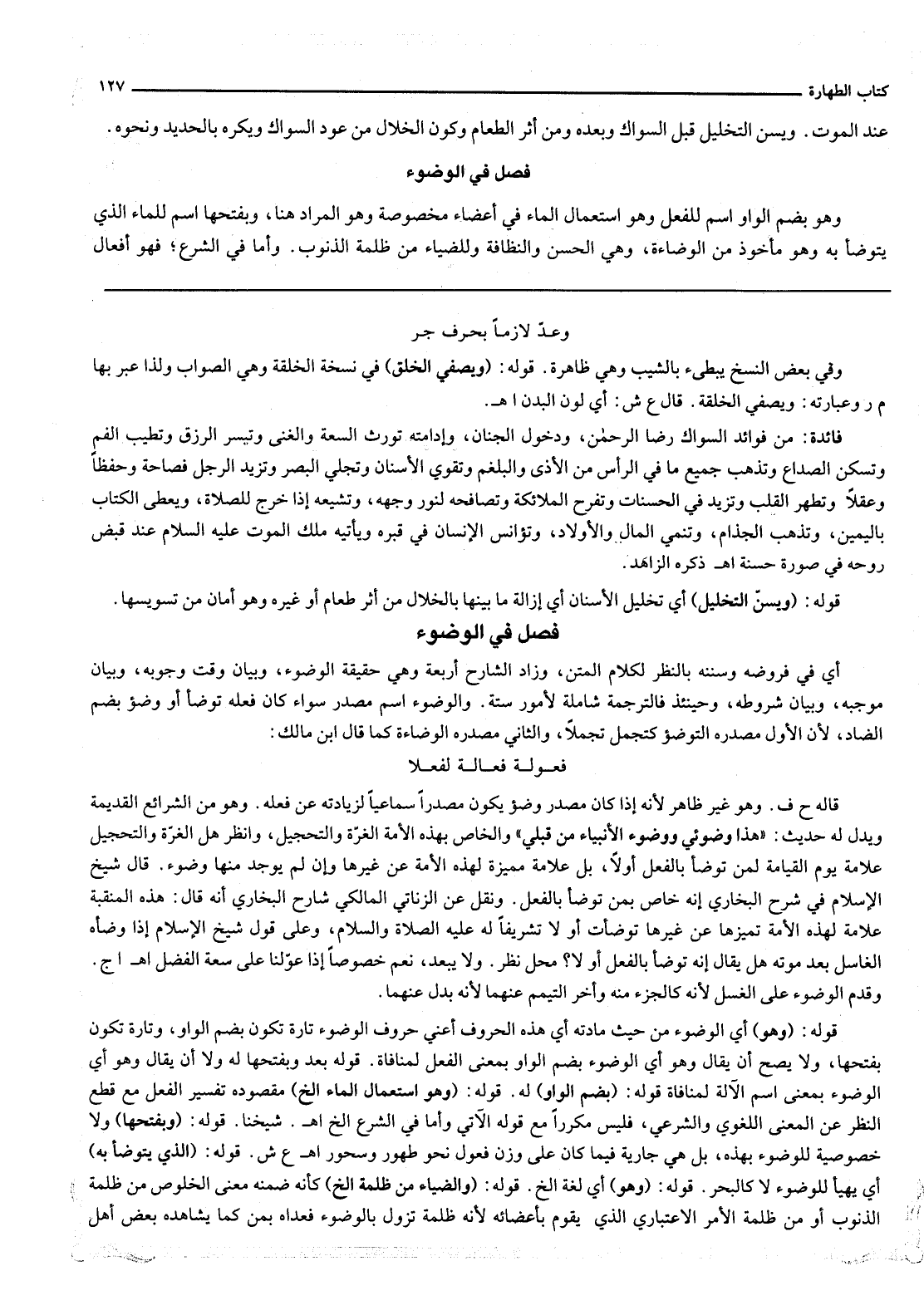 ِ أَيْ فِي فُرُوضِهِ وَسُنَنِهِ بِالنَّظَرِ لِكَلَامِ الْمَتْنِ، وَزَادَ الشَّارِحُ أَرْبَعَةً وَهِيَ حَقِيقَةُ الْوُضُوءِ، وَبَيَانُ وَقْتِ وُجُوبِهِ، وَبَيَانُ مُوجِبِهِ، وَبَيَانُ شُرُوطِهِ، وَحِينَئِذٍ فَالتَّرْجَمَةُ شَامِلَةٌ لِأُمُورٍ سِتَّةٍ. وَالْوُضُوءُ اسْمُ مَصْدَرٍ سَوَاءٌ كَانَ فِعْلُهُ تَوَضَّأَ أَوْ وَضُؤَ بِضَمِّ الضَّادِ لِأَنَّ الْأَوَّلَ مَصْدَرُهُ التَّوَضُّؤُ كَتَجَمَّلَ تَجَمُّلًا وَالثَّانِي مَصْدَرُهُ الْوَضَاءَةُ كَمَا قَالَ ابْنُ مَالِكٍ فَعُولَةٌ فَعَالَةٌ لَفِعْلَا قَالَهُ ح ف وَهُوَ غَيْرُ ظَاهِرٍ لِأَنَّهُ إذَا كَانَ مَصْدَرُ وَضُؤَ يَكُونُ مَصْدَرًا سَمَاعِيًّا لِزِيَادَتِهِ عَنْ فِعْلِهِ وَهُوَ مِنْ الشَّرَائِعِ الْقَدِيمَةِ وَيَدُلُّ لَهُ حَدِيثُ «هَذَا وُضُوئِي وَوُضُوءُ الْأَنْبِيَاءِ مِنْ قَبْلِي» وَالْخَاصُّ بِهَذِهِ الْأُمَّةِ الْغُرَّةُ وَالتَّحْجِيلُ وَانْظُرْ هَلْ الْغُرَّةُ وَالتَّحْجِيلُ عَلَامَةٌ يَوْمَ الْقِيَامَةِ لِمَنْ تَوَضَّأَ بِالْفِعْلِ أَوْ لَا بَلْ عَلَامَةٌ مُمَيِّزَةٌ لِهَذِهِ الْأُمَّةِ عَنْ غَيْرِهَا وَإِنْ لَمْ يُوجَدْ مِنْهَا وُضُوءٌ قَالَ شَيْخُ الْإِسْلَامِ فِي شَرْحِ الْبُخَارِيِّ إنَّهُ خَاصٌّ بِمَنْ تَوَضَّأَ بِالْفِعْلِ وَنُقِلَ عَنْ الزَّنَاتِيِّ الْمَالِكِيِّ شَارِحِ الْبُخَارِيِّ أَنَّهُ قَالَ هَذِهِ الْمَنْقَبَةُ عَلَامَةٌ لِهَذِهِ الْأُمَّةِ تُمَيِّزُهَا عَنْ غَيْرِهَا تَوَضَّأَتْ أَوْ لَا تَشْرِيفًا لَهُ - عَلَيْهِ الصَّلَاةُ وَالسَّلَامُ - وَعَلَى قَوْلِ شَيْخِ الْإِسْلَامِ إذَا وَضَّأَهُ الْغَاسِلُ بَعْدَ مَوْتِهِ هَلْ يُقَالُ إنَّهُ تَوَضَّأَ بِالْفِعْلِ أَوْ لَا مَحَلُّ نَظَرٍ وَلَا يَبْعُدُ نَعَمْ خُصُوصًا إذَا عَوَّلْنَا عَلَى سَعَةِ الْفَضْلِ اهـ اج وَقُدِّمَ الْوُضُوءُ عَلَى الْغُسْلِ لِأَنَّهُ كَالْجُزْءِ مِنْهُ وَأُخِّرَ التَّيَمُّمُ عَنْهُمَا لِأَنَّهُ بَدَلٌ عَنْهُمَا قَوْلُهُ وَهُوَ أَيْ الْوُضُوءُ مِنْ حَيْثُ مَادَّتُهُ أَيْ هَذِهِ الْحُرُوفُ أَعْنِي حُرُوفَ الْوُضُوءِ تَارَةً تَكُونُ بِضَمِّ الْوَاوِ وَتَارَةً تَكُونُ بِفَتْحِهَا وَلَا يَصِحُّ أَنْ يُقَالَ وَهُوَ أَيْ الْوُضُوءُ بِضَمِّ الْوَاوِ بِمَعْنَى الْفِعْلِ لِمُنَافَاةِ قَوْلِهِ بَعْدُ وَبِفَتْحِهَا لَهُ وَلَا أَنْ يُقَالَ وَهُوَ أَيْ الْوُضُوءُ بِمَعْنَى اسْمِ الْآلَةِ لِمُنَافَاةِ قَوْلِهِ بِضَمِّ الْوَاوِ لَهُ قَوْلُهُ وَهُوَ اسْتِعْمَالُ الْمَاءِ إلَخْ مَقْصُودُهُ تَفْسِيرُ الْفِعْلِ مَعَ قَطْعِ النَّظَرِ عَنْ الْمَعْنَى اللُّغَوِيِّ وَالشَّرْعِيِّ فَلَيْسَ مُكَرَّرًا مَعَ قَوْلِهِ الْآتِي وَأَمَّا فِي الشَّرْعِ إلَخْ. اهـ. شَيْخُنَا