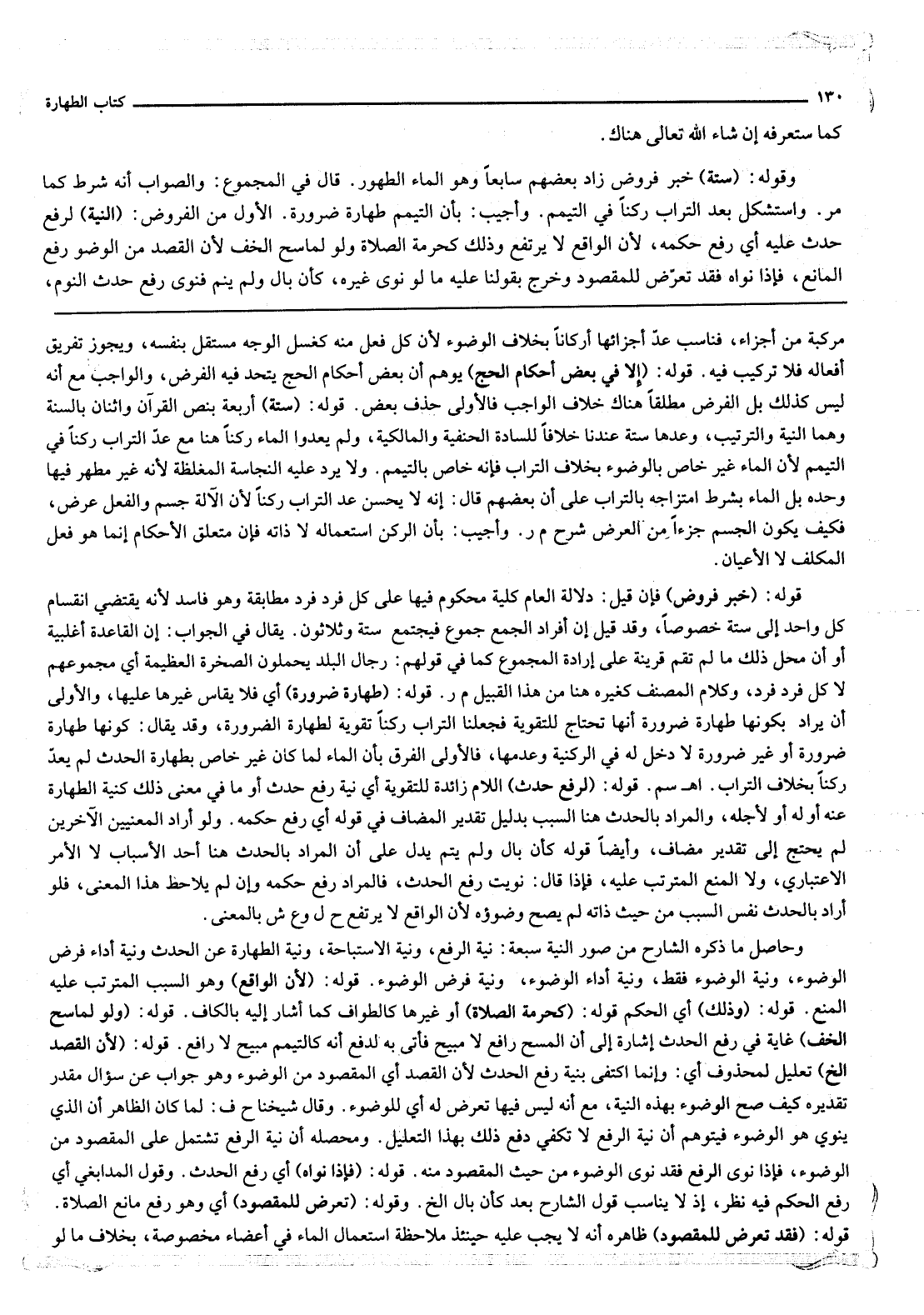 كَمَا سَتَعْرِفُهُ إنْ شَاءَ اللَّهُ تَعَالَى هُنَاكَ. وَقَوْلُهُ: (سِتَّةٌ) خَبَرُ فُرُوضٍ زَادَ بَعْضُهُمْ سَابِعًا وَهُوَ الْمَاءُ الطَّهُورُ. قَالَ فِي الْمَجْمُوعِ: وَالصَّوَابُ أَنَّهُ شَرْطٌ كَمَا مَرَّ، وَاسْتُشْكِلَ بِعَدِّ التُّرَابِ رُكْنًا فِي التَّيَمُّمِ. وَأُجِيبَ: بِأَنَّ التَّيَمُّمَ طَهَارَةٌ ضَرُورَةً. الْأَوَّلُ مِنْ الْفُرُوضِ: (النِّيَّةُ) لِرَفْعِ حَدَثٍ عَلَيْهِ أَيْ رَفْعِ حُكْمِهِ؛ لِأَنَّ الْوَاقِعَ لَا يَرْتَفِعُ وَذَلِكَ كَحُرْمَةِ الصَّلَاةِ وَلَوْ لِمَاسِحِ الْخُفِّ؛ لِأَنَّ الْقَصْدَ مِنْ الْوُضُوءِ رَفْعُ الْمَانِعِ، فَإِذَا نَوَاهُ فَقَدْ تَعَرَّضَ لِلْمَقْصُودِ وَخَرَجَ بِقَوْلِنَا عَلَيْهِ مَا لَوْ نَوَى غَيْرَهُ، كَأَنْ بَالَ وَلَمْ يَنَمْ فَنَوَى رَفْعَ حَدَثِ النَّوْمِ،