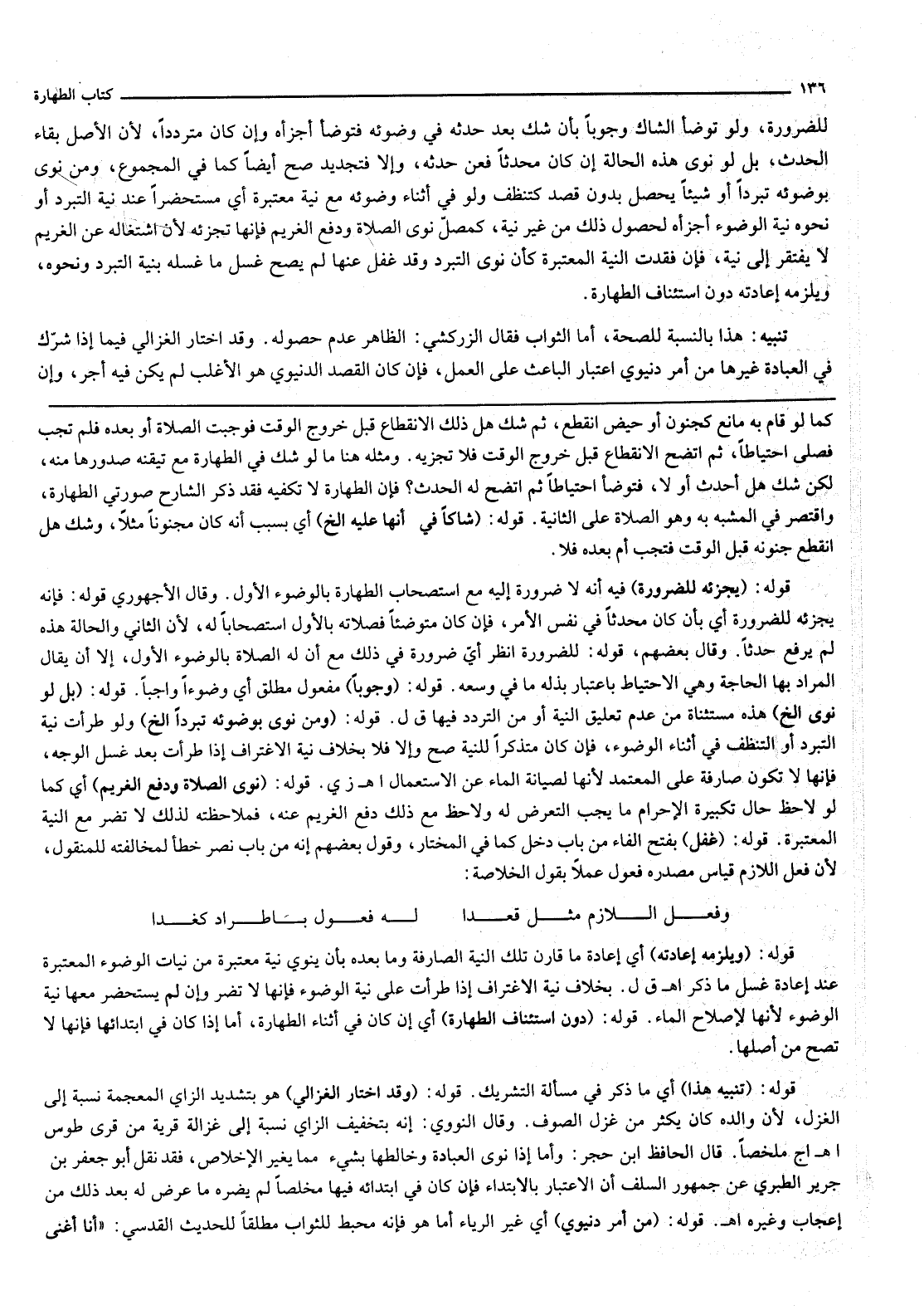 قَوْلُهُ: (دُونَ اسْتِئْنَافٍ لِلطَّهَارَةِ) أَيْ إنْ كَانَ فِي أَثْنَاءِ الطَّهَارَةِ، أَمَّا إذَا كَانَ فِي ابْتِدَائِهَا فَإِنَّهَا لَا تَصِحُّ مِنْ أَصْلِهَا. قَوْلُهُ: (تَنْبِيهُ هَذَا) أَيْ مَا ذُكِرَ فِي مَسْأَلَةِ التَّشْرِيكِ. قَوْلُهُ: (وَقَدْ اخْتَارَ الْغَزَالِيُّ) هُوَ بِتَشْدِيدِ الزَّايِ الْمُعْجَمَةِ نِسْبَةٌ إلَى الْغَزْلِ؛ لِأَنَّ وَالِدَهُ كَانَ يُكْثِرُ مِنْ غَزْلِ الصُّوفِ. وَقَالَ النَّوَوِيُّ: إنَّهُ بِتَخْفِيفِ الزَّايِ نِسْبَةٌ إلَى غَزَالَةَ قَرْيَةٌ مِنْ قُرَى طُوسٍ. اهـ. اج مُلَخَّصًا. قَالَ الْحَافِظُ ابْنُ حَجَرٍ: وَأَمَّا إذَا نَوَى الْعِبَادَةَ وَخَالَطَهَا بِشَيْءٍ مِمَّا يُغَيِّرُ الْإِخْلَاصَ، فَقَدْ نَقَلَ أَبُو جَعْفَرٍ بْنُ جَرِيرٍ الطَّبَرِيُّ عَنْ جُمْهُورِ السَّلَفِ أَنَّ الِاعْتِبَارَ بِالِابْتِدَاءِ فَإِنْ كَانَ فِي ابْتِدَائِهِ فِيهَا مُخْلَصًا لَمْ يَضُرَّهُ مَا عَرَضَ لَهُ بَعْدَ ذَلِكَ مِنْ إعْجَابٍ وَغَيْرِهِ. اهـ.