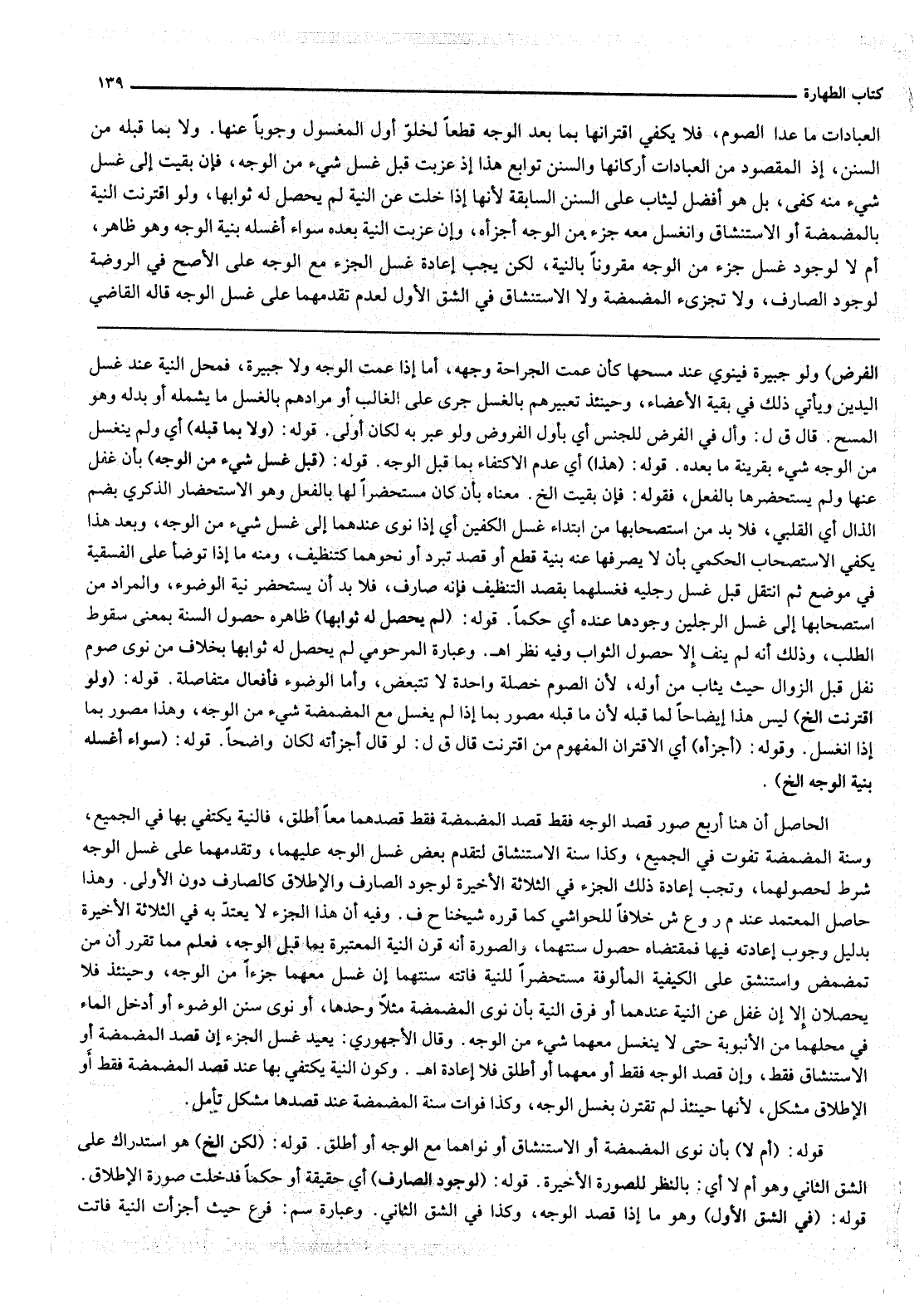 الْعِبَادَاتِ مَا عَدَا الصَّوْمَ، فَلَا يَكْفِي اقْتِرَانُهَا بِمَا بَعْدَ الْوَجْهِ قَطْعًا لِخُلُوِّ أَوَّلِ الْمَغْسُولِ وُجُوبًا عَنْهَا. وَلَا بِمَا قَبْلَهُ مِنْ السُّنَنِ، إذْ الْمَقْصُودُ مِنْ الْعِبَادَاتِ أَرْكَانُهَا وَالسُّنَنُ تَوَابِعُ، هَذَا إذْ عَزَبَتْ قَبْلَ غَسْلِ شَيْءٍ مِنْ الْوَجْهِ، فَإِنْ بَقِيَتْ إلَى غَسْلِ شَيْءٍ مِنْهُ كَفَى، بَلْ هُوَ أَفْضَلُ لِيُثَابَ عَلَى السُّنَنِ السَّابِقَةِ؛ لِأَنَّهَا إذَا خَلَتْ عَنْ النِّيَّةِ لَمْ يَحْصُلْ لَهُ ثَوَابُهَا، وَلَوْ اقْتَرَنَتْ النِّيَّةُ بِالْمَضْمَضَةِ أَوْ الِاسْتِنْشَاقِ وَانْغَسَلَ مَعَهُ جُزْءٌ مِنْ الْوَجْهِ أَجْزَأَهُ، وَإِنْ عَزَبَتْ النِّيَّةُ بَعْدَهُ سَوَاءٌ أَغَسَلَهُ بِنِيَّةِ الْوَجْهِ وَهُوَ ظَاهِرٌ، أَمْ لَا لِوُجُودِ غَسْلِ جُزْءٍ مِنْ الْوَجْهِ مَقْرُونًا بِالنِّيَّةِ، لَكِنْ يَجِبُ إعَادَةُ غَسْلِ الْجُزْءِ مَعَ الْوَجْهِ عَلَى الْأَصَحِّ فِي الرَّوْضَةِ لِوُجُودِ الصَّارِفِ، وَلَا تُجْزِئُ الْمَضْمَضَةُ وَلَا الِاسْتِنْشَاقُ فِي الشِّقِّ الْأَوَّلِ لِعَدَمِ تَقَدُّمِهِمَا عَلَى غَسْلِ الْوَجْهِ قَالَهُ الْقَاضِي مُجَلَّيْ