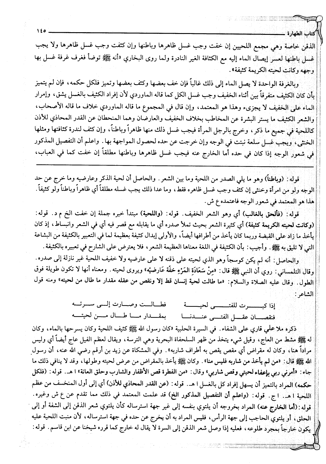 ذَكَرَهُ مُلَّا عَلِيٌّ قَارِي عَلَى الشِّفَاءِ. فِي السِّيرَةِ الْحَلَبِيَّةِ «كَانَ رَسُولُ اللَّهِ كَثِيفَ اللِّحْيَةِ وَكَانَ يُسَرِّحُهَا بِالْمَاءِ، وَكَانَ لَهُ - صَلَّى اللَّهُ عَلَيْهِ وَسَلَّمَ - مُشْطٌ مِنْ الْعَاجِ، وَقِيلَ شَيْءٌ يُتَّخَذُ مِنْ ظَهْرِ السُّلَحْفَاةِ الْبَحْرِيَّةِ وَهِيَ التِّرْسَةُ، وَيُقَالُ لِعَظْمِ الْفِيلِ عَاجٌ أَيْضًا أَيْ وَلَيْسَ مُرَادًا هُنَا، وَكَانَ لَهُ مِقْرَاضٌ أَيْ مِقَصٌّ يَقُصُّ بِهِ أَطْرَافَ شَارِبِهِ» . وَفِي الْمِشْكَاةِ عَنْ زَيْدِ بْنِ أَرْقَمَ - رَضِيَ اللَّهُ عَنْهُ - «أَنَّ رَسُولَ اللَّهِ - صَلَّى اللَّهُ عَلَيْهِ وَسَلَّمَ - قَالَ: مَنْ لَمْ يَأْخُذْ مِنْ شَارِبِهِ فَلَيْسَ مِنَّا» . وَكَانَ - صَلَّى اللَّهُ عَلَيْهِ وَسَلَّمَ - يَأْخُذُ بِالْمِقْرَاضِ مِنْ عَرْضِ لِحْيَتِهِ وَطُولِهَا، وَقَدْ لَا يُنَافِي ذَلِكَ مَا جَاءَ: «أَمَرَنِي رَبِّي بِإِعْفَاءِ لِحْيَتِي وَقَصِّ شَارِبِي» وَقَالَ: «مِنْ الْفِطْرَةِ قَصُّ الْأَظْفَارِ وَالشَّارِبِ وَحَلْقُ الْعَانَةِ» . اهـ.