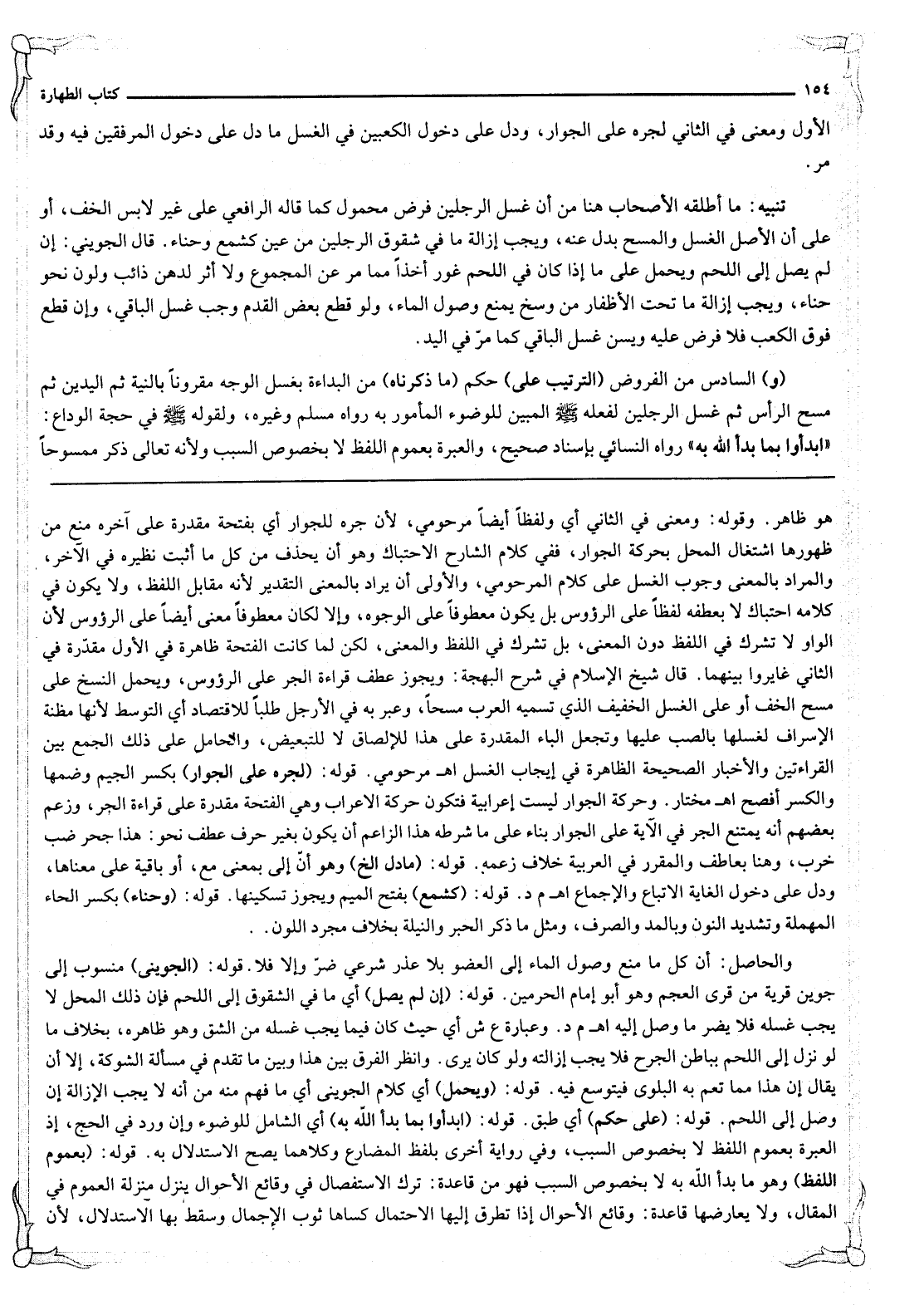 تَنْبِيهٌ: مَا أَطْلَقَهُ الْأَصْحَابُ هُنَا مِنْ أَنَّ غَسْلَ الرِّجْلَيْنِ فَرْضٌ مَحْمُولٌ كَمَا قَالَهُ الرَّافِعِيُّ عَلَى غَيْرِ لَابِسِ الْخُفِّ، أَوْ عَلَى أَنَّ الْأَصْلَ الْغَسْلُ، وَالْمَسْحُ بَدَلٌ عَنْهُ، وَيَجِبُ إزَالَةُ مَا فِي شُقُوقِ الرِّجْلَيْنِ مِنْ عَيْنٍ كَشَمْعٍ وَحِنَّاءٍ. قَالَ الْجُوَيْنِيُّ: إنْ لَمْ يَصِلْ إلَى اللَّحْمِ وَيُحْمَلُ عَلَى مَا إذَا كَانَ فِي اللَّحْمِ غَوْرٌ أَخْذًا مِمَّا مَرَّ عَنْ الْمَجْمُوعِ وَلَا أَثَرَ لِدُهْنٍ ذَائِبٍ وَلَوْنِ نَحْوِ حِنَّاءٍ، وَيَجِبُ إزَالَةُ مَا تَحْتَ الْأَظْفَارِ مِنْ وَسَخٍ يَمْنَعُ وُصُولَ الْمَاءِ، وَلَوْ قُطِعَ بَعْضُ الْقَدَمِ وَجَبَ غَسْلُ الْبَاقِي، وَإِنْ قُطِعَ فَوْقَ الْكَعْبِ فَلَا فَرْضَ عَلَيْهِ وَيُسَنُّ غَسْلُ الْبَاقِي كَمَا مَرَّ فِي الْيَدِ.