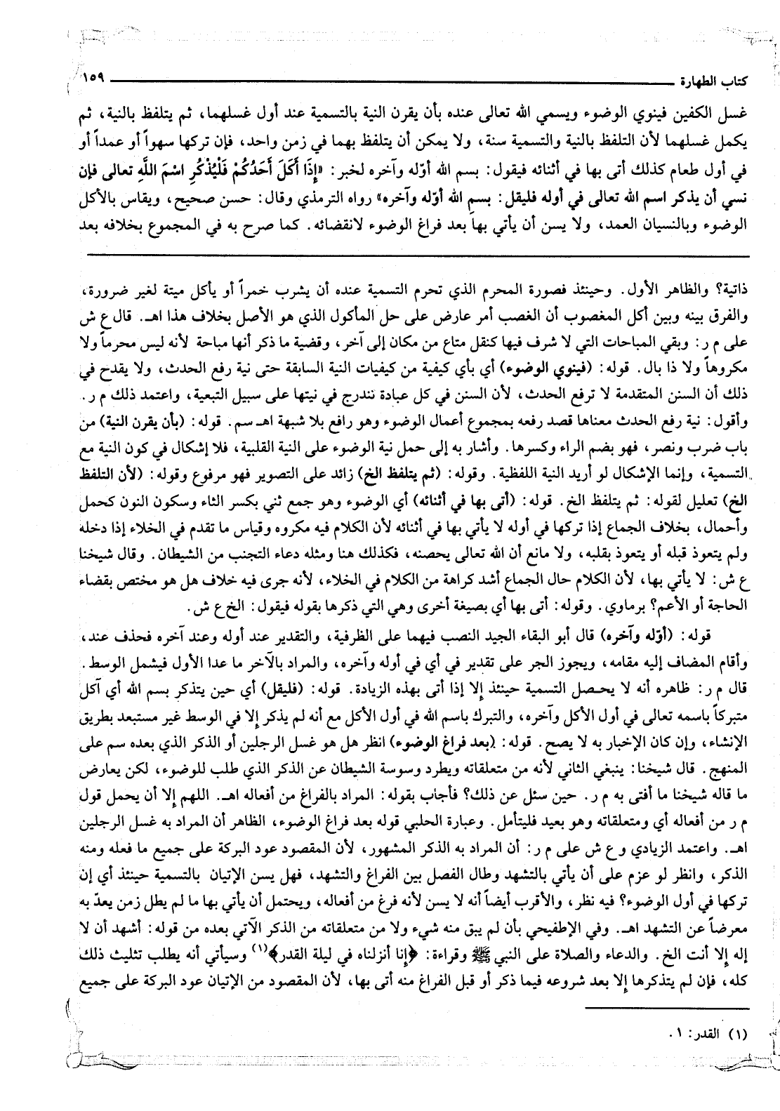 غَسْلِ الْكَفَّيْنِ فَيَنْوِي الْوُضُوءَ وَيُسَمِّي اللَّهَ تَعَالَى عِنْدَهُ بِأَنْ يَقْرُنَ النِّيَّةَ بِالتَّسْمِيَةِ عِنْدَ أَوَّلِ غَسْلِهِمَا، ثُمَّ يَتَلَفَّظَ بِالنِّيَّةِ، ثُمَّ يُكْمِلَ غَسْلَهُمَا؛ لِأَنَّ التَّلَفُّظَ بِالنِّيَّةِ وَالتَّسْمِيَةِ سُنَّةٌ، وَلَا يُمْكِنُ أَنْ يَتَلَفَّظَ بِهِمَا فِي زَمَنٍ وَاحِدٍ، فَإِنْ تَرَكَهَا سَهْوًا أَوْ عَمْدًا أَوْ فِي أَوَّلِ طَعَامٍ كَذَلِكَ أَتَى بِهَا فِي أَثْنَائِهِ فَيَقُولُ: بِسْمِ اللَّهِ أَوَّلَهُ وَآخِرَهُ لِخَبَرِ: «إذَا أَكَلَ أَحَدُكُمْ فَلْيَذْكُرْ اسْمَ اللَّهِ تَعَالَى فَإِنْ نَسِيَ أَنْ يَذْكُرَ اسْمَ اللَّهِ تَعَالَى فِي أَوَّلِهِ فَلْيَقُلْ: بِسْمِ اللَّهِ أَوَّلَهُ وَآخِرَهُ» رَوَاهُ التِّرْمِذِيُّ وَقَالَ: حَسَنٌ صَحِيحٌ، وَيُقَاسُ بِالْأَكْلِ الْوُضُوءُ، وَبِالنِّسْيَانِ الْعَمْدُ، وَلَا يُسَنُّ أَنْ يَأْتِيَ بِهَا بَعْدَ فَرَاغِ الْوُضُوءِ لِانْقِضَائِهِ. كَمَا صَرَّحَ بِهِ فِي الْمَجْمُوعِ بِخِلَافِهِ بَعْدَ