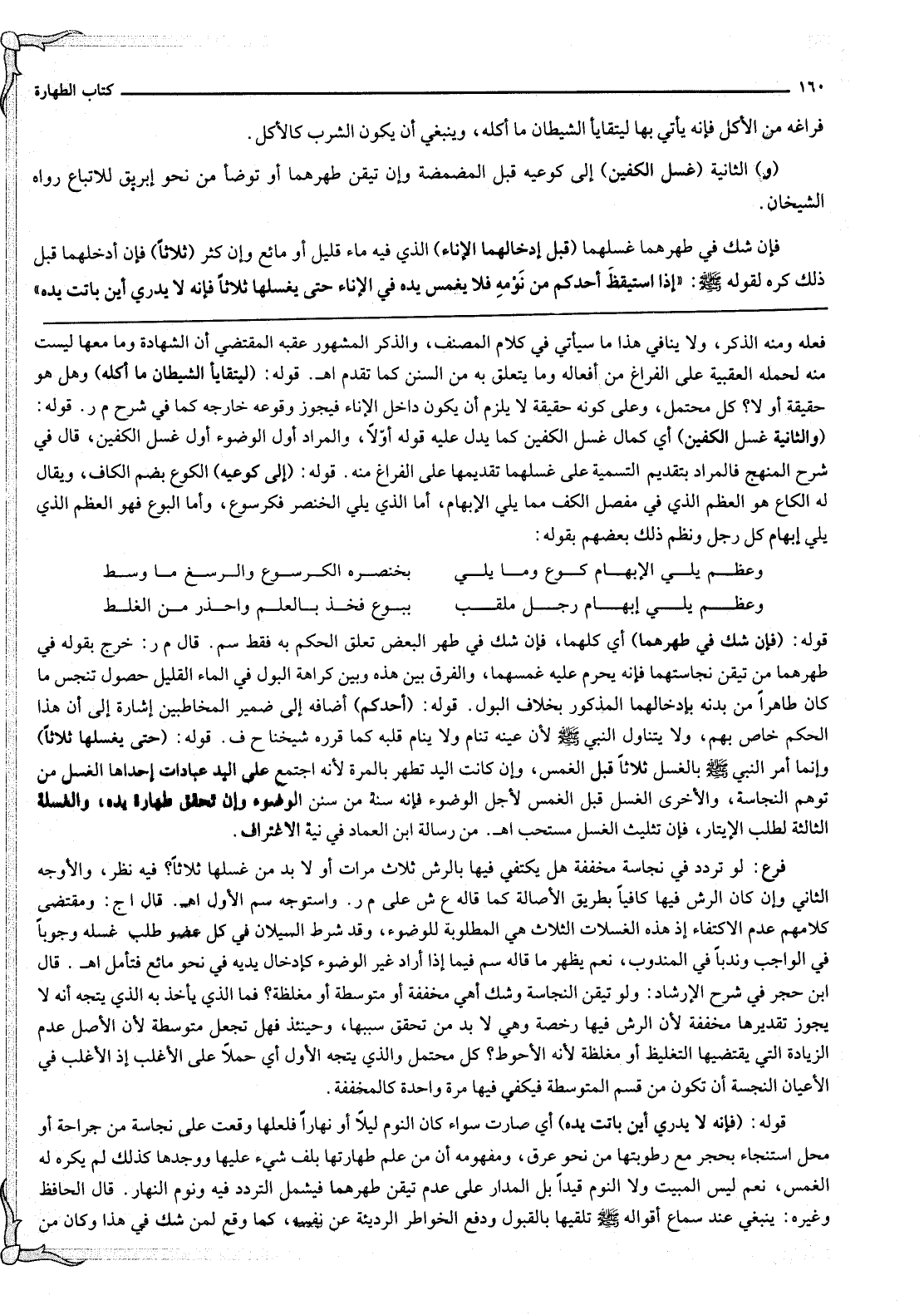 قَوْلُهُ: «فَإِنَّهُ لَا يَدْرِي أَيْنَ بَاتَتْ يَدُهُ» أَيْ صَارَتْ سَوَاءً كَانَ النَّوْمُ لَيْلًا أَوْ نَهَارًا فَلَعَلَّهَا وَقَعَتْ عَلَى نَجَاسَةٍ مِنْ جِرَاحَةٍ أَوْ مَحَلِّ اسْتِنْجَاءٍ بِحَجَرٍ مَعَ رُطُوبَتِهَا مِنْ نَحْوِ عَرَقٍ، وَمَفْهُومُهُ أَنَّ مَنْ عَلِمَ طَهَارَتَهَا بِلَفِّ شَيْءٍ عَلَيْهَا وَوَجَدَهَا كَذَلِكَ لَمْ يُكْرَهْ لَهُ الْغَمْسُ، نَعَمْ لَيْسَ الْمَبِيتُ وَلَا النَّوْمُ قَيْدًا بَلْ الْمَدَارُ عَلَى عَدَمِ تَيَقُّنِ طُهْرِهِمَا فَيَشْمَلُ التَّرَدُّدَ فِيهِ وَنَوْمَ النَّهَارِ. قَالَ الْحَافِظُ وَغَيْرُهُ: يَنْبَغِي عِنْدَ سَمَاعِ أَقْوَالِهِ - صَلَّى اللَّهُ عَلَيْهِ وَسَلَّمَ - تَلَقِّيهَا بِالْقَبُولِ وَدَفْعِ الْخَوَاطِرِ الرَّدِيئَةِ عَنْ نَفْسِهِ، كَمَا وَقَعَ لِمَنْ شَكَّ فِي هَذَا وَكَانَ مِنْ