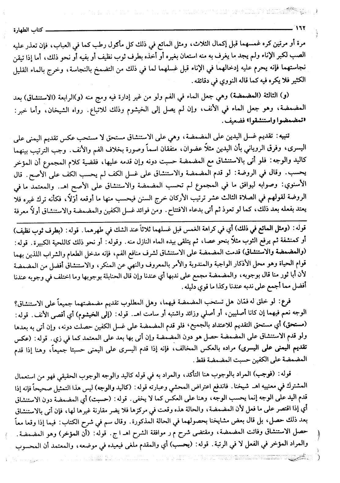 قَوْلُهُ: (وَالْمَضْمَضَةُ وَالِاسْتِنْشَاقُ) قُدِّمَتْ الْمَضْمَضَةُ عَلَى الِاسْتِنْشَاقِ لِشَرَفِ مَنَافِعِ الْفَمِ، فَإِنَّهُ مَدْخَلُ الطَّعَامِ وَالشَّرَابِ اللَّذَيْنِ بِهِمَا قِوَامُ الْحَيَاةِ وَهُوَ مَحَلُّ الْأَذْكَارِ الْوَاجِبَةِ وَالْمَنْدُوبَةِ وَالْأَمْرِ بِالْمَعْرُوفِ وَالنَّهْيِ عَنْ الْمُنْكَرِ، وَالِاسْتِنْشَاقُ أَفْضَلُ مِنْ الْمَضْمَضَةِ؛ لِأَنَّ أَبَا ثَوْرٍ مِنَّا قَالَ بِوُجُوبِهِ، وَالْمَضْمَضَةُ مُجْمَعٌ عَلَى نَدْبِهَا أَيْ عِنْدَنَا، وَإِنْ قَالَ الْحَنَابِلَةُ بِوُجُوبِهَا وَمَا اُخْتُلِفَ فِي وُجُوبِهِ عِنْدَنَا أَفْضَلُ مِمَّا أُجْمِعَ عَلَى نَدْبِهِ عِنْدَنَا وَكَذَا مَا قَوِيَ دَلِيلُهُ.