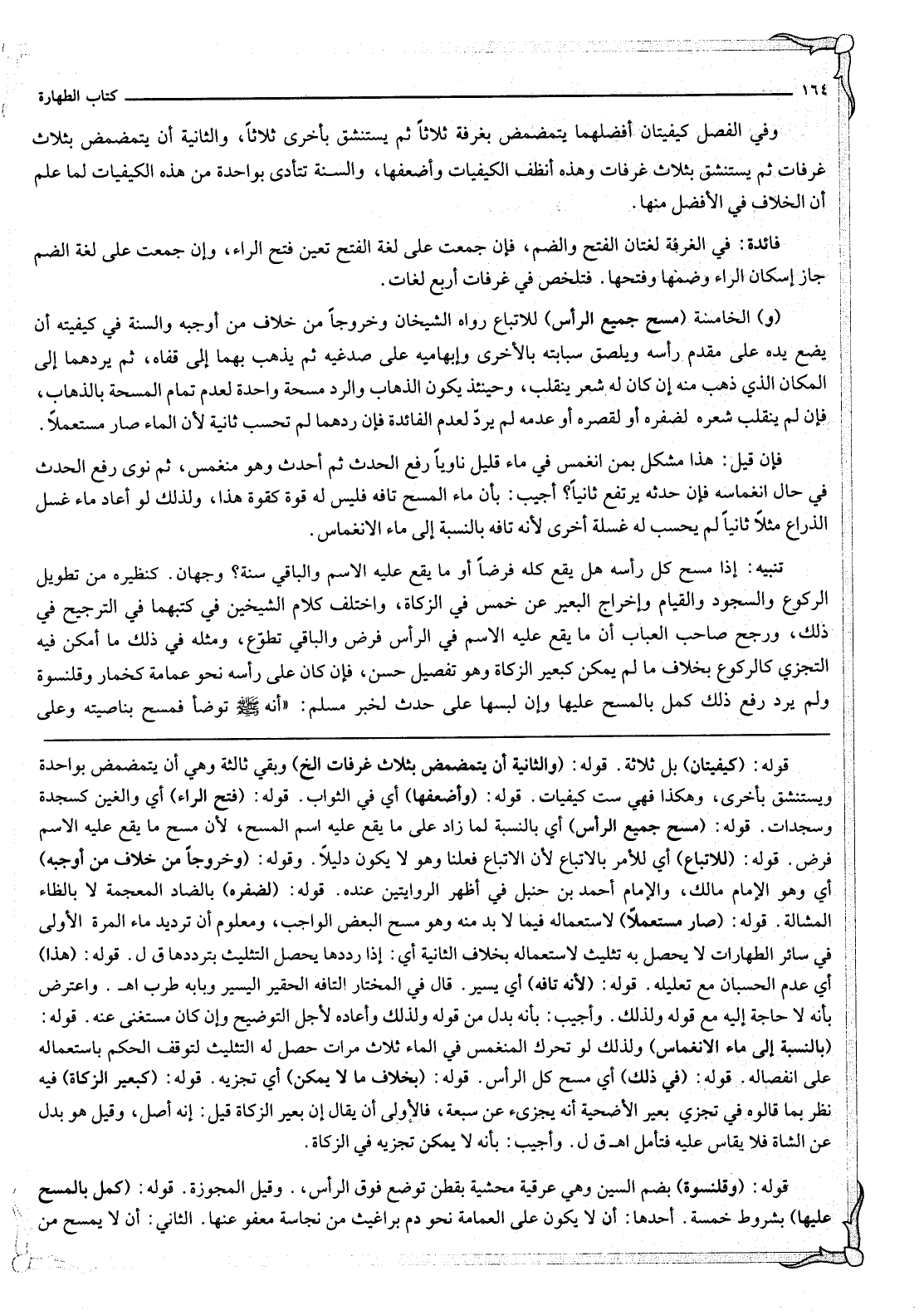 تَنْبِيهٌ: إذَا مَسَحَ كُلَّ رَأْسِهِ هَلْ يَقَعُ كُلُّهُ فَرْضًا أَوْ مَا يَقَعُ عَلَيْهِ الِاسْمُ وَالْبَاقِي سُنَّةٌ؟ . وَجْهَانِ كَنَظِيرِهِ مِنْ تَطْوِيلِ الرُّكُوعِ وَالسُّجُودِ وَالْقِيَامِ، وَإِخْرَاجِ الْبَعِيرِ عَنْ خَمْسٍ فِي الزَّكَاةِ، وَاخْتَلَفَ كَلَامُ الشَّيْخَيْنِ فِي كُتُبِهِمَا فِي التَّرْجِيحِ فِي ذَلِكَ، وَرَجَّحَ صَاحِبُ الْعُبَابِ أَنَّ مَا يَقَعُ عَلَيْهِ الِاسْمُ فِي الرَّأْسِ فَرْضٌ وَالْبَاقِي تَطَوُّعٌ، وَمِثْلُهُ فِي ذَلِكَ مَا أَمْكَنَ فِيهِ التَّجَزُّؤُ كَالرُّكُوعِ بِخِلَافِ مَا لَمْ يُمْكِنْ كَبَعِيرِ الزَّكَاةِ وَهُوَ تَفْصِيلٌ حَسَنٌ، فَإِنْ كَانَ عَلَى رَأْسِهِ نَحْوُ عِمَامَةٍ كَخِمَارٍ وَقَلَنْسُوَةٍ وَلَمْ يُرِدْ رَفْعَ ذَلِكَ كَمَّلَ بِالْمَسْحِ عَلَيْهَا، وَإِنْ لَبِسَهَا عَلَى حَدَثٍ لِخَبَرِ مُسْلِمٍ: «أَنَّهُ - صَلَّى اللَّهُ عَلَيْهِ وَسَلَّمَ - تَوَضَّأَ فَمَسَحَ بِنَاصِيَتِهِ وَعَلَى