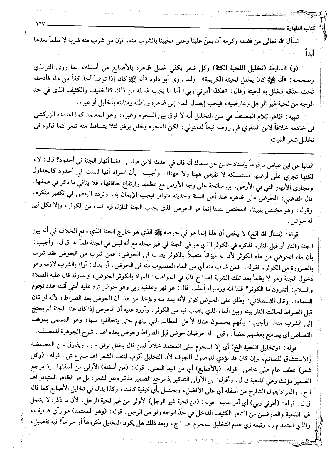 ـــــــــــــــــــــــــــــQابْنُ أَبِي الدُّنْيَا عَنْ ابْنِ عَبَّاسٍ مَرْفُوعًا بِإِسْنَادٍ حَسَنٍ عَنْ سِمَاكٍ أَنَّهُ قَالَ فِي حَدِيثِهِ لِابْنِ عَبَّاسٍ: «فَمَا أَنْهَارُ الْجَنَّةِ فِي أُخْدُودٍ؟ قَالَ: لَا، لَكِنَّهَا تَجْرِي عَلَى أَرْضِهَا مُسْتَمْسِكَةً لَا تَفِيضُ هَهُنَا وَلَا هَهُنَا» . وَأُجِيبَ: بِأَنَّ الْمُرَادَ أَنَّهَا لَيْسَتْ فِي أُخْدُودٍ كَالْجَدَاوِلِ وَمَجَارِي الْأَنْهَارِ الَّتِي فِي الْأَرْضِ، بَلْ سَائِحَةٌ عَلَى وَجْهِ الْأَرْضِ مَعَ عِظَمِهَا وَارْتِفَاعِ حَافَّاتِهَا، فَلَا يُنَافِي مَا ذُكِرَ فِي عُمْقِهَا. قَالَ الْقَاضِي: الْحَوْضُ عَلَى ظَاهِرِهِ عِنْدَ أَهْلِ السُّنَّةِ وَحَدِيثُهُ مُتَوَاتِرٌ فَيَجِبُ الْإِيمَانُ بِهِ، وَتَرَدَّدَ الْبَعْضُ فِي تَكْفِيرِ مُنْكَرِهِ. وَقَوْلُهُ: وَهُوَ مُخْتَصٌّ بِنَبِيِّنَا، الْمُخْتَصُّ بِنَبِيِّنَا إنَّمَا هُوَ الْحَوْضُ الَّذِي بِجَنْبِ الْجَنَّةِ النَّازِلِ فِيهِ الْمَاءُ مِنْ الْكَوْثَرِ، وَإِلَّا فَكُلُّ نَبِيٍّ لَهُ حَوْضٌ.