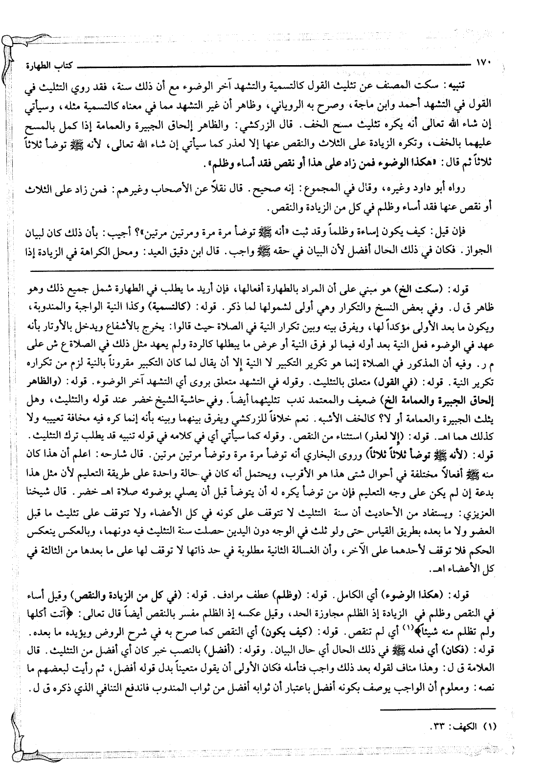 قَوْلُهُ: (فِي كُلٍّ مِنْ الزِّيَادَةِ وَالنَّقْصِ) وَقِيلَ أَسَاءَ فِي النَّقْصِ وَظَلَمَ فِي الزِّيَادَةِ إذْ الظُّلْمُ مُجَاوَزَةُ الْحَدِّ، وَقِيلَ عَكْسُهُ إذْ الظُّلْمُ مُفَسَّرٌ بِالنَّقْصِ أَيْضًا قَالَ تَعَالَى: {آتَتْ أُكُلَهَا وَلَمْ تَظْلِمْ مِنْهُ شَيْئًا} [الكهف: 33] أَيْ لَمْ تَنْقُصْ. قَوْلُهُ: (كَيْفَ يَكُونُ) أَيْ النَّقْصُ كَمَا صَرَّحَ بِهِ فِي شَرْحِ الرَّوْضِ وَيُؤَيِّدُهُ مَا بَعْدَهُ. قَوْلُهُ: (فَكَانَ) أَيْ فِعْلُهُ - صَلَّى اللَّهُ عَلَيْهِ وَسَلَّمَ - فِي ذَلِكَ الْحَالِ أَيْ حَالِ الْبَيَانِ. وَقَوْلُهُ: (أَفْضَلَ) بِالنَّصْبِ خَبَرُ كَانَ أَيْ أَفْضَلَ مِنْ التَّثْلِيثِ. قَالَ الْعَلَّامَةُ ق ل: وَهَذَا مُنَافٍ لِقَوْلِهِ بَعْدَ ذَلِكَ وَاجِبٌ فَتَأَمَّلْهُ، فَكَانَ الْأَوْلَى أَنْ يَقُولَ مُتَعَيِّنًا بَدَلَ قَوْلِهِ أَفْضَلَ، ثُمَّ رَأَيْت لِبَعْضِهِمْ مَا نَصُّهُ: وَمَعْلُومٌ أَنَّ الْوَاجِبَ يُوصَفُ بِكَوْنِهِ أَفْضَلَ بِاعْتِبَارِ أَنَّ ثَوَابَهُ أَفْضَلُ مِنْ ثَوَابِ الْمَنْدُوبِ فَانْدَفَعَ التَّنَافِي الَّذِي ذَكَرَهُ ق ل.