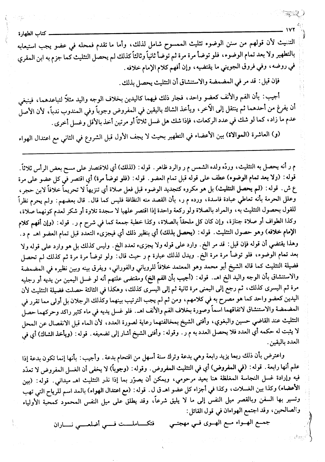 التَّثْلِيثُ؛ لِأَنَّ قَوْلَهُمْ مِنْ سُنَنِ الْوُضُوءِ تَثْلِيثُ الْمَمْسُوحِ شَامِلٌ لِذَلِكَ، وَأَمَّا مَا تَقَدَّمَ فَمَحَلُّهُ فِي عُضْوٍ يَجِبُ اسْتِيعَابُهُ بِالتَّطْهِيرِ وَلَا بَعْدَ تَمَامِ الْوُضُوءِ، فَلَوْ تَوَضَّأَ مَرَّةً مَرَّةً ثُمَّ تَوَضَّأَ ثَانِيًا وَثَالِثًا كَذَلِكَ لَمْ يَحْصُلْ التَّثْلِيثُ كَمَا جَزَمَ بِهِ ابْنُ الْمُقْرِي فِي رَوْضِهِ، وَفِي فُرُوقِ الْجُوَيْنِيِّ مَا يَقْتَضِيهِ، وَإِنْ أَفْهَمَ كَلَامُ الْإِمَامِ خِلَافَهُ. فَإِنْ قِيلَ: قَدْ مَرَّ فِي الْمَضْمَضَةِ وَالِاسْتِنْشَاقِ أَنَّ التَّثْلِيثَ يَحْصُلُ بِذَلِكَ. أُجِيبَ: بِأَنَّ الْفَمَ وَالْأَنْفَ كَعُضْوٍ وَاحِدٍ، فَجَارٍ ذَلِكَ فِيهِمَا كَالْيَدَيْنِ بِخِلَافِ الْوَجْهِ وَالْيَدِ مَثَلًا لِتَبَاعُدِهِمَا، فَيَنْبَغِي أَنْ يَفْرُغَ مِنْ أَحَدِهِمَا ثُمَّ يَنْتَقِلَ إلَى الْآخَرِ، وَيَأْخُذُ الشَّاكُّ بِالْيَقِينِ فِي الْمَفْرُوضِ وُجُوبًا وَفِي الْمَنْدُوبِ نَدْبًا؛ لِأَنَّ الْأَصْلَ عَدَمُ مَا زَادَ، كَمَا لَوْ شَكَّ فِي عَدَدِ الرَّكَعَاتِ، فَإِذَا شَكَّ هَلْ غَسَلَ ثَلَاثًا أَوْ مَرَّتَيْنِ أَخَذَ بِالْأَقَلِّ وَغَسَلَ أُخْرَى.