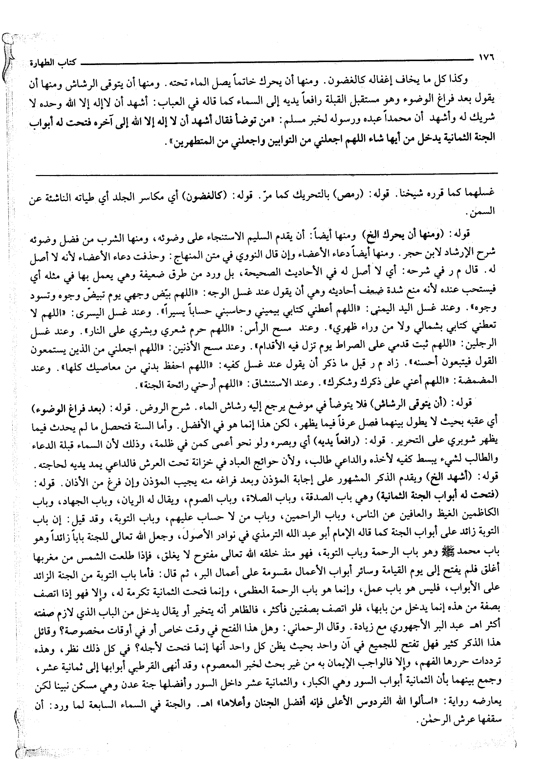 وَمِنْهَا أَنْ يَقُولَ بَعْدَ فَرَاغِ الْوُضُوءِ وَهُوَ مُسْتَقْبِلُ الْقِبْلَةِ رَافِعًا يَدَيْهِ إلَى السَّمَاءِ كَمَا قَالَهُ فِي الْعُبَابِ: أَشْهَدُ أَنْ لَا إلَهَ إلَّا اللَّهُ وَحْدَهُ لَا شَرِيكَ لَهُ، وَأَشْهَدُ أَنَّ مُحَمَّدًا عَبْدُهُ وَرَسُولُهُ لِخَبَرِ مُسْلِمٍ: «مَنْ تَوَضَّأَ فَقَالَ أَشْهَدُ أَنْ لَا إلَهَ إلَّا اللَّهُ إلَى آخِرِهِ فُتِحَتْ لَهُ أَبْوَابُ الْجَنَّةِ الثَّمَانِيَةِ يَدْخُلُ مِنْ أَيُّهَا شَاءَ» ، «اللَّهُمَّ اجْعَلْنِي مِنْ التَّوَّابِينَ وَاجْعَلْنِي مِنْ الْمُتَطَهِّرِينَ» .