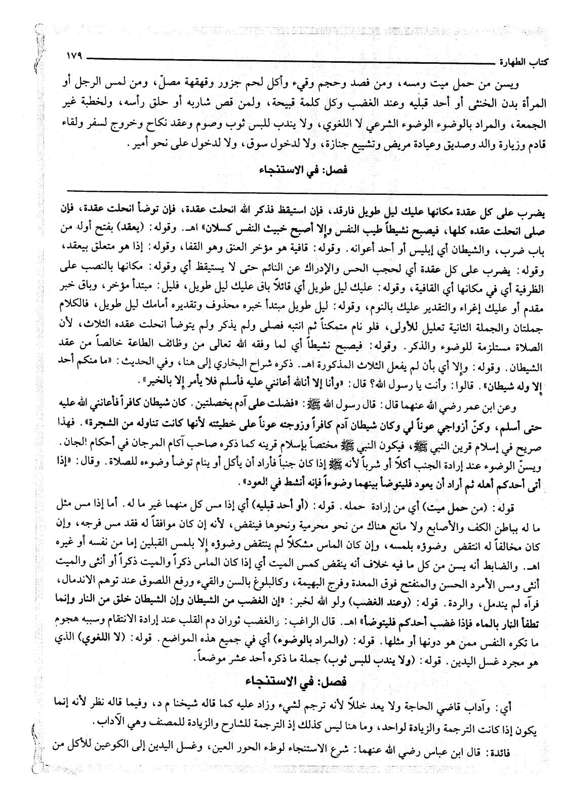 ِ أَيْ: وَآدَابِ قَاضِي الْحَاجَةِ وَلَا يُعَدُّ خَلَلًا لِأَنَّهُ تَرْجَمَ لِشَيْءٍ وَزَادَ عَلَيْهِ كَمَا قَالَهُ شَيْخُنَا م د، وَفِيمَا قَالَهُ نَظَرٌ لِأَنَّهُ إنَّمَا يَكُونُ إذَا كَانَتْ التَّرْجَمَةُ وَالزِّيَادَةُ لِوَاحِدٍ، وَمَا هُنَا لَيْسَ كَذَلِكَ إذْ التَّرْجَمَةُ لِلشَّارِحِ وَالزِّيَادَةُ لِلْمُصَنِّفِ وَهِيَ الْآدَابُ. فَائِدَةٌ: قَالَ ابْنُ عَبَّاسٍ - رَضِيَ اللَّهُ عَنْهُمَا -: شُرِعَ الِاسْتِنْجَاءُ لِوَطْءِ الْحَوَرِ الْعَيْنِ، وَغَسْلُ الْيَدَيْنِ إلَى الْكُوعَيْنِ لِلْأَكْلِ مِنْ