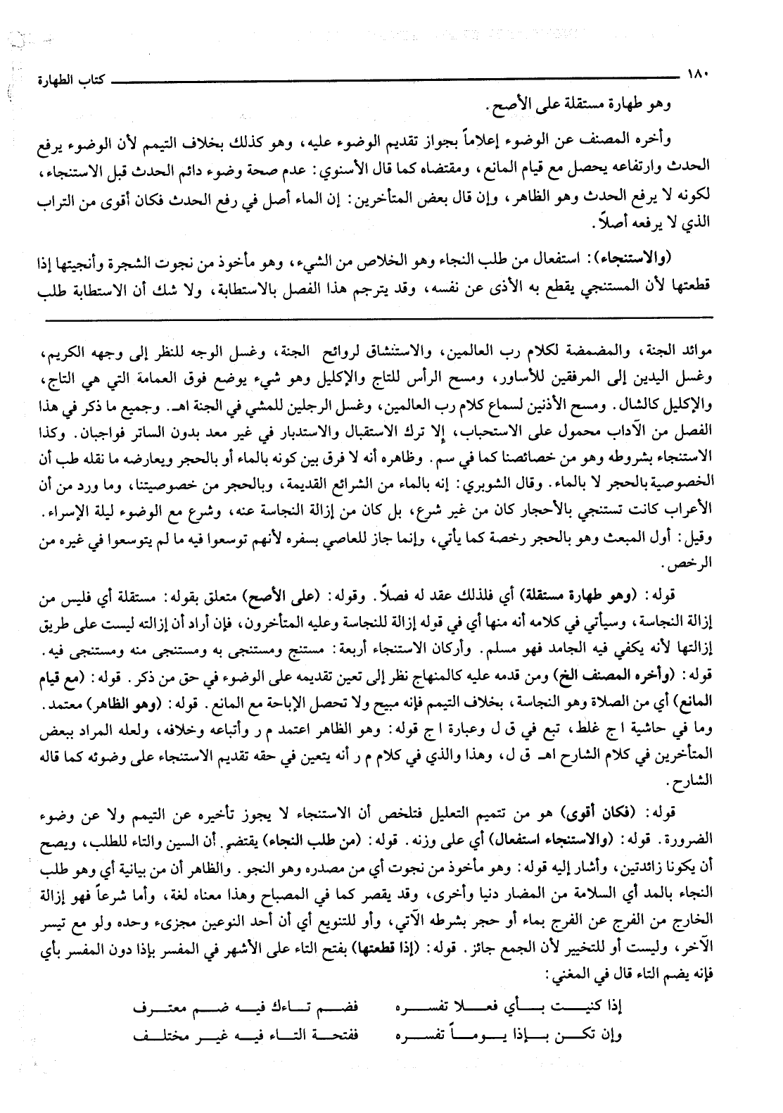 وَهُوَ طَهَارَةٌ مُسْتَقِلَّةٌ عَلَى الْأَصَحِّ. وَأَخَّرَهُ الْمُصَنِّفُ عَنْ الْوُضُوءِ إعْلَامًا بِجَوَازِ تَقْدِيمِ الْوُضُوءِ عَلَيْهِ، وَهُوَ كَذَلِكَ بِخِلَافِ التَّيَمُّمِ؛ لِأَنَّ الْوُضُوءَ يَرْفَعُ الْحَدَثَ وَارْتِفَاعُهُ يَحْصُلُ مَعَ قِيَامِ الْمَانِعِ، وَمُقْتَضَاهُ كَمَا قَالَ الْإِسْنَوِيُّ: عَدَمُ صِحَّةِ وُضُوءِ دَائِمِ الْحَدَثِ قَبْلَ الِاسْتِنْجَاءِ، لِكَوْنِهِ لَا يَرْفَعُ الْحَدَثَ وَهُوَ الظَّاهِرُ، وَإِنْ قَالَ بَعْضُ الْمُتَأَخِّرِينَ: إنَّ الْمَاءَ أَصْلٌ فِي رَفْعِ الْحَدَثِ فَكَانَ أَقْوَى مِنْ التُّرَابِ الَّذِي لَا يَرْفَعُهُ أَصْلًا. (وَالِاسْتِنْجَاءُ) اسْتِفْعَالٌ مِنْ طَلَبِ النَّجَاءِ وَهُوَ الْخَلَاصُ مِنْ الشَّيْءِ وَهُوَ مَأْخُوذٌ مِنْ نَجَوْت الشَّجَرَةَ وَأَنْجَيْتهَا إذَا قَطَعْتهَا لِأَنَّ الْمُسْتَنْجِيَ يَقْطَعُ بِهِ الْأَذَى عَنْ نَفْسِهِ وَقَدْ يُتَرْجَمُ هَذَا الْفَصْلُ بِالِاسْتِطَابَةِ وَلَا شَكَّ أَنَّ الِاسْتِطَابَةَ طَلَبُ