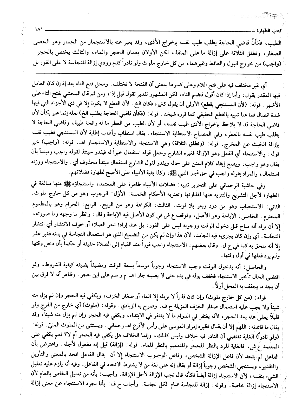 قَوْلُهُ: (وَاجِبٌ) خَبَرُ قَوْلِهِ: وَالِاسْتِنْجَاءُ أَيْ الْفِعْلُ وَهُوَ الْإِزَالَةُ فَغَيَّرَهُ الشَّارِحُ وَجَعَلَ قَوْلَهُ اسْتِفْعَالٌ خَبَرًا لَهُ فَيُقَدَّرُ حِينَئِذٍ لِقَوْلِهِ وَاجِبٍ وَمُبْتَدَأٌ بِأَنْ يُقَالَ وَهُوَ وَاجِبٌ، وَيَصِحُّ إبْقَاءُ كَلَامِ الْمَتْنِ عَلَى حَالِهِ وَيُقَدَّرُ لِقَوْلِ الشَّارِحِ اسْتِفْعَالٌ مُبْتَدَأٌ مَحْذُوفٌ أَيْ: وَالِاسْتِنْجَاءُ وَوَزْنُهُ اسْتِفْعَالٌ، وَالْمُرَادُ بِقَوْلِهِ وَاجِبٌ فِي حَقِّ غَيْرِ النَّبِيِّ - صَلَّى اللَّهُ عَلَيْهِ وَسَلَّمَ - وَكَذَا بَقِيَّةُ الْأَنْبِيَاءِ عَلَى الْأَصَحِّ لِطَهَارَةِ فَضَلَاتِهِمْ. وَفِي حَاشِيَةِ الرَّحْمَانِيِّ عَلَى التَّحْرِيرِ تَنْبِيهٌ: فَضَلَاتُ الْأَنْبِيَاءِ طَاهِرَةٌ عَلَى الْمُعْتَمَدِ، وَاسْتِنْجَاؤُهُ - صَلَّى اللَّهُ عَلَيْهِ وَسَلَّمَ - مِنْهَا مُبَالَغَةٌ فِي الطَّهَارَةِ لِأَجْلِ التَّشْرِيعِ وَالتَّنْزِيهِ عَنْهَا لِقَذَارَتِهَا وَتَعْتَرِيهِ الْأَحْكَامُ الْخَمْسَةُ: الْأَوَّلُ: الْوُجُوبُ وَهُوَ مِنْ كُلِّ خَارِجٍ مُلَوَّثٍ. الثَّانِي: الِاسْتِحْبَابُ وَهُوَ مِنْ دُودٍ وَبَعْرٍ بِلَا لَوْثٍ. الثَّالِثُ: الْكَرَاهَةُ وَهُوَ مِنْ الرِّيحِ. الرَّابِعُ: الْحَرَامُ وَهُوَ بِالْمَطْعُومِ الْمُحْتَرَمِ. الْخَامِسُ: الْإِبَاحَةُ وَهُوَ الْأَصْلُ، وَتَوَقَّفَ ع ش فِي كَوْنِ الْأَصْلِ فِيهِ الْإِبَاحَةَ، وَقَالَ: وَانْظُرْ مَا وَجْهُهُ وَمَا صُورَتُهُ، إلَّا أَنْ يُرَادَ أَنَّهُ مُبَاحٌ قَبْلَ دُخُولِ الْوَقْتِ وَوُجُوبُهُ لَيْسَ عَلَى الْفَوْرِ، بَلْ عِنْدَ إرَادَةِ نَحْوِ الصَّلَاةِ أَوْ خَوْفِ الِانْتِشَارِ أَيْ انْتِشَارِ النَّجَاسَةِ. أَيْ وَإِنْ كَانَ يُجْزِئُ فِيهِ الْجَامِدُ؛ لِأَنَّ هَذَا وَإِنْ لَمْ يَكُنْ مِنْ التَّضَمُّخِ الَّذِي هُوَ اسْتِعْمَالُ النَّجَاسَةِ فِي بَدَنِهِ فَغَيْرُ عُذْرٍ إلَّا أَنَّهُ مُلْحَقٌ بِهِ كَمَا فِي ح ل. وَقَالَ بَعْضُهُمْ: الِاسْتِنْجَاءُ وَاجِبٌ فَوْرًا عِنْدَ الْقِيَامِ إلَى الصَّلَاةِ حَقِيقَةً أَوْ حُكْمًا بِأَنْ دَخَلَ وَقْتُهَا وَلَمْ يُرِدْ فِعْلَهَا فِي أَوَّلِ وَقْتِهَا.