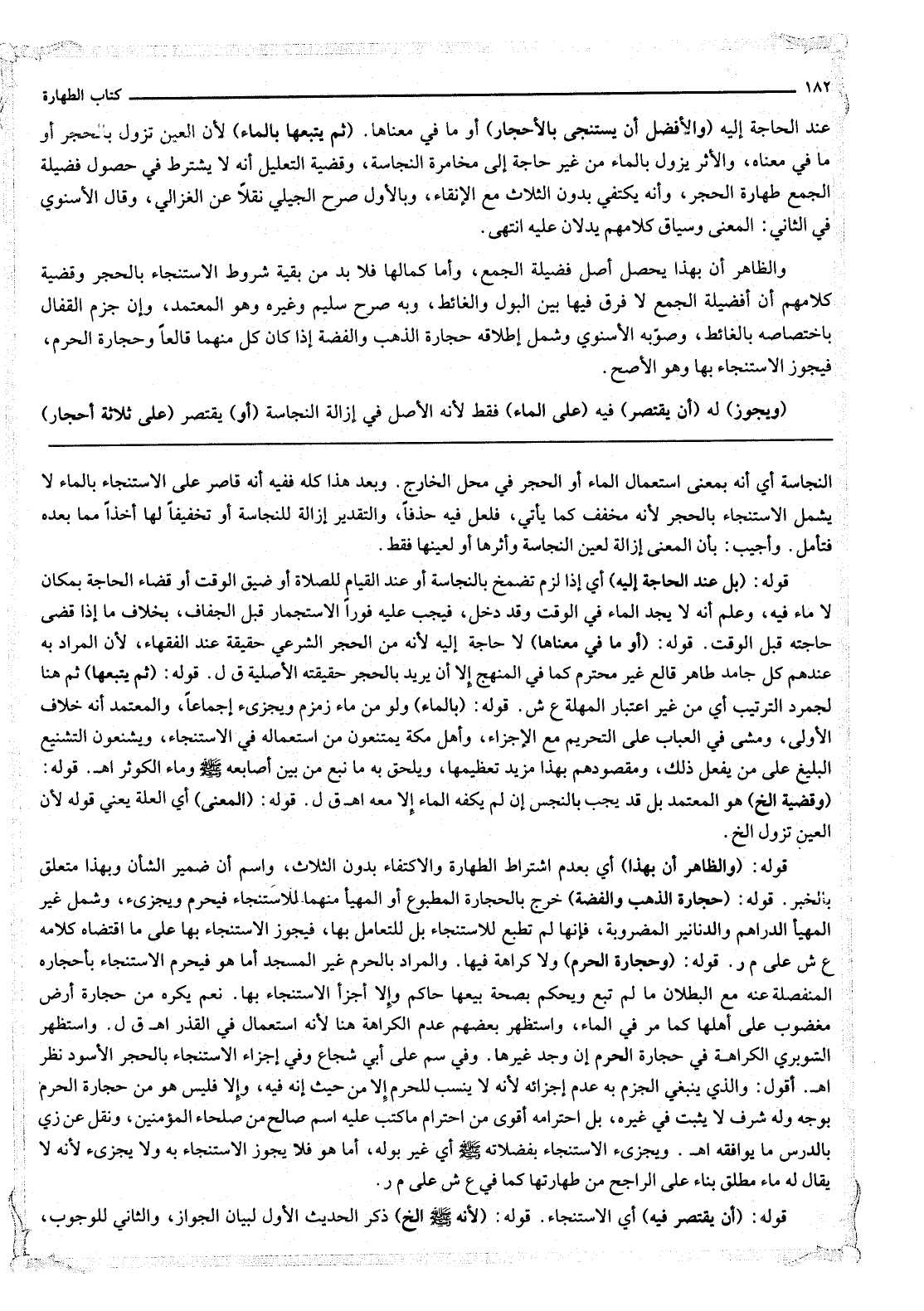 أَقُولُ: وَاَلَّذِي يَنْبَغِي الْجَزْمُ بِهِ عَدَمُ إجْزَائِهِ؛ لِأَنَّهُ لَا يُنْسَبُ لِلْحَرَمِ إلَّا مِنْ حَيْثُ إنَّهُ فِيهِ، وَإِلَّا فَلَيْسَ هُوَ مِنْ حِجَارَةِ الْحَرَمِ بِوَجْهٍ وَلَهُ شَرَفٌ لَا يَثْبُتُ فِي غَيْرِهِ، بَلْ احْتِرَامُهُ أَقْوَى مِنْ احْتِرَامِ مَا كُتِبَ عَلَيْهِ اسْمُ صَالِحٍ مِنْ صُلَحَاءِ الْمُؤْمِنِينَ، وَنَقَلَ عَنْ ز ي بِالدَّرْسِ مَا يُوَافِقُهُ. اهـ. وَيُجْزِئُ الِاسْتِنْجَاءُ بِفَضَلَاتِهِ - صَلَّى اللَّهُ عَلَيْهِ وَسَلَّمَ - أَيْ غَيْرِ بَوْلِهِ، أَمَّا هُوَ فَلَا يَجُوزُ الِاسْتِنْجَاءُ بِهِ وَلَا يُجْزِئُ؛ لِأَنَّهُ لَا يُقَالُ لَهُ مَاءٌ مُطْلَقٌ بِنَاءً عَلَى الرَّاجِحِ مِنْ طَهَارَتِهَا كَمَا فِي ع ش عَلَى م ر.