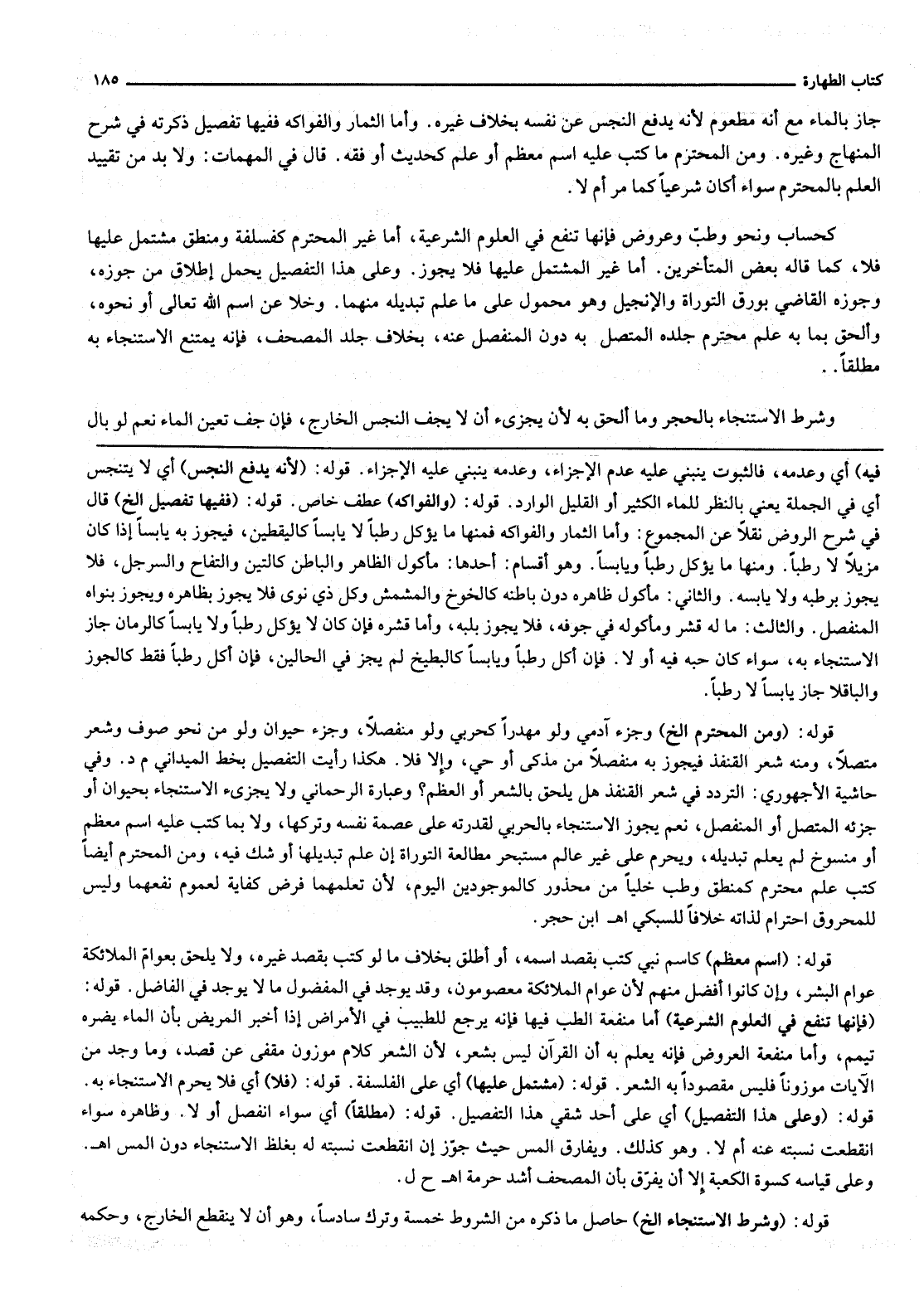 قَوْلُهُ: (وَمِنْ الْمُحْتَرَمِ إلَخْ) وَجُزْءُ آدَمِيٍّ وَلَوْ مُهْدَرًا كَحَرْبِيٍّ وَلَوْ مُنْفَصِلًا، وَجُزْءُ حَيَوَانٍ وَلَوْ مِنْ نَحْوِ صُوفٍ وَشَعْرٍ مُتَّصِلًا، وَمِنْهُ شَعْرُ الْقُنْفُذِ فَيَجُوزُ بِهِ مُنْفَصِلًا مِنْ مُذَكَّى أَوْ حَيٍّ، وَإِلَّا فَلَا. هَكَذَا رَأَيْتُ التَّفْصِيلَ بِخَطِّ الْمَيْدَانِيِّ م د. وَفِي حَاشِيَةِ الَأُجْهُورِيُّ: التَّرَدُّدُ فِي شَعْرِ الْقُنْفُذِ هَلْ يُلْحَقُ بِالشَّعْرِ أَوْ الْعَظْمِ؟ . وَعِبَارَةُ الرَّحْمَانِيِّ وَلَا يُجْزِئُ الِاسْتِنْجَاءُ بِحَيَوَانٍ أَوْ جُزْئِهِ الْمُتَّصِلِ أَوْ الْمُنْفَصِلِ، نَعَمْ يَجُوزُ الِاسْتِنْجَاءُ بِالْحَرْبِيِّ لِقُدْرَتِهِ عَلَى عِصْمَةِ نَفْسِهِ وَتَرْكِهَا، وَلَا بِمَا كُتِبَ عَلَيْهِ اسْمٌ مُعَظَّمٌ أَوْ مَنْسُوخٌ لَمْ يُعْلَمْ تَبْدِيلُهُ، وَيَحْرُمُ عَلَى غَيْرِ عَالِمٍ مُسْتَبْحِرٍ مُطَالَعَةُ التَّوْرَاةِ إنْ عَلِمَ تَبْدِيلَهَا أَوْ شَكَّ فِيهِ، وَمِنْ الْمُحْتَرَمِ أَيْضًا كُتُبُ عِلْمٍ مُحْتَرَمٍ كَمَنْطِقٍ وَطِبٍّ خَلَيَا مِنْ مَحْذُورٍ كَالْمَوْجُودِينَ الْيَوْمَ؛ لِأَنَّ تَعَلُّمَهُمَا فَرْضُ كِفَايَةٍ لِعُمُومِ نَفْعِهِمَا وَلَيْسَ لِلْمَحْرُوقِ احْتِرَامٌ لِذَاتِهِ خِلَافًا لِلسُّبْكِيِّ اهـ. ابْنُ حَجَرٍ.