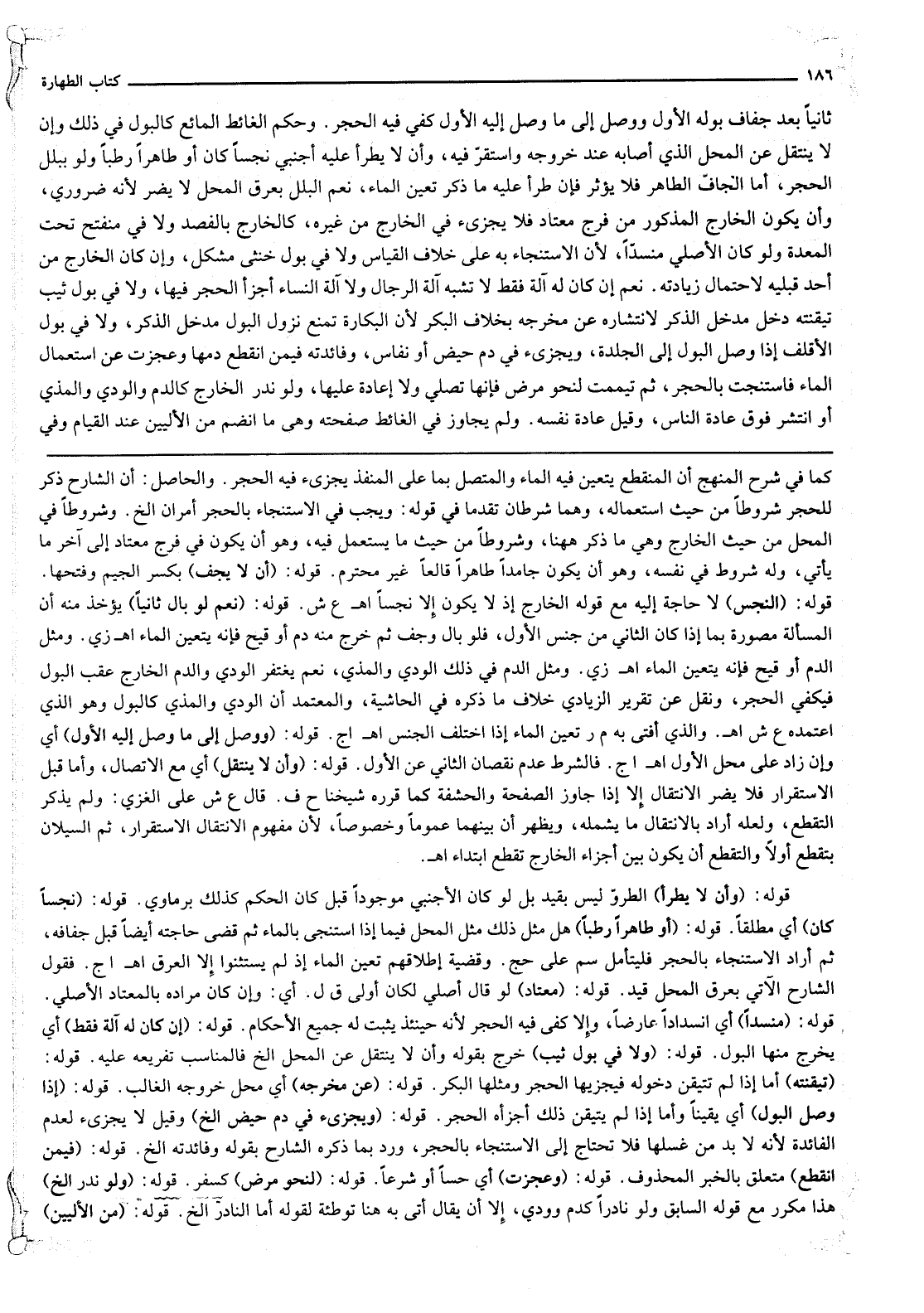 ثَانِيًا بَعْدَ جَفَافِ بَوْلِهِ الْأَوَّلِ وَوَصَلَ إلَى مَا وَصَلَ إلَيْهِ الْأَوَّلُ كَفَى فِيهِ الْحَجَرُ. وَحُكْمُ الْغَائِطِ الْمَائِعِ كَالْبَوْلِ فِي ذَلِكَ وَأَنْ لَا يَنْتَقِلَ عَنْ الْمَحَلِّ الَّذِي أَصَابَهُ عِنْدَ خُرُوجِهِ وَاسْتَقَرَّ فِيهِ، وَأَنْ لَا يَطْرَأَ عَلَيْهِ أَجْنَبِيٌّ نَجِسًا كَانَ أَوْ طَاهِرًا رَطْبًا وَلَوْ بِبَلَلِ الْحَجَرِ، أَمَّا الْجَافُّ الطَّاهِرُ فَلَا يُؤَثِّرُ فَإِنْ طَرَأَ عَلَيْهِ مَا ذُكِرَ تَعَيَّنَ الْمَاءُ، نَعَمْ الْبَلَلُ بِعَرَقِ الْمَحَلِّ لَا يَضُرُّ؛ لِأَنَّهُ ضَرُورِيٌّ، وَأَنْ يَكُونَ الْخَارِجُ الْمَذْكُورُ مِنْ فَرْجٍ مُعْتَادٍ فَلَا يُجْزِئُ فِي الْخَارِجِ مِنْ غَيْرِهِ، كَالْخَارِجِ بِالْفَصْدِ وَلَا فِي مُنْفَتِحٍ تَحْتَ الْمَعِدَةِ وَلَوْ كَانَ الْأَصْلِيُّ مُنْسَدًّا؛ لِأَنَّ الِاسْتِنْجَاءَ بِهِ عَلَى خِلَافِ الْقِيَاسِ وَلَا فِي بَوْلِ خُنْثَى مُشْكِلٍ، وَإِنْ كَانَ الْخَارِجُ مِنْ أَحَدِ قُبُلَيْهِ لِاحْتِمَالِ زِيَادَتِهِ. نَعَمْ إنْ كَانَ لَهُ آلَةٌ فَقَطْ لَا تُشْبِهُ آلَةَ الرِّجَالِ وَلَا آلَةَ النِّسَاءِ أَجْزَأَ الْحَجَرُ فِيهَا، وَلَا فِي بَوْلِ ثَيِّبٍ تَيَقَّنَتْهُ دَخَلَ مَدْخَلَ الذَّكَرِ لِانْتِشَارِهِ عَنْ مَخْرَجِهِ بِخِلَافِ الْبِكْرِ؛ لِأَنَّ الْبَكَارَةَ تَمْنَعُ نُزُولَ الْبَوْلِ مَدْخَلَ الذَّكَرِ، وَلَا فِي بَوْلِ الْأَقْلَفِ إذَا وَصَلَ الْبَوْلُ إلَى الْجِلْدَةِ، وَيُجْزِئُ فِي دَمِ حَيْضٍ أَوْ نِفَاسٍ، وَفَائِدَتُهُ فِيمَنْ انْقَطَعَ دَمُهَا وَعَجَزَتْ عَنْ اسْتِعْمَالِ الْمَاءِ فَاسْتَنْجَتْ بِالْحَجَرِ، ثُمَّ تَيَمَّمَتْ لِنَحْوِ مَرَضٍ فَإِنَّهَا تُصَلِّي وَلَا إعَادَةَ عَلَيْهَا، وَلَوْ نَدَرَ الْخَارِجُ كَالدَّمِ وَالْوَدْيِ وَالْمَذْيِ أَوْ انْتَشَرَ فَوْقَ عَادَةِ النَّاسِ، وَقِيلَ عَادَةِ نَفْسِهِ. وَلَمْ يُجَاوِزْ فِي الْغَائِطِ صَفْحَتَهُ وَهِيَ مَا انْضَمَّ مِنْ الْأَلْيَيْنِ عِنْدَ الْقِيَامِ وَفِي