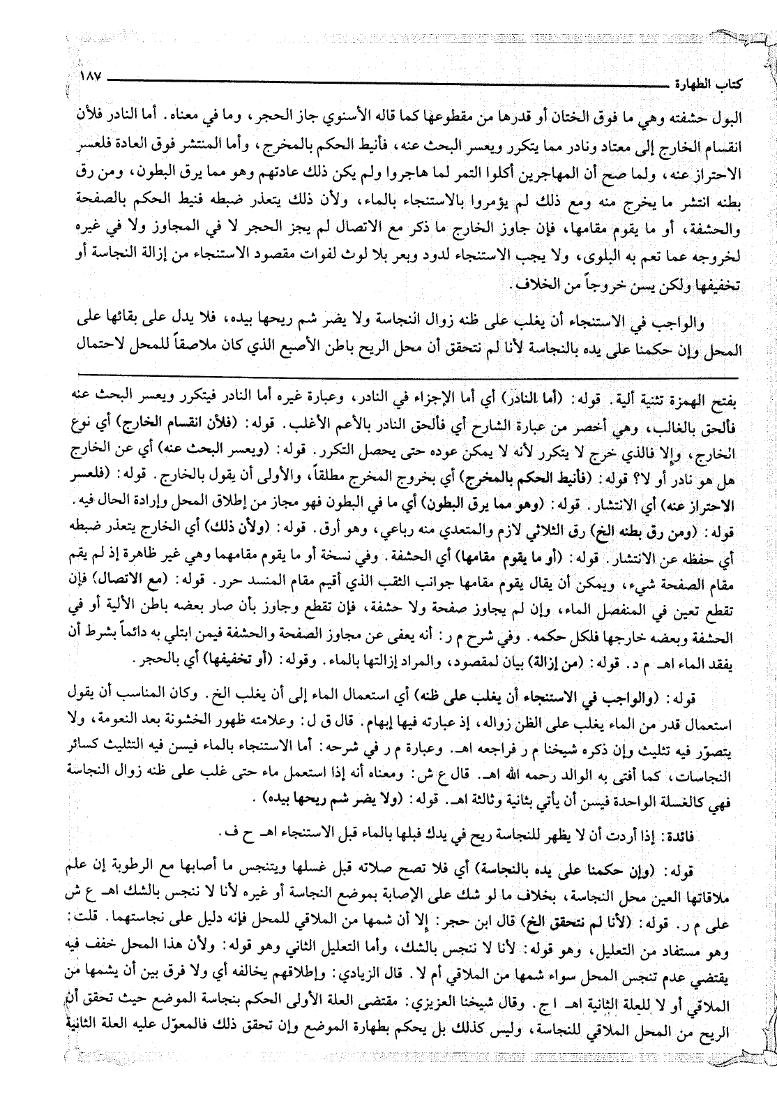 الْبَوْلِ حَشَفَتَهُ وَهِيَ مَا فَوْقَ الْخِتَانِ أَوْ قَدْرَهَا مِنْ مَقْطُوعِهَا كَمَا قَالَهُ الْإِسْنَوِيُّ جَازَ الْحَجَرُ، وَمَا فِي مَعْنَاهُ. أَمَّا النَّادِرُ فَلِأَنَّ انْقِسَامَ الْخَارِجِ إلَى مُعْتَادٍ وَنَادِرٍ مِمَّا يَتَكَرَّرُ وَيَعْسُرُ الْبَحْثُ عَنْهُ، فَأُنِيطَ الْحُكْمُ بِالْمَخْرَجِ، وَأَمَّا الْمُنْتَشِرُ فَوْقَ الْعَادَةِ فَلِعُسْرِ الِاحْتِرَازِ عَنْهُ، وَلَمَّا صَحَّ أَنَّ الْمُهَاجِرِينَ أَكَلُوا التَّمْرَ لَمَّا هَاجَرُوا وَلَمْ يَكُنْ ذَلِكَ عَادَتَهُمْ وَهُوَ مِمَّا يَرِقُّ الْبُطُونَ، وَمَنْ رَقَّ بَطْنُهُ انْتَشَرَ مَا يَخْرُجُ مِنْهُ وَمَعَ ذَلِكَ لَمْ يُؤَمَّرُوا بِالِاسْتِنْجَاءِ بِالْمَاءِ، وَلِأَنَّ ذَلِكَ يَتَعَذَّرُ ضَبْطُهُ فَنِيطَ الْحُكْمُ بِالصَّفْحَةِ وَالْحَشَفَةِ، أَوْ مَا يَقُومُ مَقَامَهَا، فَإِنْ جَاوَزَ الْخَارِجُ مَا ذُكِرَ مَعَ الِاتِّصَالِ لَمْ يَجُزْ الْحَجَرُ لَا فِي الْمُجَاوِزِ وَلَا فِي غَيْرِهِ لِخُرُوجِهِ عَمَّا تَعُمُّ بِهِ الْبَلْوَى، وَلَا يَجِبُ الِاسْتِنْجَاءُ لِدُودٍ وَبَعْرٍ بِلَا لَوْثٍ لِفَوَاتِ مَقْصُودِ الِاسْتِنْجَاءِ مِنْ إزَالَةِ النَّجَاسَةِ أَوْ تَخْفِيفِهَا وَلَكِنْ يُسَنُّ خُرُوجًا مِنْ الْخِلَافِ.