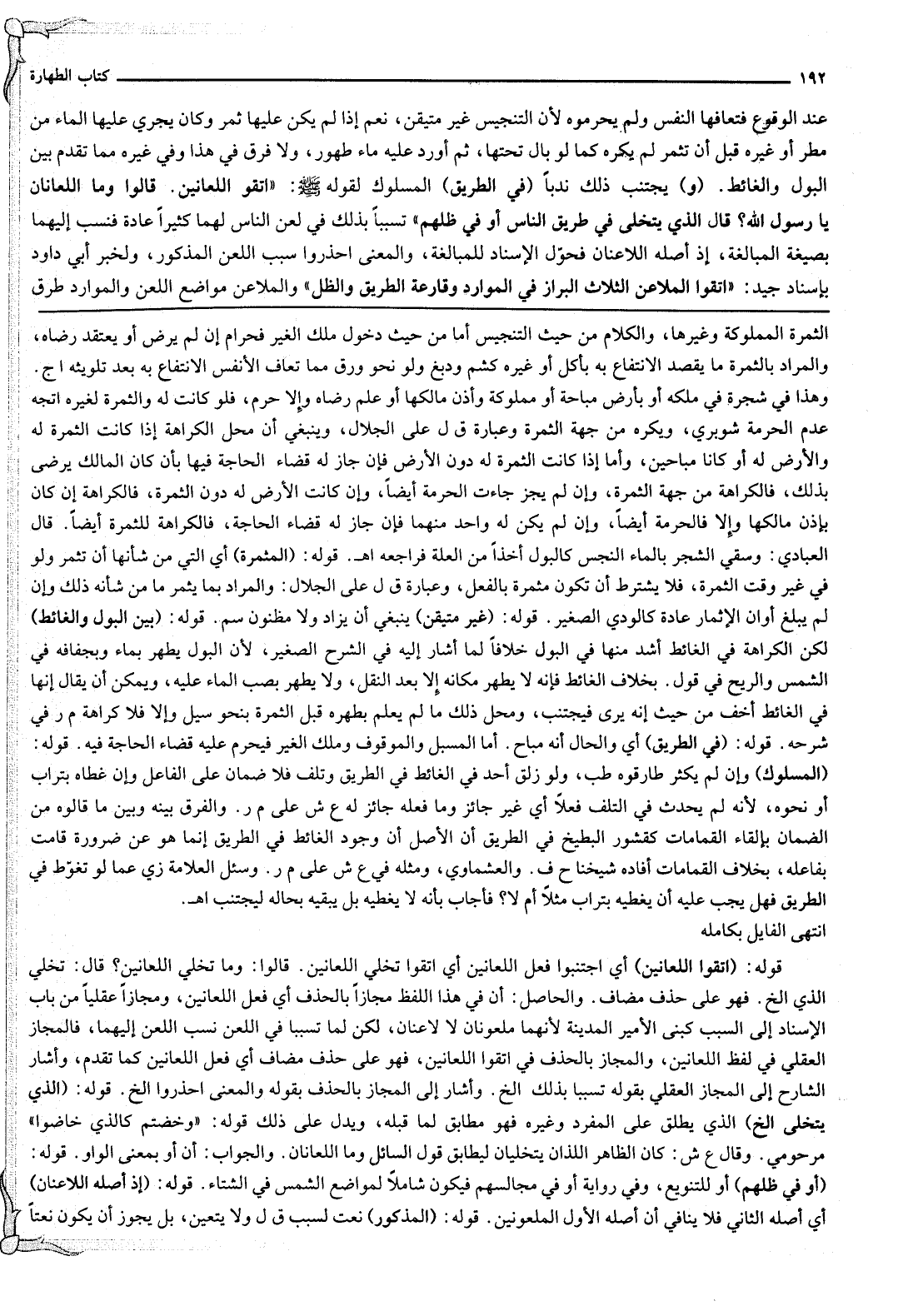 قَوْلُهُ: «اتَّقُوا اللَّعَّانَيْنِ» أَيْ اجْتَنِبُوا فِعْلَ اللَّعَّانَيْنِ أَيْ اتَّقُوا تَخَلِّي اللَّعَّانَيْنِ. «قَالُوا: وَمَا تَخَلِّي اللَّعَّانَيْنِ؟ قَالَ: تَخَلِّي الَّذِي» إلَخْ. فَهُوَ عَلَى حَذْفِ مُضَافٍ. وَالْحَاصِلُ: أَنَّ فِي هَذَا اللَّفْظِ مَجَازًا بِالْحَذْفِ أَيْ فِعْلُ اللَّعَّانَيْنِ، وَمَجَازًا عَقْلِيًّا مِنْ بَابِ الْإِسْنَادِ إلَى السَّبَبِ كَبَنَى الْأَمِيرُ الْمَدِينَةَ؛ لِأَنَّهُمَا مَلْعُونَانِ لَا لَاعِنَانِ، لَكِنْ لَمَّا تَسَبَّبَا فِي اللَّعْنِ نُسِبَ اللَّعْنُ إلَيْهِمَا، فَالْمَجَازُ الْعَقْلِيُّ فِي لَفْظِ اللَّعَّانَيْنِ، وَالْمَجَازُ بِالْحَذْفِ فِي «اتَّقُوا اللَّعَّانَيْنِ» ، فَهُوَ عَلَى حَذْفِ مُضَافٍ أَيْ فِعْلُ اللَّعَّانَيْنِ كَمَا تَقَدَّمَ، وَأَشَارَ الشَّارِحُ إلَى الْمَجَازِ الْعَقْلِيِّ بِقَوْلِهِ تَسَبَّبَا بِذَلِكَ إلَخْ. وَأَشَارَ إلَى الْمَجَازِ بِالْحَذْفِ بِقَوْلِهِ وَالْمَعْنَى احْذَرُوا إلَخْ. قَوْلُهُ: (الَّذِي يَتَخَلَّى إلَخْ) الَّذِي يُطْلَقُ عَلَى الْمُفْرَدِ وَغَيْرِهِ فَهُوَ مُطَابِقٌ لِمَا قَبْلَهُ، وَيَدُلُّ عَلَى ذَلِكَ قَوْلُهُ: {وَخُضْتُمْ كَالَّذِي خَاضُوا} [التوبة: 69] مَرْحُومِيٌّ. وَقَالَ ع ش: كَانَ الظَّاهِرُ اللَّذَانِ يَتَخَلَّيَانِ لِيُطَابِقَ قَوْلَ السَّائِلِ وَمَا اللَّعَّانَانِ. وَالْجَوَابُ: أَنَّ أَوْ بِمَعْنَى الْوَاوِ.