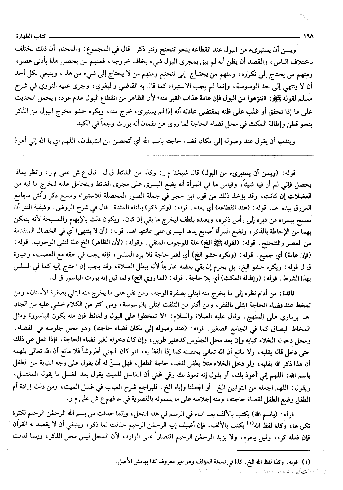 وَيُسَنُّ أَنْ يَسْتَبْرِئَ مِنْ الْبَوْلِ عِنْدَ انْقِطَاعِهِ بِنَحْوِ تَنَحْنُحٍ وَنَتْرِ ذَكَرٍ. قَالَ فِي الْمَجْمُوعِ: وَالْمُخْتَارُ أَنَّ ذَلِكَ يَخْتَلِفُ بِاخْتِلَافِ النَّاسِ، وَالْقَصْدُ أَنْ يَظُنَّ أَنَّهُ لَمْ يَبْقَ بِمَجْرَى الْبَوْلِ شَيْءٌ يَخَافُ خُرُوجَهُ، فَمِنْهُمْ مَنْ يَحْصُلُ هَذَا بِأَدْنَى عَصْرٍ، وَمِنْهُمْ مَنْ يَحْتَاجُ إلَى تَكَرُّرِهِ، وَمِنْهُمْ مَنْ يَحْتَاجُ إلَى تَنَحْنُحٍ وَمِنْهُمْ مَنْ لَا يَحْتَاجُ إلَى شَيْءٍ مِنْ هَذَا، وَيَنْبَغِي لِكُلِّ أَحَدٍ أَنْ لَا يَنْتَهِيَ إلَى حَدِّ الْوَسْوَسَةِ، وَإِنَّمَا لَمْ يَجِبْ الِاسْتِبْرَاءُ كَمَا قَالَ بِهِ الْبَغَوِيّ، وَجَرَى عَلَيْهِ النَّوَوِيُّ فِي شَرْحِ مُسْلِمٍ لِقَوْلِهِ - صَلَّى اللَّهُ عَلَيْهِ وَسَلَّمَ -: «تَنَزَّهُوا مِنْ الْبَوْلِ فَإِنَّ عَامَّةَ عَذَابِ الْقَبْرِ مِنْهُ» ؛ لِأَنَّ الظَّاهِرَ مِنْ انْقِطَاعِ الْبَوْلِ عَدَمُ عَوْدِهِ وَيُحْمَلُ الْحَدِيثُ عَلَى مَا إذَا تَحَقَّقَ أَوْ غَلَبَ عَلَى ظَنِّهِ بِمُقْتَضَى عَادَتِهِ أَنَّهُ إذَا لَمْ يَسْتَبْرِئْ خَرَجَ مِنْهُ، وَيُكْرَهُ حَشْوُ مَخْرَجِ الْبَوْلِ مِنْ الذَّكَرِ بِنَحْوِ قُطْنٍ، وَإِطَالَةُ الْمُكْثِ فِي مَحَلِّ قَضَاءِ الْحَاجَةِ لِمَا رُوِيَ عَنْ لُقْمَانَ أَنَّهُ يُورِثُ وَجَعًا فِي الْكَبِدِ.