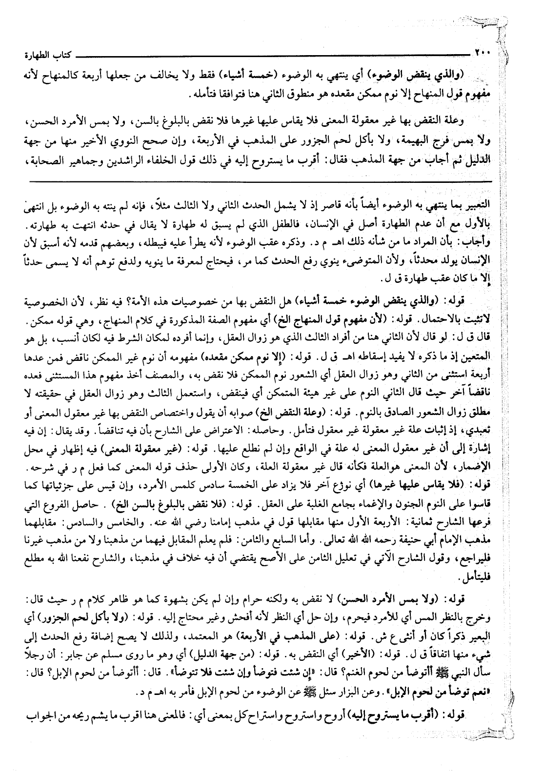 (وَاَلَّذِي يَنْقُضُ الْوُضُوءَ) أَيْ يَنْتَهِي بِهِ الْوُضُوءُ (خَمْسَةُ أَشْيَاءَ) فَقَطْ وَلَا يُخَالِفُ مَنْ جَعَلَهَا أَرْبَعَةً كَالْمِنْهَاجِ؛ لِأَنَّهُ مَفْهُومُ قَوْلِ الْمِنْهَاجِ إلَّا نَوْمَ مُمَكِّنِ مَقْعَدَهُ هُوَ مَنْطُوقُ الثَّانِي هُنَا فَتَوَافَقَا فَتَأَمَّلْهُ. وَعِلَّةُ النَّقْضِ بِهَا غَيْرُ مَعْقُولَةِ الْمَعْنَى فَلَا يُقَاسَ عَلَيْهَا غَيْرُهَا فَلَا نَقْضَ بِالْبُلُوغِ بِالسِّنِّ، وَلَا بِمَسِّ الْأَمْرَدِ الْحَسَنِ، وَلَا بِمَسِّ فَرْجِ الْبَهِيمَةِ، وَلَا بِأَكْلِ لَحْمِ الْجَزُورِ عَلَى الْمَذْهَبِ فِي الْأَرْبَعَةِ، وَإِنْ صَحَّحَ النَّوَوِيُّ الْأَخِيرَ مِنْهَا مِنْ جِهَةِ الدَّلِيلِ ثُمَّ أَجَابَ وَمِنْ جِهَةِ الْمَذْهَبِ فَقَالَ: أَقْرَبُ مَا يُسْتَرْوَحُ إلَيْهِ فِي ذَلِكَ قَوْلُ الْخُلَفَاءِ الرَّاشِدِينَ وَجَمَاهِيرِ الصَّحَابَةِ،