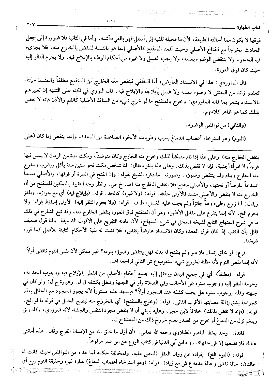 فَوْقَهَا لَا يَكُونُ مِمَّا أَحَالَتْهُ الطَّبِيعَةُ؛ لِأَنَّ مَا تُحِيلُهُ تُلْقِيهِ إلَى أَسْفَلَ فَهُوَ بِالْقَيْءِ أَشْبَهُ، وَأَمَّا فِي الثَّانِيَةِ فَلَا ضَرُورَةَ إلَى جَعْلِ الْحَادِثِ مُخْرِجًا مَعَ انْفِتَاحِ الْأَصْلِيِّ وَحَيْثُ أَقَمْنَا الْمُنْفَتِحَ كَالْأَصْلِيِّ إنَّمَا هُوَ بِالنِّسْبَةِ لِلنَّقْضِ بِالْخَارِجِ مِنْهُ، فَلَا يُجْزِئُ فِيهِ الْحَجَرُ، وَلَا يَنْتَقِضُ الْوُضُوءُ بِمَسِّهِ، وَلَا يَجِبُ الْغُسْلُ وَلَا غَيْرُهُ مِنْ أَحْكَامِ الْوَطْءِ بِالْإِيلَاجِ فِيهِ، وَلَا يَحْرُمُ النَّظَرُ إلَيْهِ حَيْثُ كَانَ فَوْقَ الْعَوْرَةِ. قَالَ الْمَاوَرْدِيُّ: هَذَا فِي الِانْسِدَادِ الْعَارِضِ، أَمَّا الْخِلْقِيُّ فَيَنْقُضُ مَعَهُ الْخَارِجُ مِنْ الْمُنْفَتِحِ مُطْلَقًا وَالْمُنْسَدُّ حِينَئِذٍ كَعُضْوٍ زَائِدٍ مِنْ الْخُنْثَى لَا وُضُوءَ بِمَسِّهِ وَلَا غُسْلَ بِإِيلَاجِهِ وَالْإِيلَاجِ فِيهِ. قَالَ النَّوَوِيُّ فِي نُكَتِهِ عَلَى التَّنْبِيهِ إنَّ تَعْبِيرَهُمْ بِالِانْسِدَادِ يُشْعِرُ بِمَا قَالَهُ الْمَاوَرْدِيُّ: وَخَرَجَ بِالْمُنْفَتِحِ مَا لَوْ خَرَجَ شَيْءٌ مِنْ الْمَنَافِذِ الْأَصْلِيَّةِ كَالْفَمِ وَالْأُذُنِ فَإِنَّهُ لَا نَقْضَ بِذَلِكَ كَمَا هُوَ ظَاهِرُ كَلَامِهِمْ.