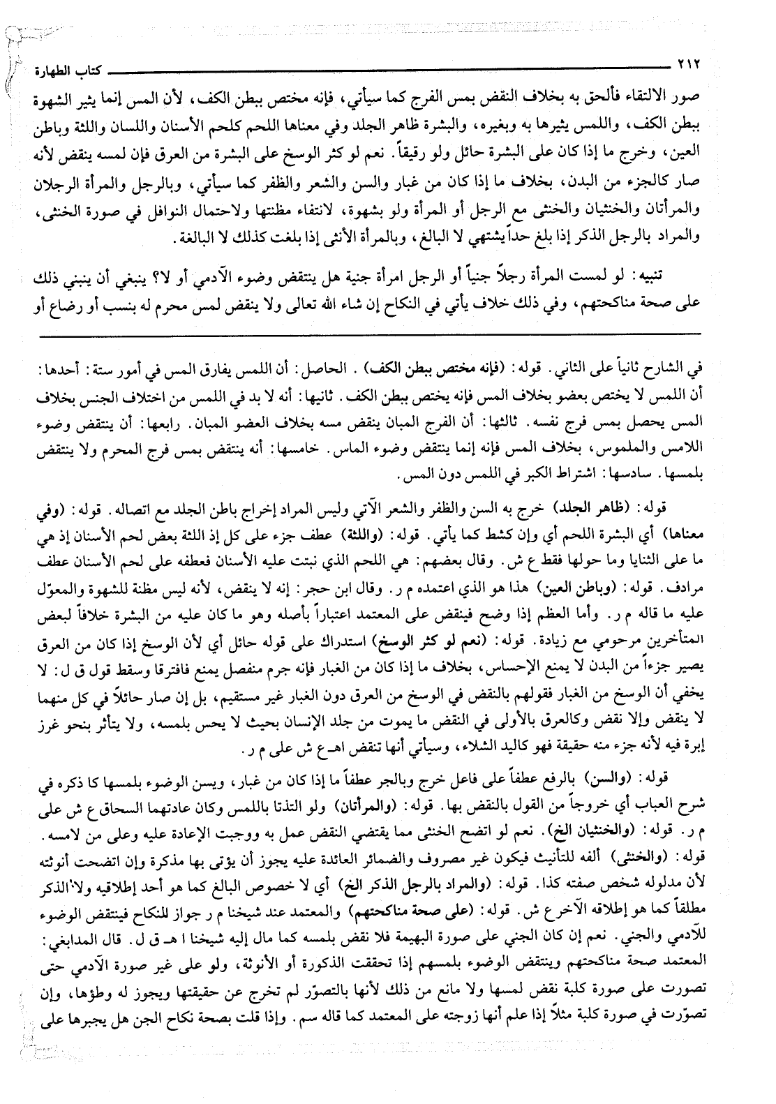 تَنْبِيهٌ: لَوْ لَمَسَتْ الْمَرْأَةُ رَجُلًا جِنِّيًّا أَوْ الرَّجُلُ امْرَأَةً جِنِّيَّةً هَلْ يَنْتَقِضُ وُضُوءُ الْآدَمِيِّ أَوْ لَا؟ يَنْبَغِي أَنْ يَنْبَنِيَ ذَلِكَ عَلَى صِحَّةِ مُنَاكَحَتِهِمْ، وَفِي ذَلِكَ خِلَافٌ يَأْتِي فِي النِّكَاحِ إنْ شَاءَ اللَّهُ تَعَالَى وَلَا يَنْقُضُ لَمْسُ مَحْرَمٍ لَهُ بِنَسَبٍ أَوْ رَضَاعٍ أَوْ