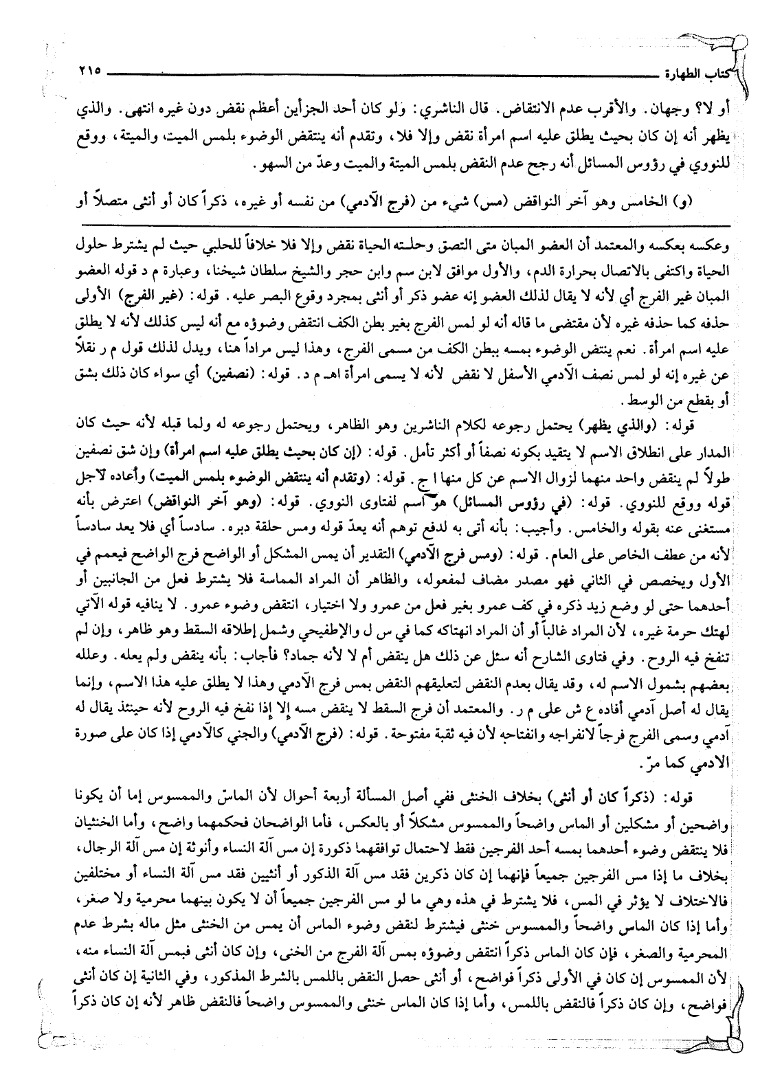 قَوْلُهُ: (ذَكَرًا كَانَ أَوْ أُنْثَى) بِخِلَافِ الْخُنْثَى فَفِي أَصْلِ الْمَسْأَلَةِ أَرْبَعَةُ أَحْوَالٍ؛ لِأَنَّ الْمَاسَّ وَالْمَمْسُوسَ إمَّا أَنْ يَكُونَا وَاضِحَيْنِ أَوْ مُشْكِلَيْنِ أَوْ الْمَاسُّ وَاضِحًا وَالْمَمْسُوسُ مُشْكِلًا أَوْ بِالْعَكْسِ، فَأَمَّا الْوَاضِحَانِ فَحُكْمُهُمَا وَاضِحٌ، وَأَمَّا الْخُنْثَيَانِ فَلَا يَنْتَقِضُ وُضُوءُ أَحَدِهِمَا بِمَسِّهِ أَحَدَ الْفَرْجَيْنِ فَقَطْ لِاحْتِمَالِ تَوَافُقِهِمَا ذُكُورَةً إنْ مَسَّ آلَةَ النِّسَاءِ وَأُنُوثَةً إنْ مَسَّ آلَةَ الرِّجَالِ، بِخِلَافِ مَا إذَا مَسَّ الْفَرْجَيْنِ جَمِيعًا فَإِنَّهُمَا إنْ كَانَ ذَكَرَيْنِ فَقَدْ مَسَّ آلَةَ الذُّكُورِ أَوْ أُنْثَيَيْنِ فَقَدْ مَسَّ آلَةَ النِّسَاءِ أَوْ مُخْتَلِفَيْنِ فَالِاخْتِلَافُ لَا يُؤَثِّرُ فِي الْمَسِّ، فَلَا يُشْتَرَطُ فِي هَذِهِ وَهِيَ مَا لَوْ مَسَّ الْفَرْجَيْنِ جَمِيعًا أَنْ لَا يَكُونَ بَيْنَهُمَا مَحْرَمِيَّةٌ وَلَا صِغَرٌ، وَأَمَّا إذَا كَانَ الْمَاسُّ وَاضِحًا وَالْمَمْسُوسُ خُنْثَى فَيُشْتَرَطُ لِنَقْضِ وُضُوءِ الْمَاسِّ أَنْ يَمَسَّ مِنْ الْخُنْثَى مِثْلَ مَا لَهُ بِشَرْطِ عَدَمِ الْمَحْرَمِيَّةِ وَالصِّغَرِ، فَإِنْ كَانَ الْمَاسُّ ذَكَرًا انْتَقَضَ وُضُوءُهُ بِمَسِّ آلَةِ الْفَرْجِ مِنْ الْخُنْثَى، وَإِنْ كَانَ أُنْثَى فَبِمَسِّ آلَةِ النِّسَاءِ مِنْهُ؛ لِأَنَّ الْمَمْسُوسَ إنْ كَانَ فِي الْأُولَى ذَكَرًا فَوَاضِحٌ، أَوْ أُنْثَى حَصَلَ النَّقْضُ بِاللَّمْسِ بِالشَّرْطِ الْمَذْكُورِ، وَفِي الثَّانِيَةِ إنْ كَانَ أُنْثَى فَوَاضِحٌ، وَإِنْ كَانَ ذَكَرًا فَالنَّقْضُ بِاللَّمْسِ، وَأَمَّا إذَا كَانَ الْمَاسُّ خُنْثَى وَالْمَمْسُوسُ وَاضِحًا فَالنَّقْضُ ظَاهِرٌ؛ لِأَنَّهُ إنْ كَانَ ذَكَرًا
