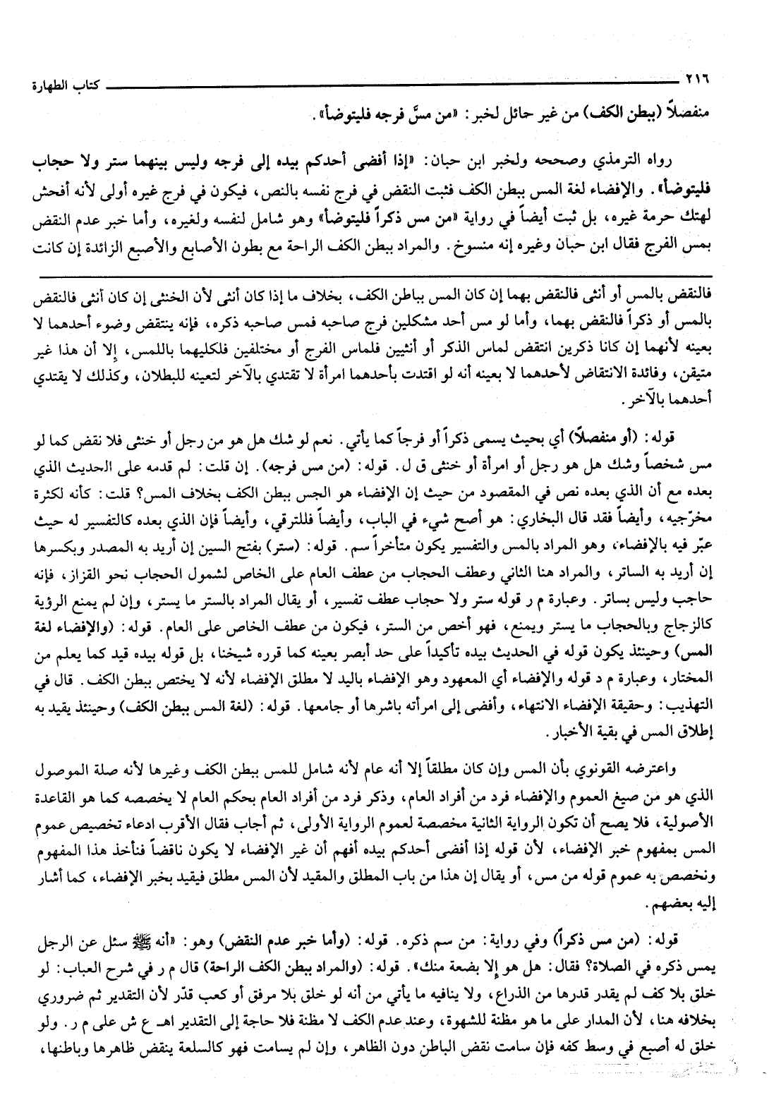 قَوْلُهُ: (مَنْ مَسَّ فَرْجَهُ) . إنْ قُلْت: لِمَ قَدَّمَهُ عَلَى الْحَدِيثِ الَّذِي بَعْدَهُ مَعَ أَنَّ الَّذِي بَعْدَهُ نَصٌّ فِي الْمَقْصُودِ مِنْ حَيْثُ إنَّ الْإِفْضَاءَ هُوَ الْجَسُّ بِبَطْنِ الْكَفِّ بِخِلَافِ الْمَسِّ؟ . قُلْت: كَأَنَّهُ لِكَثْرَةِ مُخَرِّجِيهِ، وَأَيْضًا فَقَدْ قَالَ الْبُخَارِيُّ: هُوَ أَصَحُّ شَيْء فِي الْبَابِ، وَأَيْضًا فَلِلتَّرَقِّي، وَأَيْضًا فَإِنَّ الَّذِي بَعْدَهُ كَالتَّفْسِيرِ لَهُ حَيْثُ عَبَّرَ فِيهِ بِالْإِفْضَاءِ، وَهُوَ الْمُرَادُ بِالْمَسِّ، وَالتَّفْسِيرُ يَكُونُ مُتَأَخِّرًا سم.