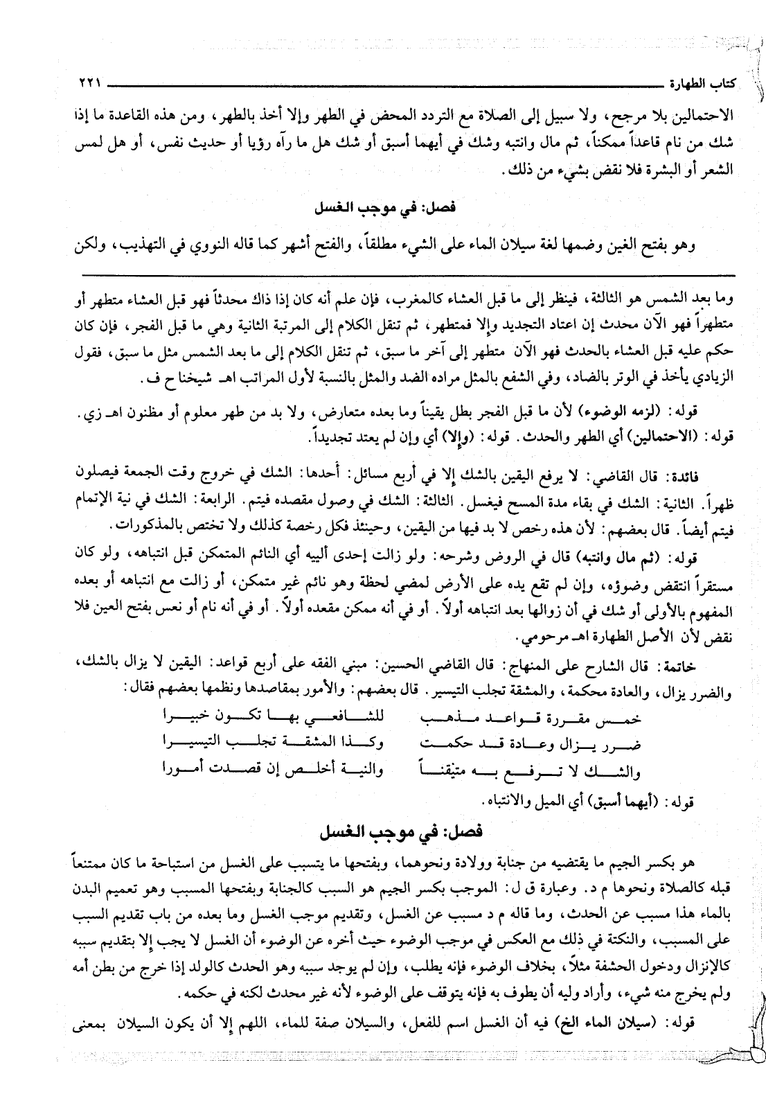خَاتِمَةٌ: قَالَ الشَّارِحُ عَلَى الْمِنْهَاجِ: قَالَ الْقَاضِي الْحُسَيْنُ: مَبْنَى الْفِقْهِ عَلَى أَرْبَعِ قَوَاعِدَ: الْيَقِينُ لَا يُزَالُ بِالشَّكِّ، وَالضَّرَرُ يُزَالُ، وَالْعَادَةُ مُحَكَّمَةٌ، وَالْمَشَقَّةُ تَجْلِبُ التَّيْسِيرَ. قَالَ بَعْضُهُمْ: وَالْأُمُورُ بِمَقَاصِدِهَا وَنَظَمَهَا بَعْضُهُمْ فَقَالَ: