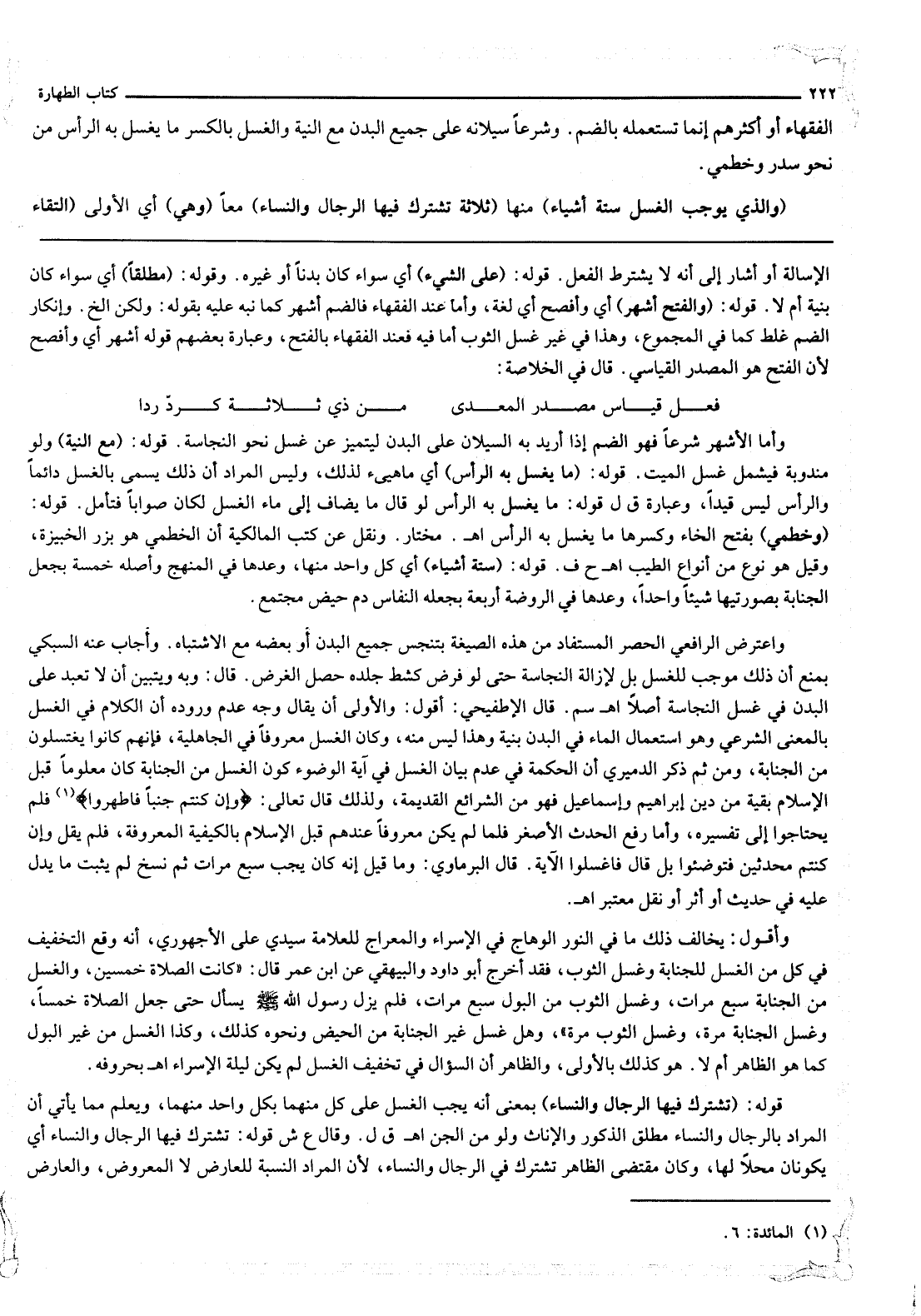 الْفُقَهَاءَ أَوْ أَكْثَرَهُمْ إنَّمَا تَسْتَعْمِلُهُ بِالضَّمِّ وَشَرْعًا سَيَلَانُهُ عَلَى جَمِيعِ الْبَدَنِ مَعَ النِّيَّةِ وَالْغِسْلُ بِالْكَسْرِ مَا يُغْسَلُ بِهِ الرَّأْسُ مِنْ نَحْوِ سِدْرٍ وَخِطْمِيٍّ. (وَاَلَّذِي يُوجِبُ الْغُسْلَ سِتَّةُ أَشْيَاءَ) مِنْهَا (ثَلَاثَةٌ تَشْتَرِكُ فِيهَا الرِّجَالُ وَالنِّسَاءُ) مَعًا (وَهِيَ) أَيْ الْأُولَى (الْتِقَاءُ