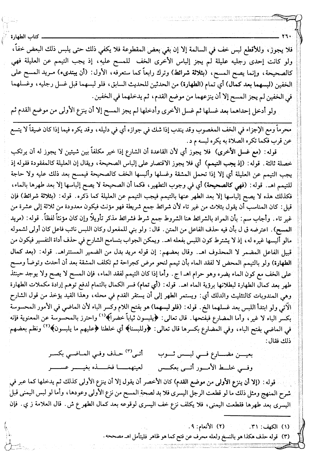 قَوْلُهُ: (بَعْدَ كَمَالِ الطَّهَارَةِ) وَلَوْ بِالتَّيَمُّمِ الْمَحْضِ لَا لِفَقْدِ الْمَاءِ بِأَنْ تَيَمَّمَ لِنَحْوِ مَرَضٍ كَجِرَاحَةٍ ثُمَّ تَكَلَّفَ الْمَشَقَّةَ بَعْدَ أَنْ أَحْدَثَ وَتَوَضَّأَ وَمَسَحَ عَلَى الْخُفِّ مَعَ كَوْنِ الْمَاءِ يَضُرُّهُ وَهُوَ حَرَامٌ اهـ اج. وَأَمَّا إذَا كَانَ التَّيَمُّمُ لِفَقْدِ الْمَاءِ، فَإِنَّ الْمَسْحَ لَا يَصِحُّ وَلَا يُوجَدُ حِينَئِذٍ طُهْرٌ بَعْدَ كَمَالِ الطَّهَارَةِ لِبُطْلَانِهَا بِرُؤْيَةِ الْمَاءِ اهـ.