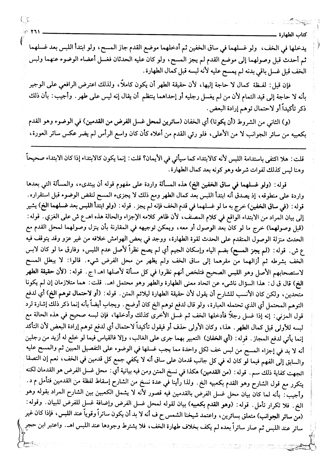 قَوْلُهُ: (لِأَنَّ حَقِيقَةَ الطُّهْرِ إلَخْ) قَالَ ق ل: هَذَا السُّؤَالُ نَاشِئٌ عَنْ اتِّحَادِ مَعْنَى الطَّهَارَةِ وَالطُّهْرِ، وَهُوَ مُحْتَمَلٌ اهـ. قُلْت: هُمَا مُتَلَازِمَانِ إنْ لَمْ يَكُونَا مُتَّحِدَيْنِ، وَلَكِنْ كَانَ الْأَنْسَبُ لِلشَّارِحِ أَنْ يَقُولَ: لِأَنَّ حَقِيقَةَ الطَّهَارَةِ لِيُلَائِمَ الْمَتْنَ. قَوْلُهُ: (أَوْ لِاحْتِمَالِ تَوَهُّمِ إلَخْ) ؛ أَيْ لِدَفْعِ التَّوَهُّمِ الْمُحْتَمَلِ أَيْ الَّذِي تَحْتَمِلُهُ الْعِبَارَةُ، وَلَوْ قَالَ: لِدَفْعِ تَوَهُّمِ إلَخْ كَانَ أَوْضَحَ. وَيُجَابُ أَيْضًا بِأَنَّهُ إنَّمَا ذَكَرَ ذَلِكَ إشَارَةً لِرَدِّ قَوْلِ الْمُزَنِيِّ: إنَّهُ إذَا غَسَلَ رِجْلًا فَأَدْخَلَهَا الْخُفَّ ثُمَّ غَسَلَ الْأُخْرَى كَذَلِكَ، وَأَدْخَلَهَا، فَإِنَّ لُبْسَهُ صَحِيحٌ فِي هَذِهِ الْحَالَةِ مَعَ لُبْسِهِ لِلْأُولَى قَبْلَ كَمَالِ الطُّهْرِ. هَذَا، وَكَانَ الْأَوْلَى حَذْفَ أَوْ فَيَقُولُ: تَأْكِيدًا لِاحْتِمَالِ أَيْ لِدَفْعِ تَوَهُّمِ إرَادَةِ الْبَعْضِ؛ لِأَنَّ التَّأَكُّدَ إنَّمَا يَأْتِي لِدَفْعِ الْمَجَازِ.