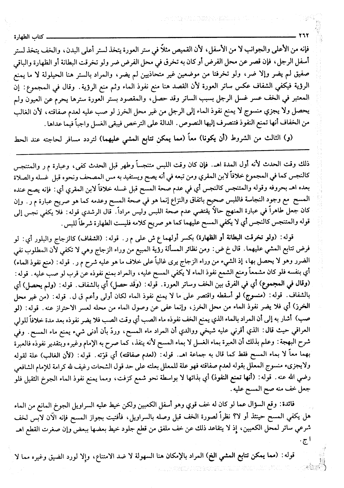 وَقَالَ فِي الْمَجْمُوعِ: إنَّ الْمُعْتَبَرَ فِي الْخُفِّ عُسْرُ غَسْلِ الرِّجْلِ بِسَبَبِ السَّاتِرِ، وَقَدْ حَصَلَ، وَالْمَقْصُودُ بِسَتْرِ الْعَوْرَةِ سَتْرُهَا بِجِرْمٍ عَنْ الْعُيُونِ، وَلَمْ يَحْصُلْ، وَلَا يُجْزِي مَنْسُوجٌ لَا يَمْنَعُ نُفُوذَ الْمَاءِ إلَى الرِّجْلِ مِنْ غَيْرِ مَحَلِّ الْخَرَزِ لَوْ صُبَّ عَلَيْهِ لِعَدَمِ صَفَاقَتِهِ؛ لِأَنَّ الْغَالِبَ مِنْ الْخِفَافِ أَنَّهَا تَمْنَعُ النُّفُوذَ فَتَنْصَرِفُ إلَيْهَا النُّصُوصُ. الدَّالَّةُ عَلَى التَّرَخُّصِ فَيَبْقَى الْغُسْلُ وَاجِبًا فِيمَا عَدَاهَا.