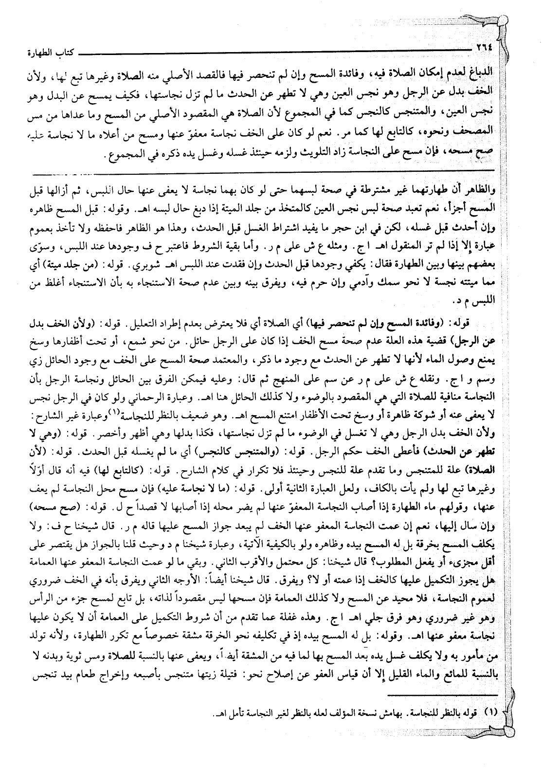 الدِّبَاغِ لِعَدَمِ إمْكَانِ الصَّلَاةِ فِيهِ، وَفَائِدَةُ الْمَسْحِ، وَإِنْ لَمْ تَنْحَصِرْ فِيهَا فَالْقَصْدُ الْأَصْلِيُّ مِنْهُ الصَّلَاةُ، وَغَيْرُهَا تَبَعٌ لَهَا؛ وَلِأَنَّ الْخُفَّ بَدَلٌ عَنْ الرِّجْلِ، وَهُوَ نَجِسُ الْعَيْنِ وَهِيَ لَا تَطْهُرُ عَنْ الْحَدَثِ مَا لَمْ تَزُلْ نَجَاسَتُهَا، فَكَيْفَ يُمْسَحُ عَنْ الْبَدَلِ وَهُوَ نَجِسُ الْعَيْنِ، وَالْمُتَنَجِّسُ كَالنَّجِسِ كَمَا فِي الْمَجْمُوعِ لِأَنَّ الصَّلَاةَ هِيَ الْمَقْصُودُ الْأَصْلِيُّ مِنْ الْمَسْحِ، وَمَا عَدَاهَا مِنْ مَسِّ الْمُصْحَفِ وَنَحْوِهِ، كَالتَّابِعِ لَهَا كَمَا مَرَّ.