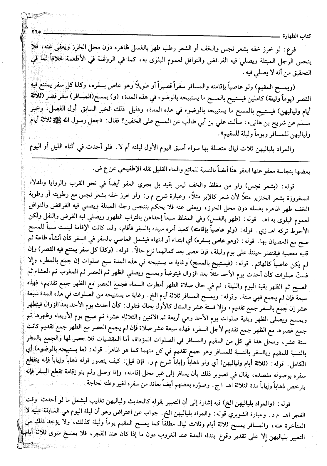 (وَيَمْسَحُ الْمُقِيمُ) وَلَوْ عَاصِيًا بِإِقَامَتِهِ وَالْمُسَافِرُ سَفَرًا قَصِيرًا أَوْ طَوِيلًا وَهُوَ عَاصٍ بِسَفَرِهِ، وَكَذَا كُلُّ سَفَرٍ يَمْتَنِعُ فِيهِ الْقَصْرُ (يَوْمًا وَلَيْلَةً) كَامِلَيْنِ فَيَسْتَبِيحُ بِالْمَسْحِ مَا يَسْتَبِيحُهُ بِالْوُضُوءِ فِي هَذِهِ الْمُدَّةِ، (وَ) يَمْسَحُ (الْمُسَافِرُ) سَفَرَ قَصْرٍ (ثَلَاثَةَ أَيَّامٍ وَلَيَالِيهِنَّ) فَيَسْتَبِيحُ بِالْمَسْحِ مَا يَسْتَبِيحُهُ بِالْوُضُوءِ فِي هَذِهِ الْمُدَّةِ، وَدَلِيلُ ذَلِكَ الْخَبَرُ السَّابِقُ أَوَّلَ الْفَصْلِ، وَخَبَرُ مُسْلِمٍ عَنْ شُرَيْحِ بْنِ هَانِئٍ: سَأَلَ عَلِيَّ بْنَ أَبِي طَالِبٍ عَنْ الْمَسْحِ عَلَى الْخُفَّيْنِ؟ فَقَالَ: «جَعَلَ رَسُولُ اللَّهِ - صَلَّى اللَّهُ عَلَيْهِ وَسَلَّمَ - ثَلَاثَةَ أَيَّامٍ وَلَيَالِيهِنَّ لِلْمُسَافِرِ وَيَوْمًا وَلَيْلَةً لِلْمُقِيمِ» . وَالْمُرَادُ بِلَيَالِيِهِنَّ ثَلَاثُ لَيَالٍ مُتَّصِلَةٍ بِهَا سَوَاءٌ أَسَبَقَ الْيَوْمَ الْأَوَّلَ لَيْلَتُهُ أَمْ لَا. فَلَوْ أَحْدَثَ فِي أَثْنَاءِ اللَّيْلِ أَوْ الْيَوْمِ