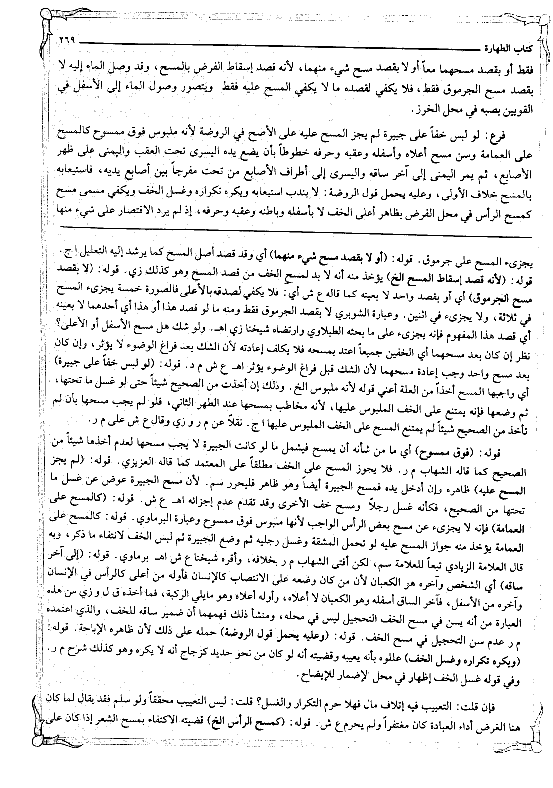 قَوْلُهُ: (وَعَلَيْهِ يُحْمَلُ قَوْلُ الرَّوْضَةِ) حَمَلَهُ عَلَى ذَلِكَ لِأَنَّ ظَاهِرَهُ الْإِبَاحَةُ. قَوْلُهُ: (وَيُكْرَهُ تَكْرَارُهُ وَغَسْلُ الْخُفِّ) عَلَّلُوهُ بِأَنَّهُ يَعِيبُهُ وَقَضِيَّتُهُ أَنَّهُ لَوْ كَانَ مِنْ نَحْوِ حَدِيدٍ كَزُجَاجٍ أَنَّهُ لَا يُكْرَهُ وَهُوَ كَذَلِكَ شَرْحُ م ر. وَفِي قَوْلِهِ غَسْلُ الْخُفِّ إظْهَارٌ فِي مَحَلِّ الْإِضْمَارِ لِلْإِيضَاحِ. فَإِنْ قُلْت: التَّعْيِيبُ فِيهِ إتْلَافُ مَالٍ فَهَلَّا حَرُمَ التَّكْرَارُ وَالْغَسْلُ؟ قُلْت: لَيْسَ التَّعْيِيبُ مُحَقَّقًا، وَلَوْ سُلِّمَ فَقَدْ يُقَالُ: لَمَّا كَانَ هُنَا الْغَرَضُ أَدَاءَ الْعِبَادَةِ كَانَ مُغْتَفَرًا وَلَمْ يَحْرُمْ ع ش. قَوْلُهُ: (كَمَسْحِ الرَّأْسِ إلَخْ) قَضِيَّتُهُ الِاكْتِفَاءُ بِمَسْحِ الشَّعْرِ إذَا كَانَ عَلَى