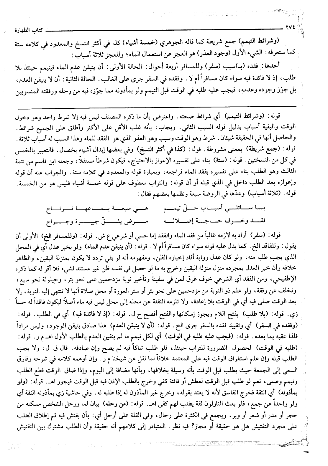 (وَشَرَائِطُ التَّيَمُّمِ) جَمْعُ شَرِيطَةٍ كَمَا قَالَهُ الْجَوْهَرِيُّ (خَمْسَةُ أَشْيَاءَ) كَذَا فِي أَكْثَرِ النُّسَخِ، وَالْمَعْدُودُ فِي كَلَامِهِ سِتَّةٌ كَمَا سَتَعْرِفُهُ: الشَّيْءُ الْأَوَّلُ (وُجُودُ الْعُذْرِ) هُوَ الْعَجْزُ عَنْ اسْتِعْمَالِ الْمَاءِ؛ وَلِلْعَجْزِ ثَلَاثَةُ أَسْبَابٍ: أَحَدُهَا: فَقْدُهُ (بِ) سَبَبِ (سَفَرٍ) وَلِلْمُسَافِرِ أَرْبَعَةُ أَحْوَالٍ: الْحَالَةُ الْأُولَى: أَنْ يَتَيَقَّنَ عَدَمَ الْمَاءِ فَيَتَيَمَّمُ حِينَئِذٍ بِلَا طَلَبٍ؛ إذْ لَا فَائِدَةَ فِيهِ سَوَاءٌ كَانَ مُسَافِرًا أَمْ لَا.