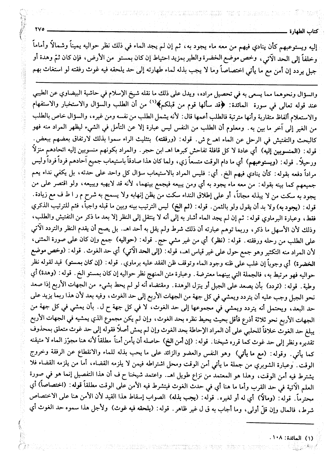 إلَيْهِ وَيَسْتَوْعِبُهُمْ كَأَنْ يُنَادِيَ فِيهِمْ مَنْ مَعَهُ مَاءٌ يَجُودُ بِهِ، ثُمَّ إنْ لَمْ يَجِدْ الْمَاءَ فِي ذَلِكَ نَظَرَ حَوَالَيْهِ يَمِينًا وَشِمَالًا وَأَمَامًا وَخَلْفًا إلَى الْحَدِّ الْآتِي، وَخَصَّ مَوْضِعَ الْخُضْرَةِ وَالطَّيْرِ بِمَزِيدِ احْتِيَاطٍ إنْ كَانَ بِمُسْتَوٍ مِنْ الْأَرْضِ، فَإِنْ كَانَ ثَمَّ وَهْدَةٌ أَوْ جَبَلٌ يُرَدِّدُ إنْ أَمِنَ مَعَ مَا يَأْتِي اخْتِصَاصًا، وَمَا لَا يَجِبُ بَذْلُهُ لِمَاءِ طَهَارَتِهِ إلَى حَدٍّ يَلْحَقُهُ فِيهِ غَوْثُ رُفْقَتِهِ لَوْ اسْتَغَاثَ بِهِ