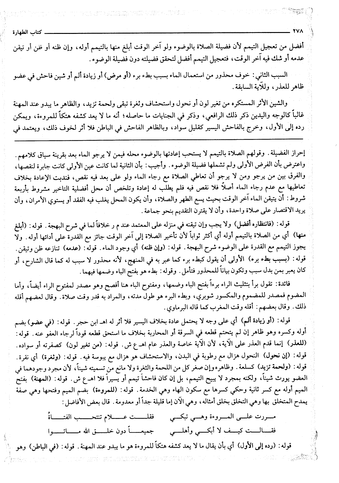 السَّبَبُ الثَّانِي: خَوْفُ مَحْذُورٍ مِنْ اسْتِعْمَالِ الْمَاءِ بِسَبَبِ بُطْءِ بُرْءٍ (أَوْ مَرَضٍ) أَوْ زِيَادَةِ أَلَمٍ أَوْ شَيْنٍ فَاحِشٍ فِي عُضْوٍ ظَاهِرٍ لِلْعُذْرِ، وَلِلْآيَةِ السَّابِقَةِ. وَالشَّيْنُ الْأَثَرُ الْمُسْتَكْرَهُ مِنْ تَغَيُّرِ لَوْنٍ أَوْ نُحُولٍ وَاسْتِحْشَافٍ وَثُغْرَةٍ تَبْقَى وَلَحْمَةٍ تَزِيدُ، وَالظَّاهِرُ: مَا يَبْدُو عِنْدَ الْمِهْنَةِ غَالِبًا كَالْوَجْهِ وَالْيَدَيْنِ ذَكَرَ ذَلِكَ الرَّافِعِيُّ، وَذَكَرَ فِي الْجِنَايَاتِ مَا حَاصِلُهُ؛ أَنَّهُ مَا لَا يُعَدُّ كَشْفُهُ هَتْكًا لِلْمُرُوءَةِ، وَيُمْكِنُ رَدُّهُ إلَى الْأَوَّلِ، وَخَرَجَ بِالْفَاحِشِ الْيَسِيرُ كَقَلِيلِ سَوَادٍ، وَبِالظَّاهِرِ الْفَاحِشُ فِي الْبَاطِنِ فَلَا أَثَرَ لِخَوْفِ ذَلِكَ، وَيُعْتَمَدُ فِي