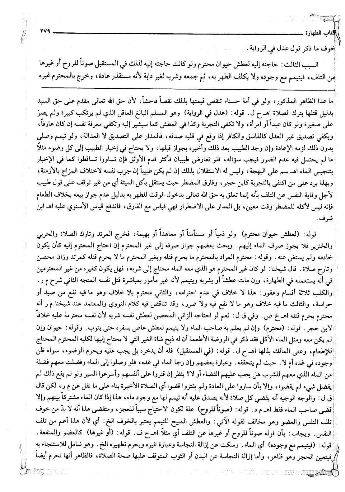 قَوْلُهُ: (لِعَطَشِ حَيَوَانٍ مُحْتَرَمٍ) وَلَوْ ذِمِّيًّا أَوْ مُسْتَأْمَنًا أَوْ مُعَاهَدًا أَوْ بَهِيمَةً، فَخَرَجَ الْمُرْتَدُّ وَتَارِكُ الصَّلَاةِ وَالْحَرْبِيُّ وَالْخِنْزِيرُ فَلَا يَجُوزُ صَرْفُ الْمَاءِ إلَيْهِمْ. وَبَحَثَ بَعْضُهُمْ جَوَازَ صَرْفِهِ إلَى غَيْرِ الْمُحْتَرَمِ إنْ احْتَاجَ الْمُحْتَرَمُ إلَيْهِ كَأَنْ يَكُونَ خَادِمُهُ، وَلَمْ يَسْتَغْنِ عَنْهُ. وَقَوْلُهُ: مُحْتَرَمٌ الْمُرَادُ بِالْمُحْتَرَمِ مَا يَحْرُمُ قَتْلُهُ وَبِغَيْرِ الْمُحْتَرَمِ مَا لَا يَحْرُمُ قَتْلُهُ كَمُرْتَدٍّ وَزَانٍ مُحْصَنٍ وَتَارِكِ صَلَاةٍ. قَالَ شَيْخُنَا: لَوْ كَانَ غَيْرُ الْمُحْتَرَمِ هُوَ الَّذِي مَعَهُ الْمَاءُ مُحْتَاجًا إلَى شُرْبِهِ، فَهَلْ يَكُونُ كَغَيْرِهِ مِنْ غَيْرِ الْمُحْتَرَمِينَ فِي أَنَّهُ يَسْتَعْمِلُهُ فِي الطَّهَارَةِ، وَإِنْ مَاتَ عَطَشًا أَوْ يَشْرَبُهُ وَيَتَيَمَّمُ؛ لِأَنَّهُ غَيْرُ مَأْمُورٍ بِمُبَاشَرَةِ قَتْلِ نَفْسِهِ، الْمُتَّجَهُ الثَّانِي شَرْحُ م ر. وَالْكَلْبُ ثَلَاثَةُ أَقْسَامٍ عَقُورٌ: هَذَا لَا خِلَافَ فِي عَدَمِ احْتِرَامِهِ، وَالثَّانِي مُحْتَرَمٌ بِلَا خِلَافٍ، وَهُوَ مَا فِيهِ نَفْعٌ مِنْ صَيْدٍ أَوْ حِرَاسَةٍ، وَالثَّالِثُ: مَا فِيهِ خِلَافٌ، وَهُوَ مَا لَا نَفْعَ فِيهِ، وَلَا ضَرَرَ، وَقَدْ تَنَاقَضَ فِيهِ كَلَامُ النَّوَوِيِّ وَالْمُعْتَمَدُ عِنْدَ شَيْخِنَا م ر أَنَّهُ مُحْتَرَمٌ يَحْرُمُ قَتْلُهُ اهـ خ ض. وَفِي ق ل: نَعَمْ لَوْ احْتَاجَهُ الزَّانِي الْمُحْصَنُ لِعَطَشِ نَفْسِهِ شَرِبَهُ؛ لِأَنَّ نَفْسَهُ مُحْتَرَمَةٌ عَلَيْهِ خِلَافًا لِابْنِ حَجَرٍ.