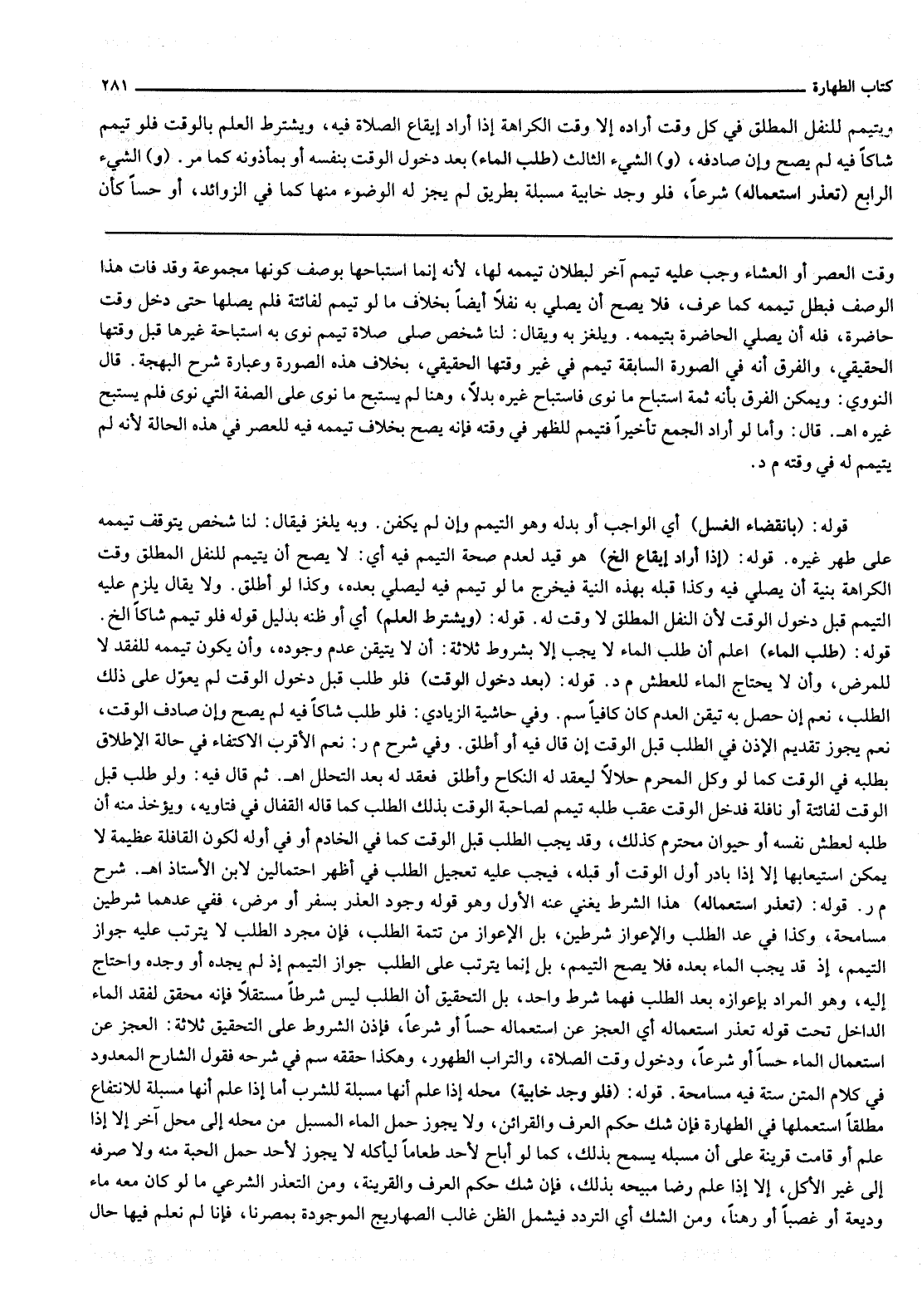 قَوْلُهُ: (تَعَذُّرُ اسْتِعْمَالِهِ) هَذَا الشَّرْطُ يُغْنِي عَنْهُ الْأَوَّلُ وَهُوَ قَوْلُهُ وُجُودُ الْعُذْرِ بِسَفَرٍ أَوْ مَرَضٍ، فَفِي عَدِّهِمَا شَرْطَيْنِ مُسَامَحَةٌ، وَكَذَا فِي عَدِّ الطَّلَبِ وَالْإِعْوَازِ شَرْطَيْنِ، بَلْ الْإِعْوَازُ مِنْ تَتِمَّةِ الطَّلَبِ، فَإِنَّ مُجَرَّدَ الطَّلَبِ لَا يَتَرَتَّبُ عَلَيْهِ جَوَازُ التَّيَمُّمِ؛ إذْ قَدْ يَجِبُ الْمَاءُ بَعْدَهُ فَلَا يَصِحُّ التَّيَمُّمُ، بَلْ إنَّمَا يَتَرَتَّبُ عَلَى الطَّلَبِ جَوَازُ التَّيَمُّمِ؛ إذْ لَمْ يَجِدْهُ أَوْ وَجَدَهُ وَاحْتَاجَ إلَيْهِ، وَهُوَ الْمُرَادُ بِإِعْوَازِهِ بَعْدَ الطَّلَبِ فَهُمَا شَرْطٌ وَاحِدٌ، بَلْ التَّحْقِيقُ أَنَّ الطَّلَبَ لَيْسَ شَرْطًا مُسْتَقِلًّا فَإِنَّهُ مُحَقِّقٌ لِفَقْدِ الْمَاءِ الدَّاخِلِ تَحْتَ قَوْلِهِ (تَعَذُّرُ اسْتِعْمَالِهِ) أَيْ الْعَجْزُ عَنْ اسْتِعْمَالِهِ حِسًّا أَوْ شَرْعًا، فَإِذَنْ الشُّرُوطُ عَلَى التَّحْقِيقِ ثَلَاثَةٌ: الْعَجْزُ عَنْ اسْتِعْمَالِ الْمَاءِ حِسًّا أَوْ شَرْعًا، وَدُخُولُ وَقْتِ الصَّلَاةِ، وَالتُّرَابُ الطَّهُورُ، وَهَكَذَا حَقَّقَهُ سم فِي شَرْحِهِ فَقَوْلُ الشَّارِحِ الْمَعْدُودُ فِي كَلَامِ الْمَتْنِ سِتَّةٌ فِيهِ مُسَامَحَةٌ. قَوْلُهُ (فَلَوْ وَجَدَ خَابِيَةً) مَحَلُّهُ إذَا عَلِمَ أَنَّهَا مُسَبَّلَةٌ لِلشُّرْبِ أَمَّا إذَا عَلِمَ أَنَّهَا مُسَبَّلَةٌ لِلِانْتِفَاعِ مُطْلَقًا اسْتَعْمَلَهَا فِي الطَّهَارَةِ فَإِنْ شَكَّ حَكَّمَ الْعُرْفَ وَالْقَرَائِنَ، وَلَا يَجُوزُ حَمْلُ الْمَاءِ الْمُسَبَّلِ مِنْ مَحَلِّهِ إلَى مَحَلٍّ آخَرَ إلَّا إذَا عَلِمَ أَوْ قَامَتْ قَرِينَةٌ عَلَى أَنَّ مُسَبِّلَهُ يَسْمَحُ بِذَلِكَ، كَمَا لَوْ أَبَاحَ لِأَحَدٍ طَعَامًا لِيَأْكُلَهُ لَا يَجُوزُ لِأَحَدٍ حَمْلُ الْحَبَّةِ مِنْهُ، وَلَا صَرْفُهُ إلَى غَيْرِ الْأَكْلِ، إلَّا إذَا عَلِمَ رِضَا مُبِيحِهِ بِذَلِكَ، فَإِنَّ شَكَّ حَكَّمَ الْعُرْفَ وَالْقَرِينَةَ، وَمِنْ التَّعَذُّرِ الشَّرْعِيِّ مَا لَوْ كَانَ مَعَهُ مَاءٌ وَدِيعَةً أَوْ غَصْبًا أَوْ رَهْنًا، وَمِنْ الشَّكِّ أَيْ التَّرَدُّدِ فَيَشْمَلُ الظَّنُّ غَالِبَ الصَّهَارِيجِ الْمَوْجُودَةِ بِمِصْرِنَا، فَإِنَّا لَمْ نَعْلَمْ فِيهَا حَالَ