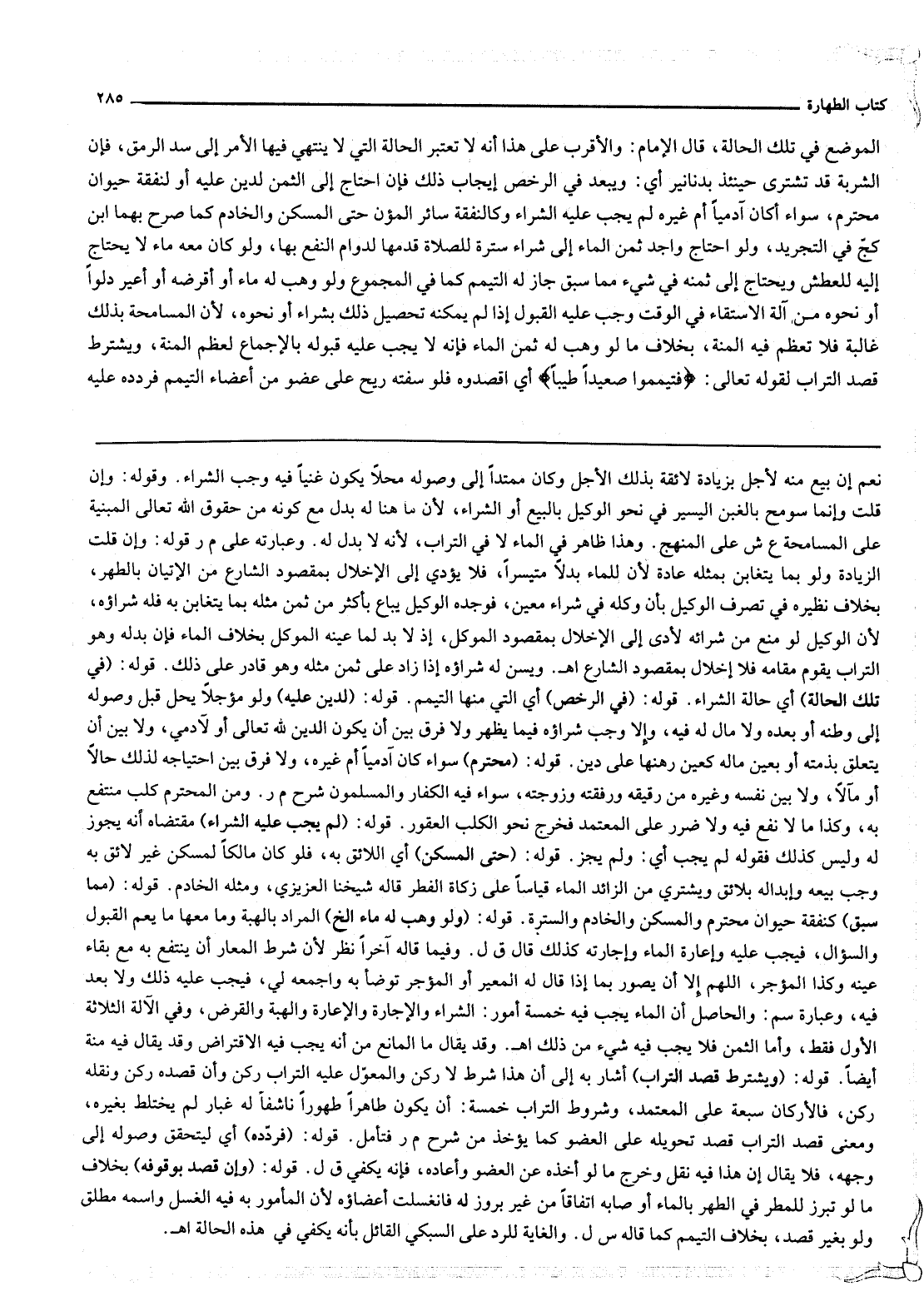 الْمَوْضِعِ فِي تِلْكَ الْحَالَةِ، قَالَ الْإِمَامُ: وَالْأَقْرَبُ عَلَى هَذَا أَنَّهُ لَا تُعْتَبَرُ الْحَالَةُ الَّتِي لَا يَنْتَهِي فِيهَا الْأَمْرُ إلَى سَدِّ الرَّمَقِ، فَإِنَّ الشَّرْبَةَ قَدْ تُشْتَرَى حِينَئِذٍ بِدَنَانِيرَ أَيْ: وَيَبْعُدُ فِي الرُّخَصِ إيجَابُ ذَلِكَ فَإِنْ احْتَاجَ إلَى الثَّمَنِ لِدَيْنٍ عَلَيْهِ أَوْ لِنَفَقَةِ حَيَوَانٍ مُحْتَرَمٍ، سَوَاءٌ كَانَ آدَمِيًّا أَمْ غَيْرَهُ لَمْ يَجِبْ عَلَيْهِ الشِّرَاءُ وَكَالنَّفَقَةِ سَائِرُ الْمُؤَنِ حَتَّى الْمَسْكَنِ وَالْخَادِمِ كَمَا صَرَّحَ بِهِمَا ابْنُ كَجٍّ فِي التَّجْرِيدِ، وَلَوْ احْتَاجَ وَاجِدُ ثَمَنِ الْمَاءِ إلَى شِرَاءِ سُتْرَةٍ لِلصَّلَاةِ قَدَّمَهَا لِدَوَامِ النَّفْعِ بِهَا، وَلَوْ كَانَ مَعَهُ مَاءٌ لَا يَحْتَاجُ إلَيْهِ لِلْعَطَشِ، وَيَحْتَاجُ إلَى ثَمَنِهِ فِي شَيْءٍ مِمَّا سَبَقَ جَازَ لَهُ التَّيَمُّمُ كَمَا فِي الْمَجْمُوعِ