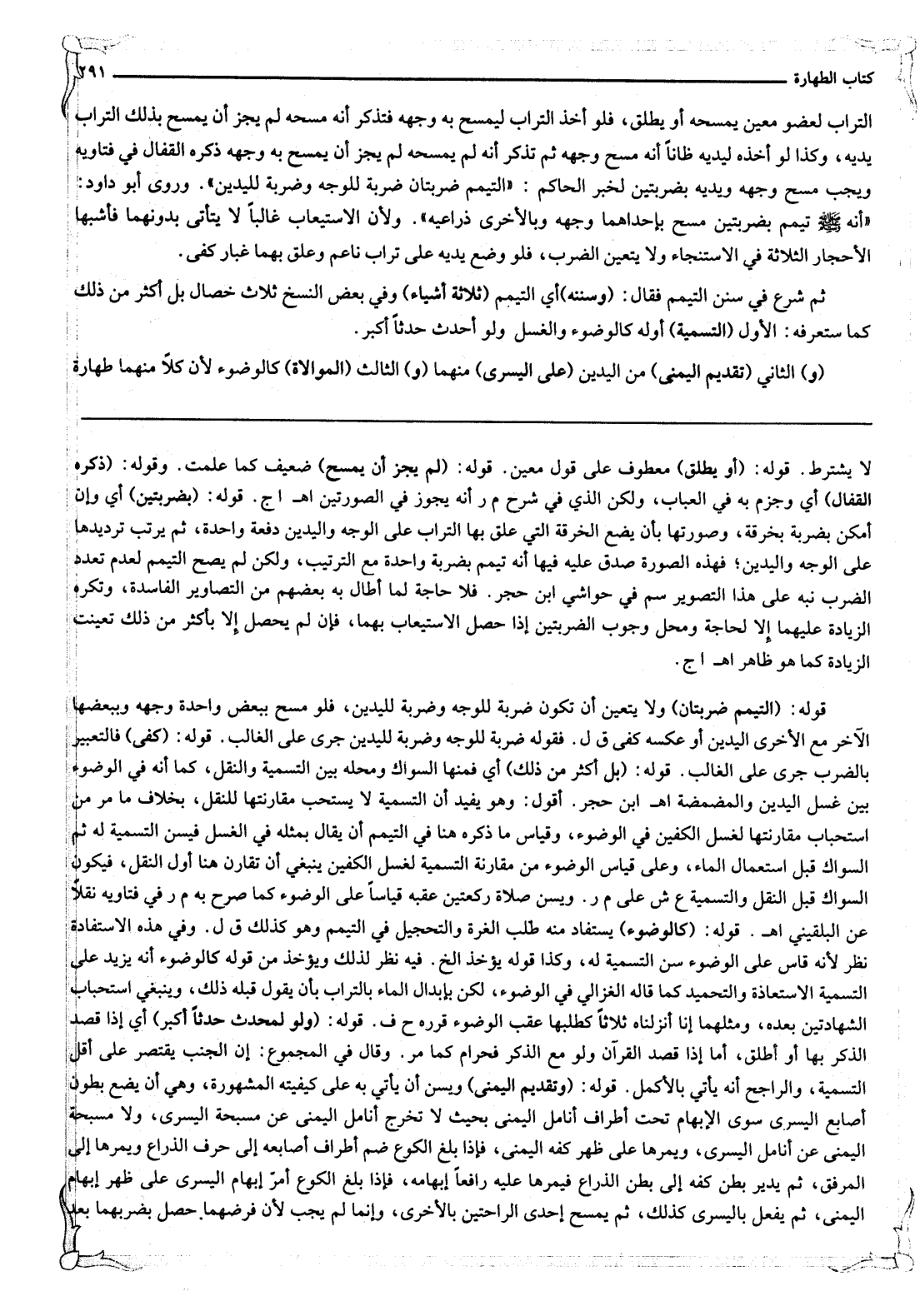 قَوْلُهُ: (وَلَوْ لِمُحْدِثٍ حَدَثًا أَكْبَرَ) أَيْ إذَا قَصَدَ الذِّكْرَ بِهَا أَوْ أَطْلَقَ، أَمَّا إذَا قَصْدَ الْقُرْآنَ، وَلَوْ مَعَ الذِّكْرِ فَحَرَامٌ كَمَا مَرَّ. وَقَالَ فِي الْمَجْمُوعِ: إنَّ الْجُنُبَ يَقْتَصِرُ عَلَى أَقَلِّ التَّسْمِيَةِ، وَالرَّاجِحُ أَنَّهُ يَأْتِي الْأَكْمَلَ. قَوْلُهُ: (وَتَقْدِيمُ الْيُمْنَى) وَيُسَنُّ أَنْ يَأْتِيَ بِهِ عَلَى كَيْفِيَّتِهِ الْمَشْهُورَةِ، وَهِيَ أَنْ يَضَعَ بُطُونَ أَصَابِعِ الْيُسْرَى سِوَى الْإِبْهَامِ تَحْتَ أَطْرَافِ أَنَامِلِ الْيُمْنَى بِحَيْثُ لَا تَخْرُجُ أَنَامِلُ الْيُمْنَى عَنْ مُسَبِّحَةِ الْيُسْرَى، وَلَا مُسَبِّحَةُ الْيُمْنَى عَنْ أَنَامِلِ الْيُسْرَى، وَيُمِرُّهَا عَلَى ظَهْرِ كَفِّهِ الْيُمْنَى، فَإِذَا بَلَغَ الْكُوعَ ضَمَّ أَطْرَافَ أَصَابِعِهِ إلَى حَرْفِ الذِّرَاعِ، وَيُمِرُّهَا إلَى الْمِرْفَقِ، ثُمَّ يُدِيرُ بَطْنَ كَفِّهِ إلَى بَطْنِ الذِّرَاعِ فَيُمِرُّهَا عَلَيْهِ رَافِعًا إبْهَامَهُ، فَإِذَا بَلَغَ الْكُوعَ أَمَرَّ إبْهَامَ الْيُسْرَى عَلَى ظَهْرِ إبْهَامِ الْيُمْنَى، ثُمَّ يَفْعَلُ بِالْيُسْرَى كَذَلِكَ، ثُمَّ يَمْسَحُ إحْدَى الرَّاحَتَيْنِ بِالْأُخْرَى، وَإِنَّمَا لَمْ يَجِبْ؛ لِأَنَّ فَرْضَهُمَا حَصَلَ بِضَرْبِهِمَا بَعْدَ
