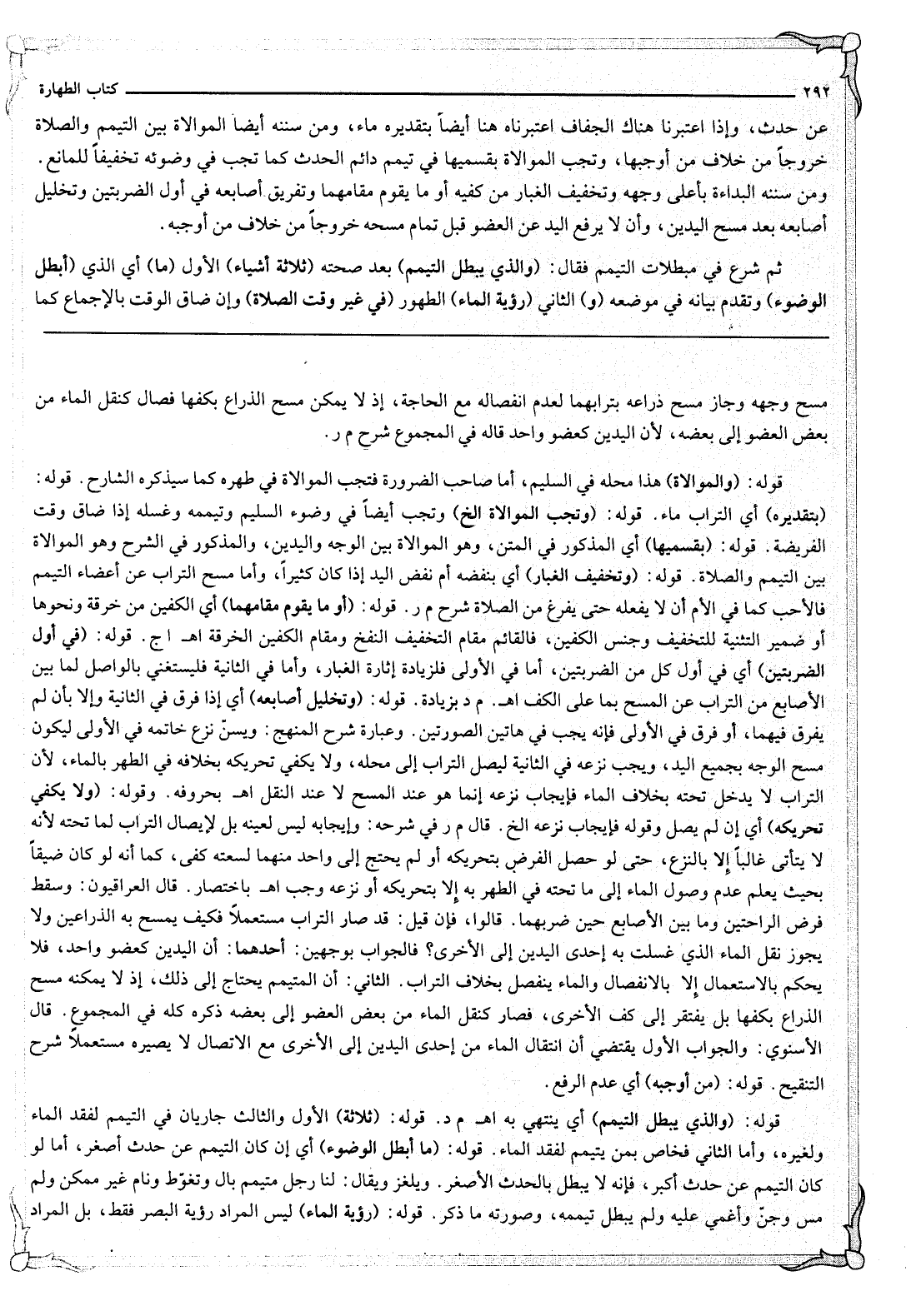 عَنْ حَدَثٍ، وَإِذَا اعْتَبَرْنَا هُنَاكَ الْجَفَافَ اعْتَبَرْنَاهُ هُنَا أَيْضًا بِتَقْدِيرِهِ مَاءً، وَمِنْ سُنَنِهِ أَيْضًا الْمُوَالَاةُ بَيْنَ التَّيَمُّمِ وَالصَّلَاةِ خُرُوجًا مِنْ خِلَافِ مَنْ أَوْجَبَهَا، وَتَجِبُ الْمُوَالَاةُ بِقِسْمَيْهَا فِي تَيَمُّمٍ دَائِمِ الْحَدَثِ كَمَا تَجِبُ فِي وُضُوئِهِ تَخْفِيفًا لِلْمَانِعِ. وَمِنْ سُنَنِهِ الْبُدَاءَةُ بِأَعْلَى وَجْهِهِ، وَتَخْفِيفُ الْغُبَارِ مِنْ كَفَّيْهِ أَوْ مَا يَقُومُ مَقَامَهُمَا، وَتَفْرِيقُ أَصَابِعِهِ فِي أَوَّلِ الضَّرْبَتَيْنِ، وَتَخْلِيلُ أَصَابِعِهِ بَعْدَ مَسْحِ الْيَدَيْنِ، وَأَنْ لَا يَرْفَعَ الْيَدَ عَنْ الْعُضْوِ قَبْلَ تَمَامِ مَسْحِهِ خُرُوجًا مِنْ خِلَافِ مَنْ أَوْجَبَهُ.