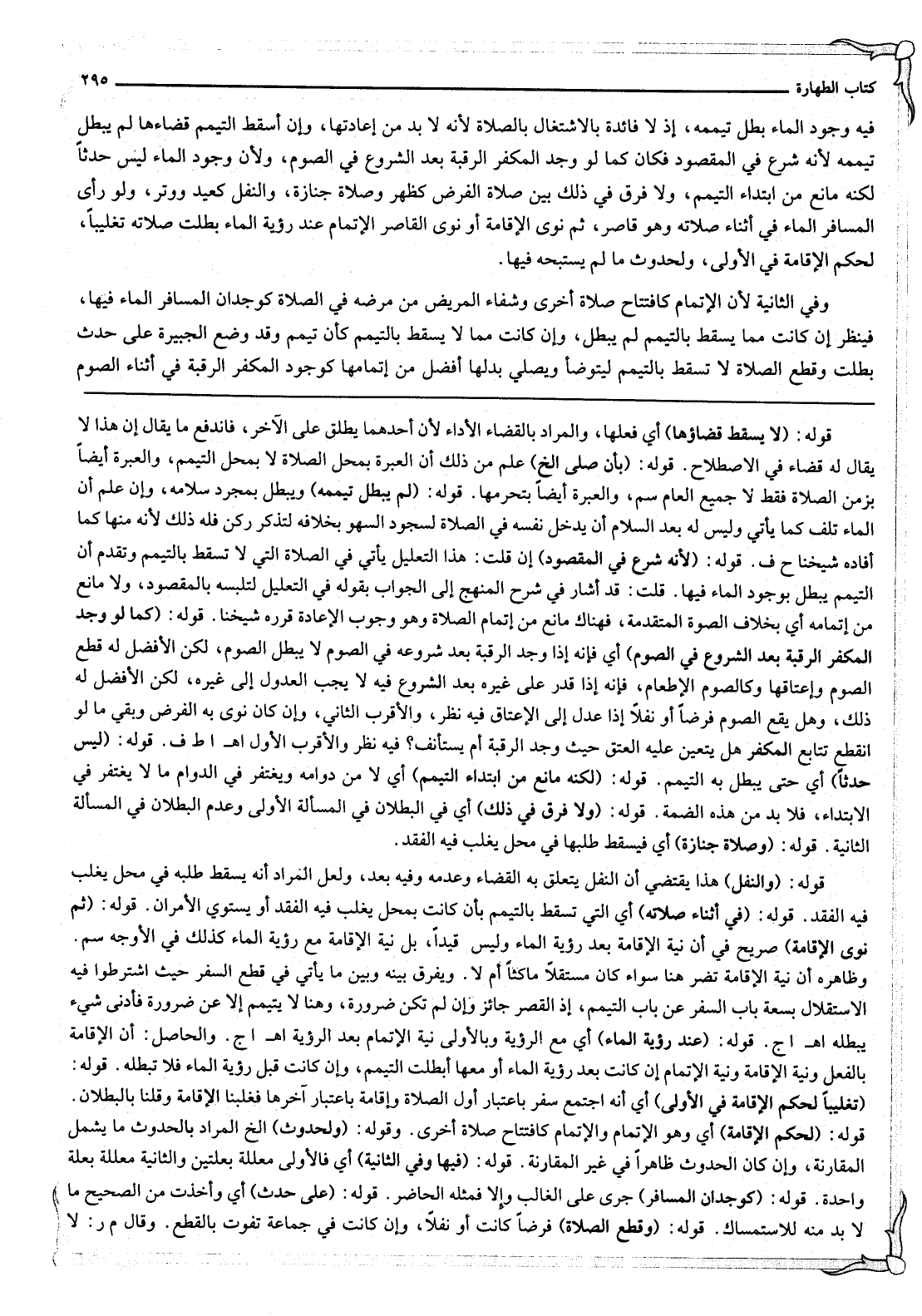 وَلَوْ رَأَى الْمُسَافِرُ الْمَاءَ فِي أَثْنَاءِ صَلَاتِهِ وَهُوَ قَاصِرٌ، ثُمَّ نَوَى الْإِقَامَةَ أَوْ نَوَى الْقَاصِرُ الْإِتْمَامَ عِنْدَ رُؤْيَةِ الْمَاءِ بَطَلَتْ صَلَاتُهُ تَغْلِيبًا، لِحُكْمِ الْإِقَامَةِ فِي الْأُولَى، وَلِحُدُوثِ مَا لَمْ يَسْتَبِحْهُ فِيهَا. وَفِي الثَّانِيَةِ؛ لِأَنَّ الْإِتْمَامَ كَافْتِتَاحِ صَلَاةٍ أُخْرَى، وَشِفَاءُ الْمَرِيضِ مِنْ مَرَضِهِ فِي الصَّلَاةِ كَوِجْدَانِ الْمُسَافِرِ الْمَاءَ فِيهَا، فَيُنْظَرُ إنْ كَانَتْ مِمَّا يَسْقُطُ بِالتَّيَمُّمِ لَمْ يَبْطُلْ، وَإِنْ كَانَتْ مِمَّا لَا يَسْقُطُ بِالتَّيَمُّمِ كَأَنْ تَيَمَّمَ، وَقَدْ وَضَعَ الْجَبِيرَةَ عَلَى حَدَثٍ بَطَلَتْ وَقَطَعَ الصَّلَاةَ لَا تَسْقُطُ بِالتَّيَمُّمِ لِيَتَوَضَّأَ وَيُصَلِّيَ بَدَلَهَا أَفْضَلَ مِنْ إتْمَامِهَا كَوُجُودِ الْمُكَفِّرِ الرَّقَبَةَ فِي أَثْنَاءِ الصَّوْمِ