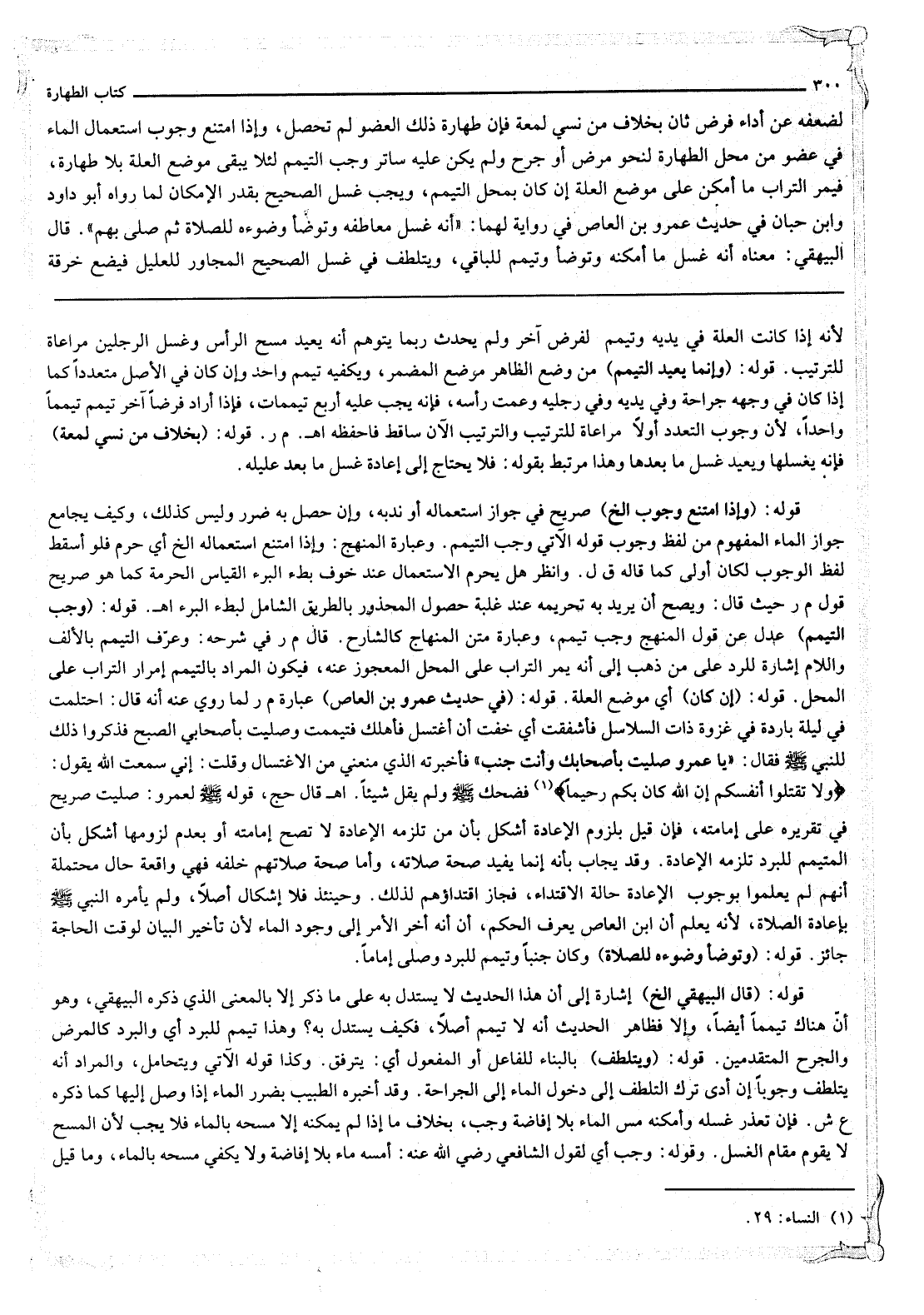 قَوْلُهُ: (قَالَ الْبَيْهَقِيُّ إلَخْ) إشَارَةٌ إلَى أَنَّ هَذَا الْحَدِيثَ لَا يُسْتَدَلُّ بِهِ عَلَى مَا ذُكِرَ إلَّا بِالْمَعْنَى الَّذِي ذَكَرَهُ الْبَيْهَقِيُّ، وَهُوَ أَنَّ هُنَاكَ تَيَمُّمًا أَيْضًا، وَإِلَّا فَظَاهِرُ الْحَدِيثِ أَنَّهُ لَا تَيَمُّمَ أَصْلًا، فَكَيْفَ يُسْتَدَلُّ بِهِ؟ وَهَذَا تَيَمُّمٌ لِلْبَرْدِ أَيْ وَالْبَرْدُ كَالْمَرَضِ وَالْجُرْحِ الْمُتَقَدِّمَيْنِ. قَوْلُهُ: (وَيَتَلَطَّفُ) بِالْبِنَاءِ لِلْفَاعِلِ أَوْ الْمَفْعُولُ أَيْ يَتَرَفَّقُ. وَكَذَا قَوْلُهُ الْآتِي وَيَتَحَامَلُ، وَالْمُرَادُ أَنَّهُ يَتَلَطَّفُ وُجُوبًا إنْ أَدَّى تَرْكُ التَّلَطُّفِ إلَى دُخُولِ الْمَاءِ إلَى الْجِرَاحَةِ. وَقَدْ أَخْبَرَهُ الطَّبِيبُ بِضَرَرِ الْمَاءِ إذَا وَصَلَ إلَيْهَا كَمَا ذَكَرَهُ ع ش. فَإِنْ تَعَذَّرَ غَسْلُهُ، وَأَمْكَنَهُ مَسُّ الْمَاءِ بِلَا إفَاضَةٍ وَجَبَ، بِخِلَافِ مَا إذَا لَمْ يُمْكِنْهُ إلَّا مَسْحُهُ بِالْمَاءِ فَلَا يَجِبُ لِأَنَّ الْمَسْحَ لَا يَقُومُ مَقَامَ الْغَسْلِ. وَقَوْلُهُ: وَجَبَ أَيْ لِقَوْلِ الشَّافِعِيِّ - رَضِيَ اللَّهُ عَنْهُ -: أَمِسُّهُ مَاءً بِلَا إفَاضَةٍ وَلَا يَكْفِي مَسْحُهُ بِالْمَاءِ، وَمَا قِيلَ