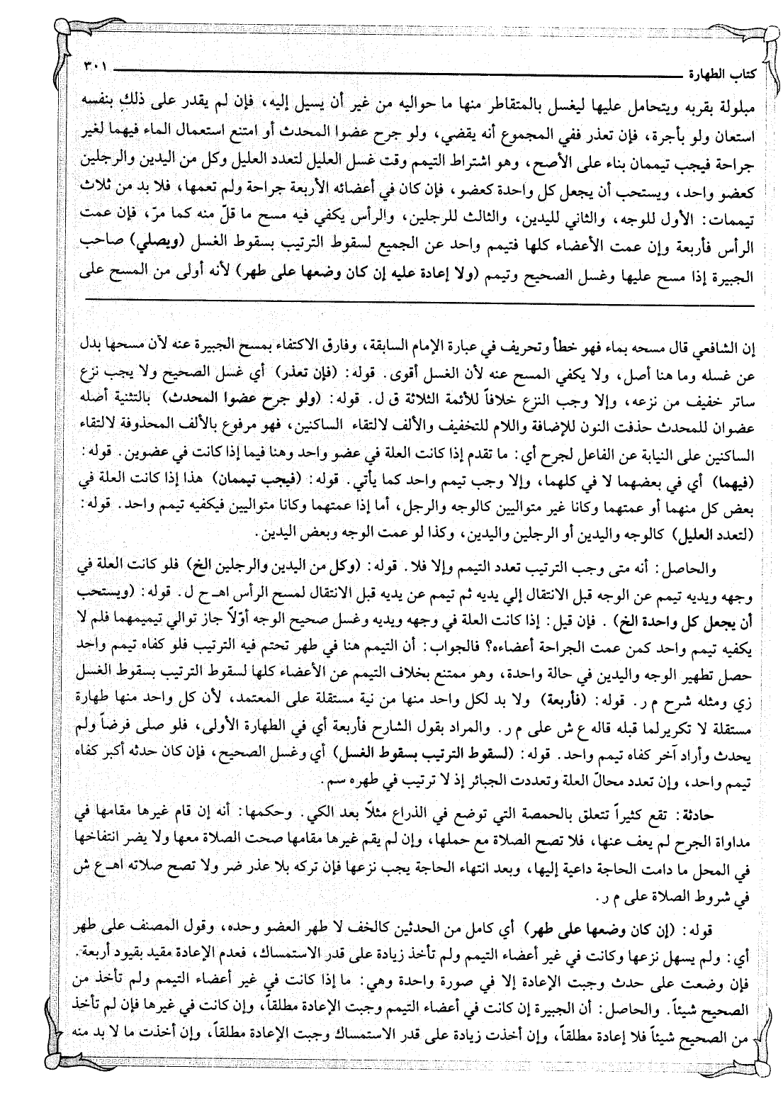 وَلَوْ جُرِحَ عُضْوَا الْمُحْدِثِ أَوْ امْتَنَعَ اسْتِعْمَالُ الْمَاءِ فِيهِمَا لِغَيْرِ جِرَاحَةٍ فَيَجِبُ تَيَمُّمَانِ بِنَاءً عَلَى الْأَصَحِّ، وَهُوَ اشْتِرَاطُ التَّيَمُّمِ وَقْتَ غَسْلِ الْعَلِيلِ لِتَعَدُّدِ الْعَلِيلِ، وَكُلٌّ مِنْ الْيَدَيْنِ وَالرِّجْلَيْنِ كَعُضْوٍ وَاحِدٍ، وَيُسْتَحَبُّ أَنْ يَجْعَلَ كُلَّ وَاحِدَةٍ كَعُضْوٍ، فَإِنْ كَانَ فِي أَعْضَائِهِ الْأَرْبَعَةِ جِرَاحَةٌ، وَلَمْ تَعُمَّهَا، فَلَا بُدَّ مِنْ ثَلَاثِ تَيَمُّمَاتٍ: الْأَوَّلُ لِلْوَجْهِ، وَالثَّانِي لِلْيَدَيْنِ، وَالثَّالِثُ لِلرِّجْلَيْنِ، وَالرَّأْسُ يَكْفِي فِيهِ مَسْحُ مَا قَلَّ مِنْهُ كَمَا مَرَّ، فَإِنْ عَمَّتْ الرَّأْسَ فَأَرْبَعَةٌ وَإِنْ عَمَّتْ الْأَعْضَاءَ كُلَّهَا فَتَيَمُّمٌ وَاحِدٌ عَنْ الْجَمِيعِ لِسُقُوطِ التَّرْتِيبِ بِسُقُوطِ الْغُسْلِ