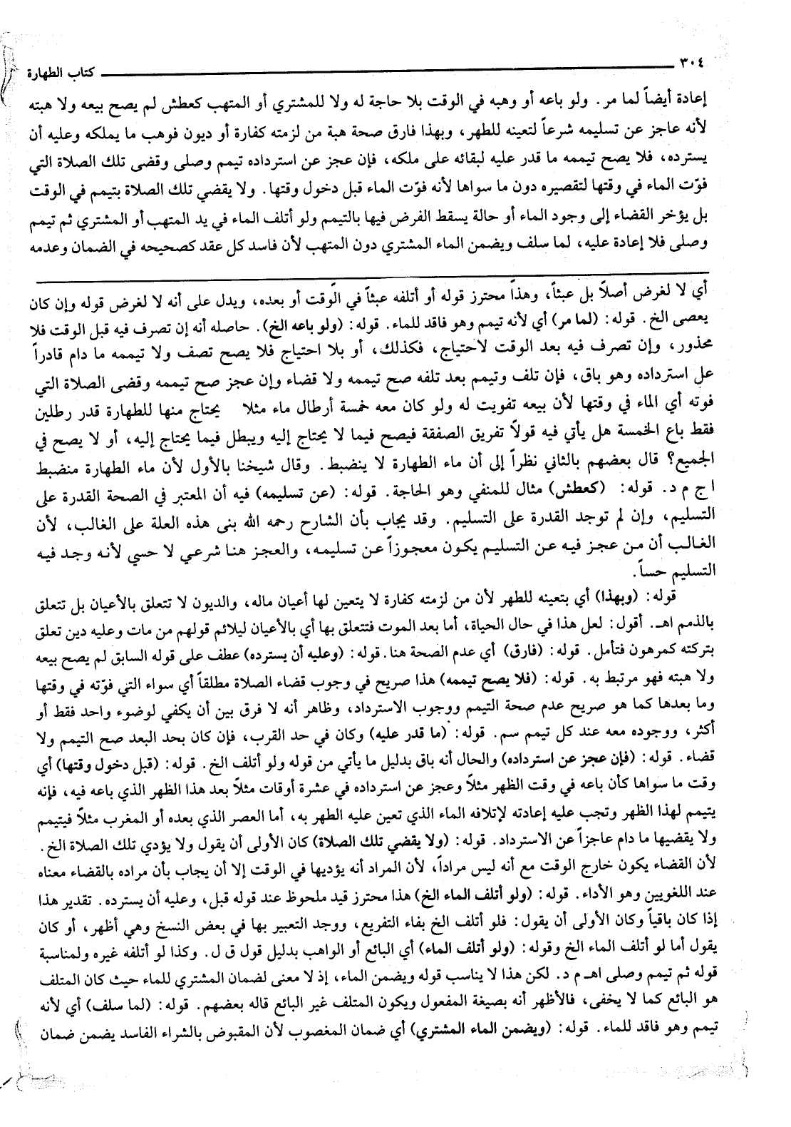 قَوْلُهُ: (وَلَوْ بَاعَهُ إلَخْ) . حَاصِلُهُ أَنَّهُ إنْ تَصَرَّفَ فِيهِ قَبْلَ الْوَقْتِ فَلَا مَحْذُورَ، وَإِنْ تَصَرَّفَ فِيهِ بَعْدَ الْوَقْتِ لِاحْتِيَاجٍ، فَكَذَلِكَ، أَوْ بِلَا احْتِيَاجٍ فَلَا يَصِحُّ تَصَرُّفُهُ وَلَا تَيَمُّمُهُ مَا دَامَ قَادِرًا عَلَى اسْتِرْدَادِهِ وَهُوَ بَاقٍ، فَإِنْ تَلِفَ وَتَيَمَّمَ بَعْدَ تَلَفِهِ صَحَّ تَيَمُّمُهُ وَلَا قَضَاءَ، وَإِنْ عَجَزَ صَحَّ تَيَمُّمُهُ وَقَضَى الصَّلَاةَ الَّتِي فَوَّتَهُ أَيْ الْمَاءَ فِي وَقْتِهَا؛ لِأَنَّ بَيْعَهُ تَفْوِيتٌ لَهُ وَلَوْ كَانَ مَعَهُ خَمْسَةُ أَرْطَالٍ مَاءٍ مَثَلًا يَحْتَاجُ مِنْهَا لِلطَّهَارَةِ قَدْرَ رِطْلَيْنِ فَقَطْ بَاعَ الْخَمْسَةَ هَلْ يَأْتِي فِيهِ قَوْلًا تَفْرِيقُ الصَّفْقَةِ فَيَصِحُّ فِيمَا لَا يَحْتَاجُ إلَيْهِ وَيَبْطُلُ فِيمَا يَحْتَاجُ إلَيْهِ، أَوْ لَا يَصِحُّ فِي الْجَمِيعِ؟ قَالَ بَعْضُهُمْ بِالثَّانِي نَظَرًا إلَى أَنَّ مَاءَ الطَّهَارَةِ لَا يَنْضَبِطُ. وَقَالَ شَيْخُنَا بِالْأَوَّلِ لِأَنَّ مَاءَ الطَّهَارَةِ مُنْضَبِطٌ اج م د.