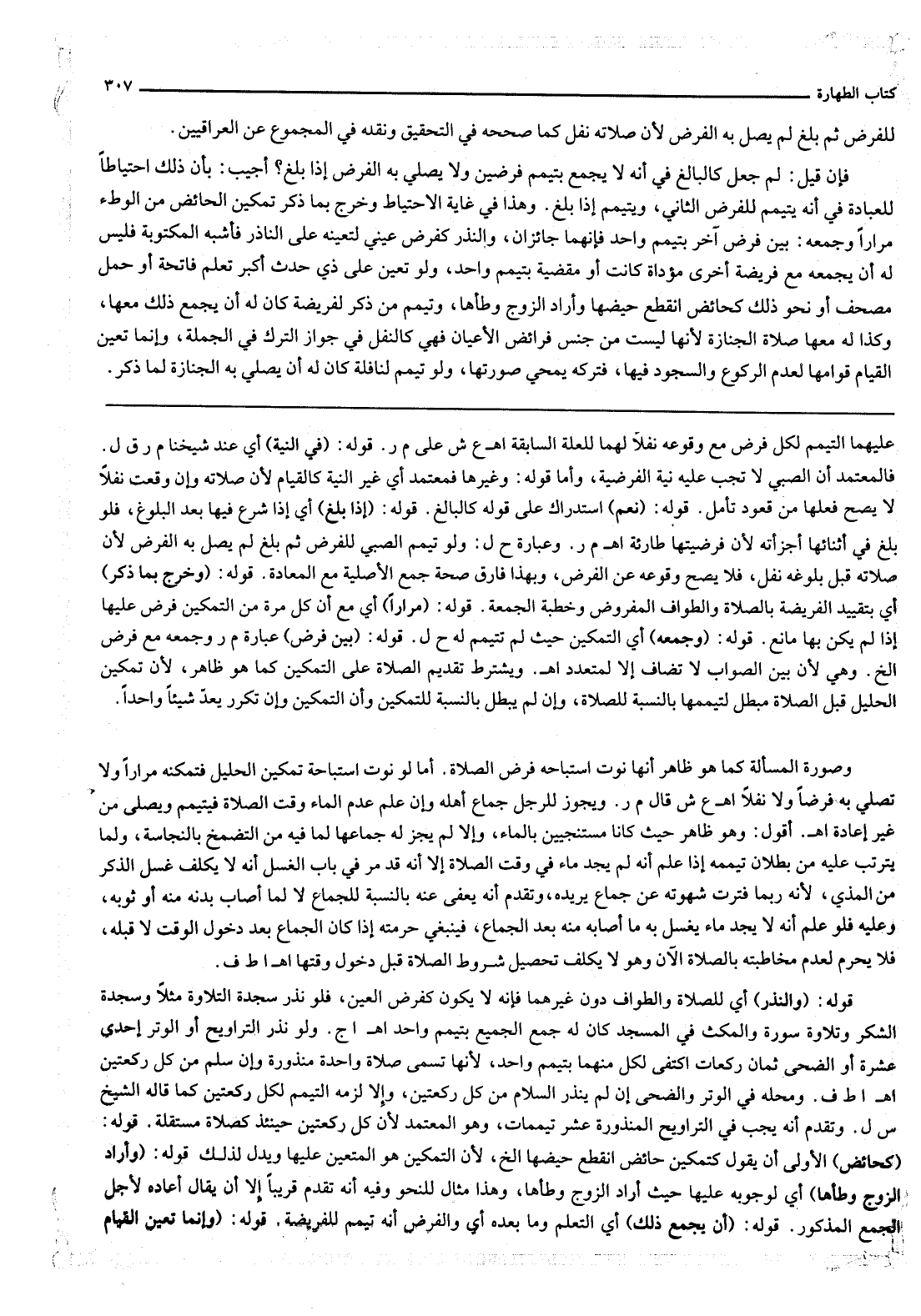 لِلْفَرْضِ ثُمَّ بَلَغَ لَمْ يَصِلْ بِهِ الْفَرْضُ لِأَنَّ صَلَاتَهُ نَفْلٌ كَمَا صَحَّحَهُ فِي التَّحْقِيقِ وَنَقَلَهُ فِي الْمَجْمُوعِ عَنْ الْعِرَاقِيِّينَ. فَإِنْ قِيلَ: لِمَ جُعِلَ كَالْبَالِغِ فِي أَنَّهُ لَا يَجْمَعُ بِتَيَمُّمٍ فَرْضَيْنِ، وَلَا يُصَلِّي بِهِ الْفَرْضَ إذَا بَلَغَ؟ أُجِيبَ: بِأَنَّ ذَلِكَ احْتِيَاطٌ لِلْعِبَادَةِ فِي أَنَّهُ يَتَيَمَّمُ لِلْفَرْضِ الثَّانِي، وَيَتَيَمَّمُ إذَا بَلَغَ. وَهَذَا فِي غَايَةِ الِاحْتِيَاطِ وَخَرَجَ بِمَا ذُكِرَ تَمْكِينُ الْحَائِضِ مِنْ الْوَطْءِ مِرَارًا وَجَمْعُهُ: بَيْنَ فَرْضٍ آخَرَ بِتَيَمُّمٍ وَاحِدٍ فَإِنَّهُمَا جَائِزَانِ، وَالنَّذْرُ كَفَرْضٍ عَيْنِيٍّ لِتَعَيُّنِهِ عَلَى النَّاذِرِ فَأَشْبَهَ الْمَكْتُوبَةَ فَلَيْسَ لَهُ أَنْ يَجْمَعَهُ مَعَ فَرِيضَةٍ أُخْرَى مُؤَدَّاةً كَانَتْ أَوْ مَقْضِيَّةً بِتَيَمُّمٍ وَاحِدٍ.